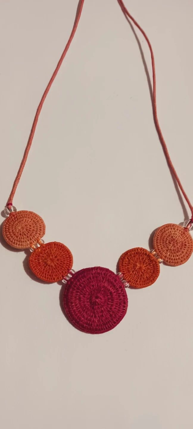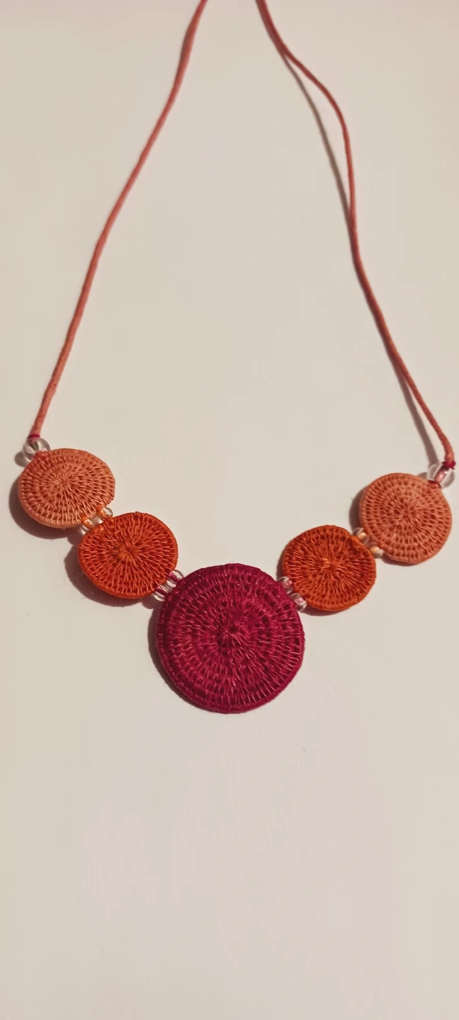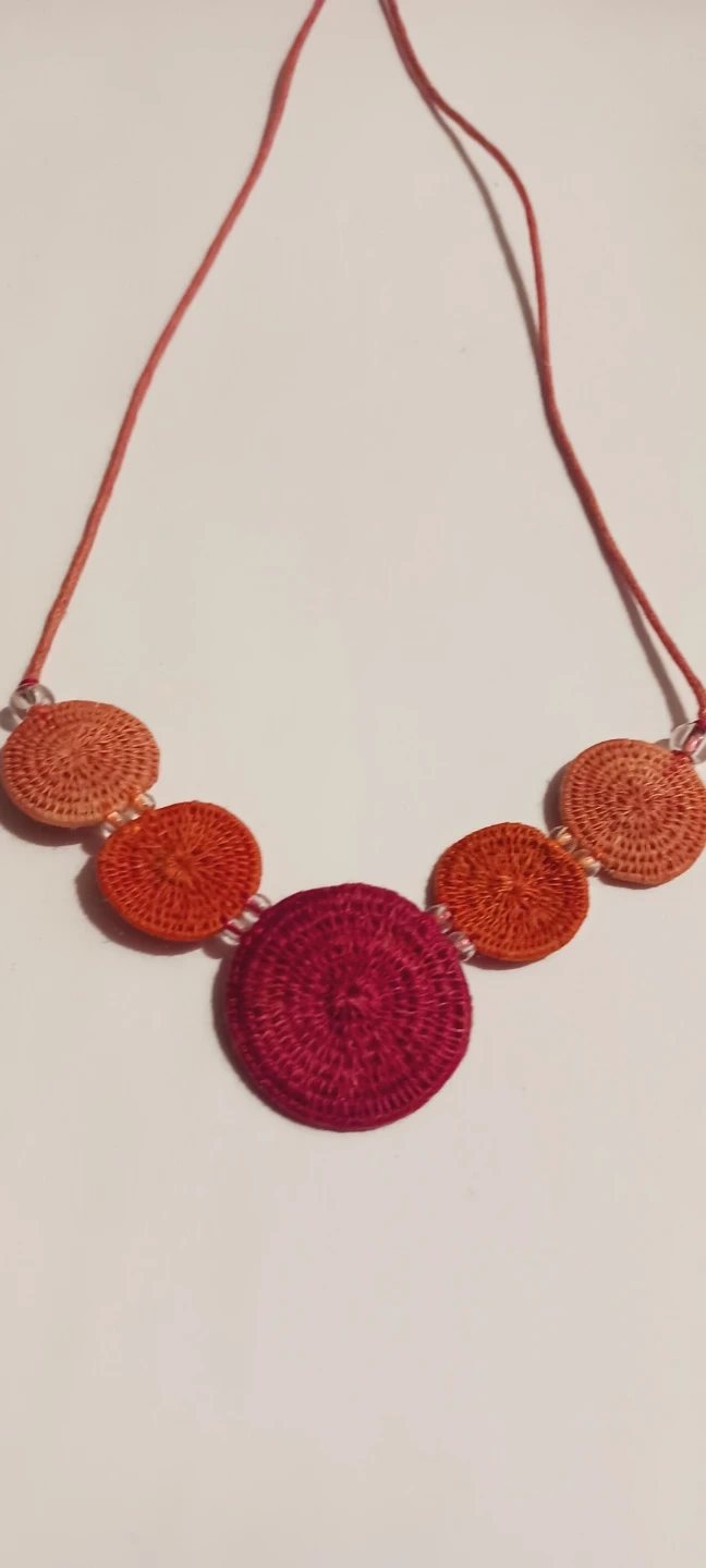 Gorgeous African One of a Kind Handmade hand crocheted necklace with a beaded accent. Features a central deep pink pendant surrounded by five orange and coral pendants on a coral cord. It's a unique statement piece!!! 18" long. Excellent condition.