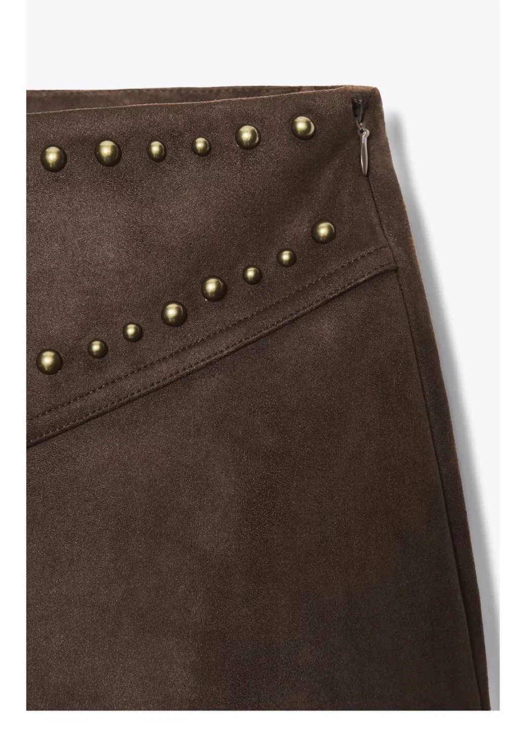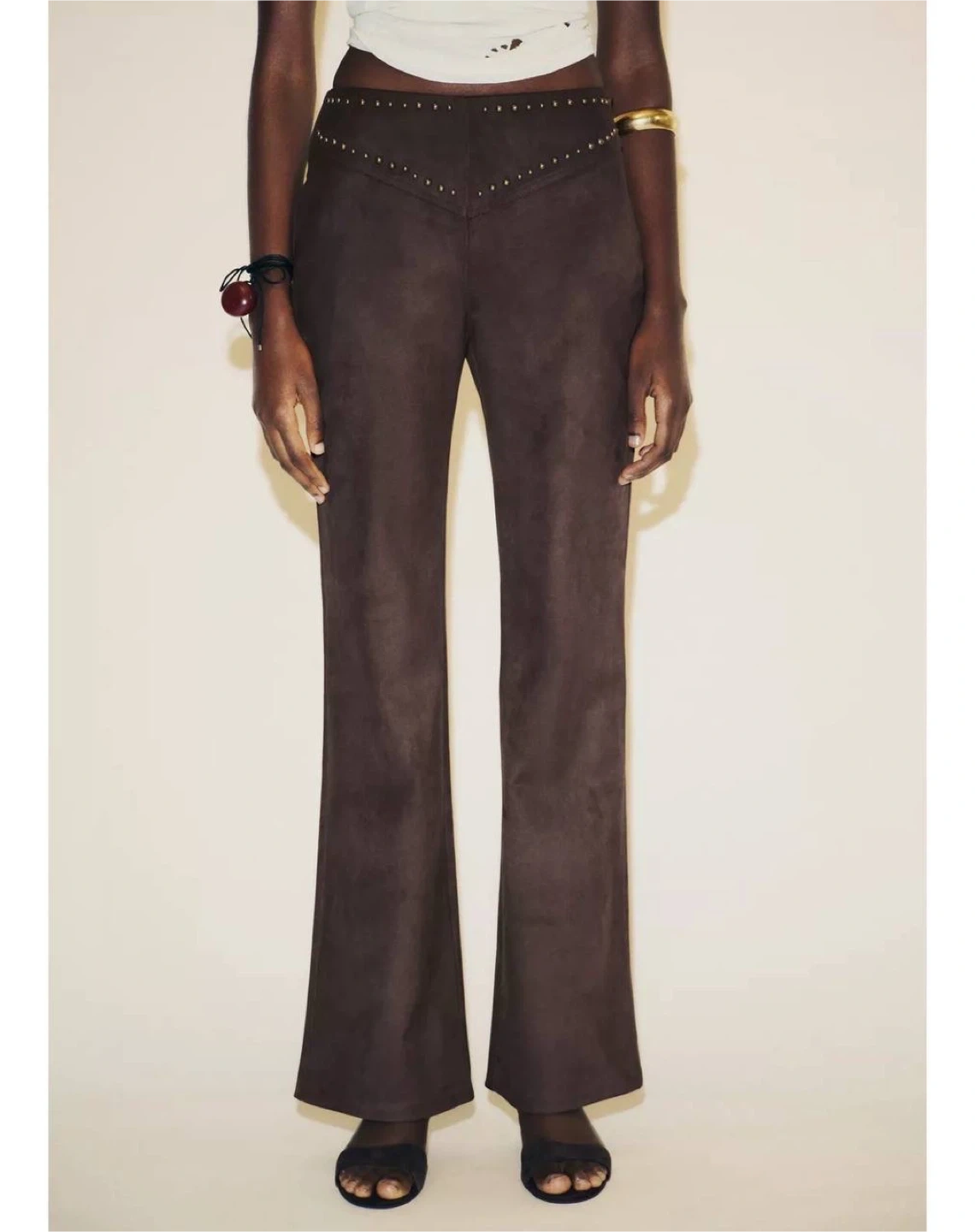 Stylish dark brown pants. Has cool studded details around the waist and a flared leg. Material is soft, feels like suede. Great for a boho or rock vibe.