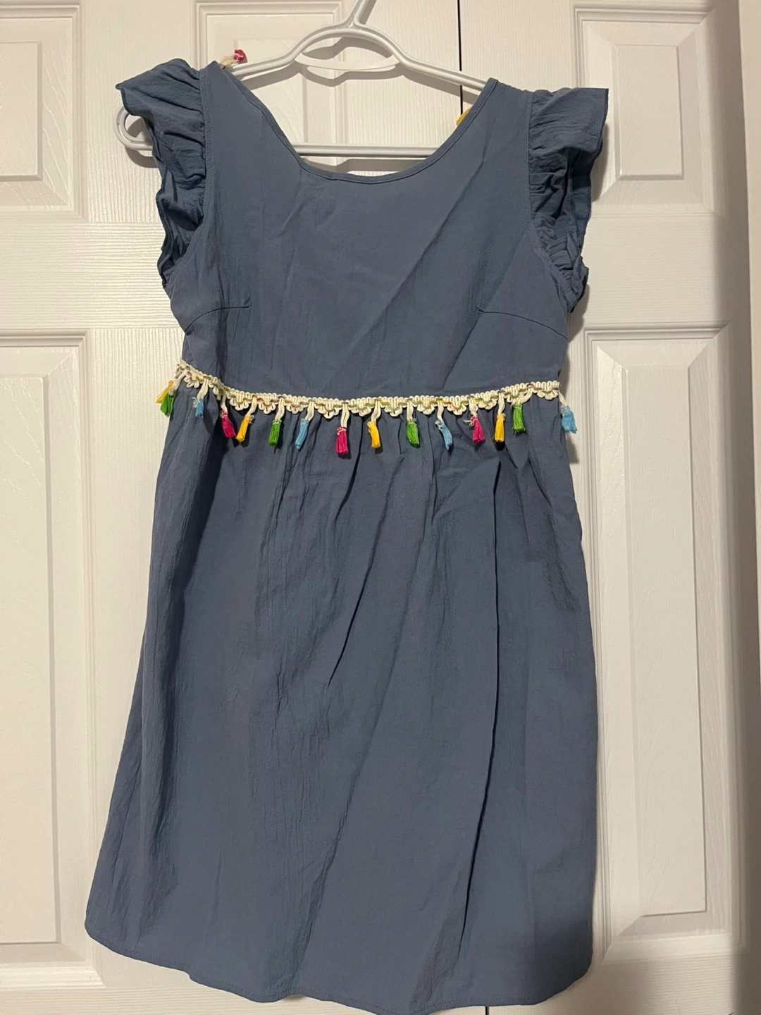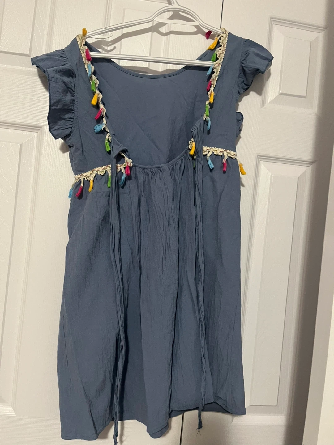 A blue short-sleeve dress with colourful tassels along the neckline and waist. It has a lightweight, crinkled fabric. The fit is relaxed with a tie at the waist for adjustability.