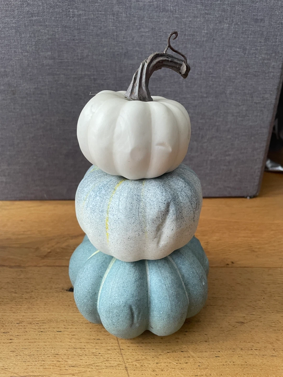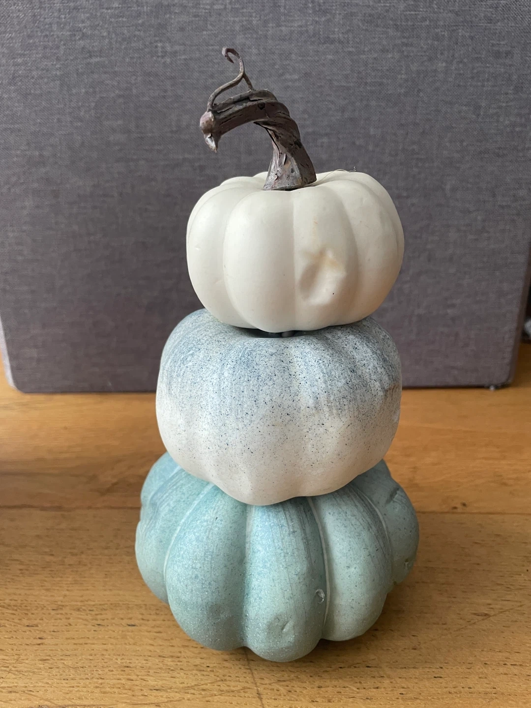 Here's a cute stacked pumpkin decoration! It features three pumpkins in white and blue hues. Perfect for adding a touch of fall to your home