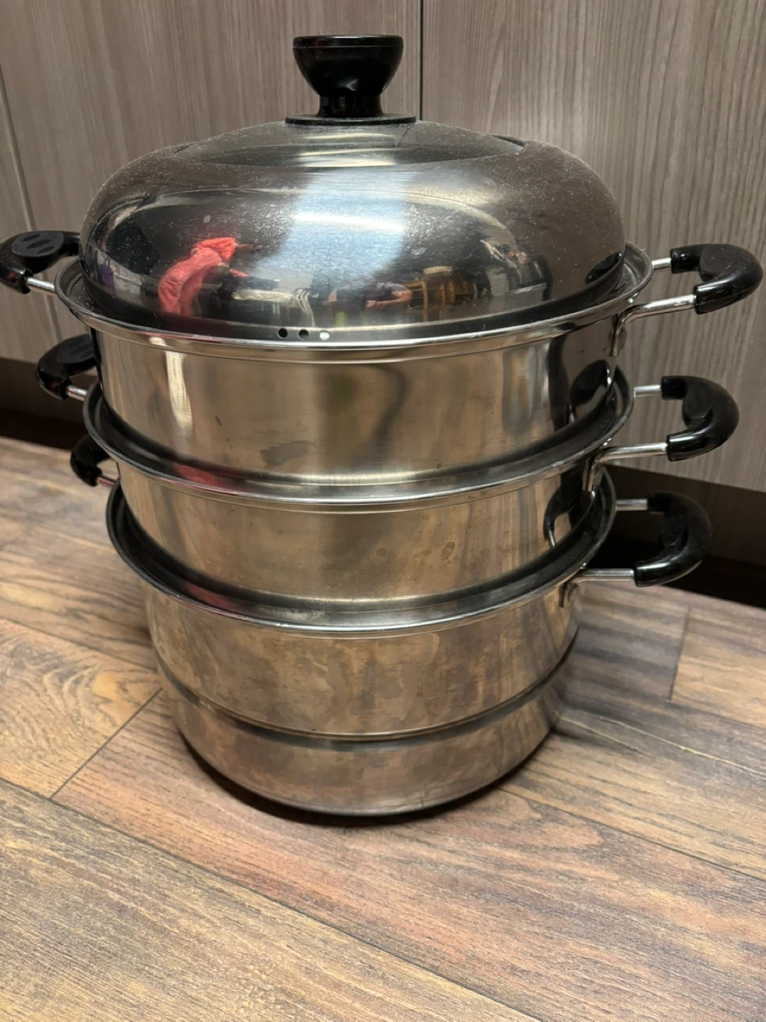 26Selling a stainless steel steamer pot in good condition. It's a great way to cook healthy meals! The steamer includes multiple tiers, allowing you to cook different foods simultaneously. It is made of durable stainless steel with black handles.