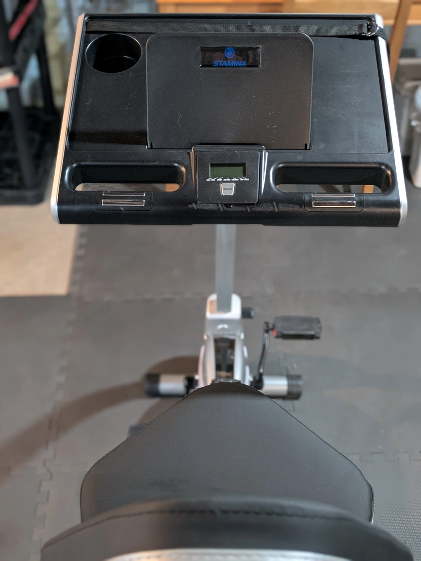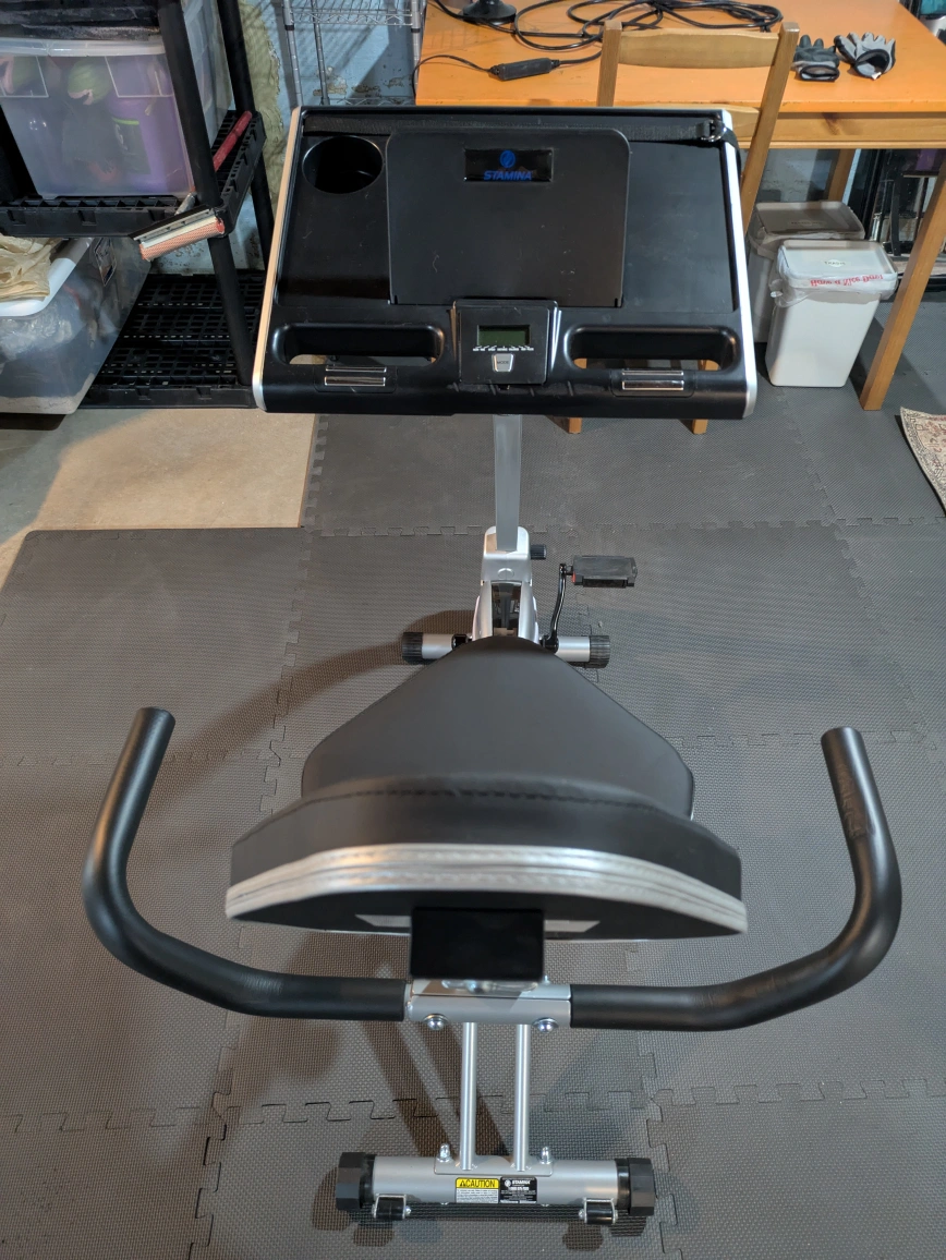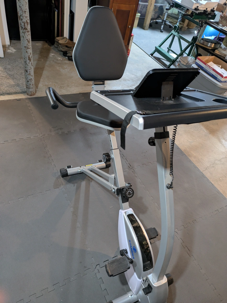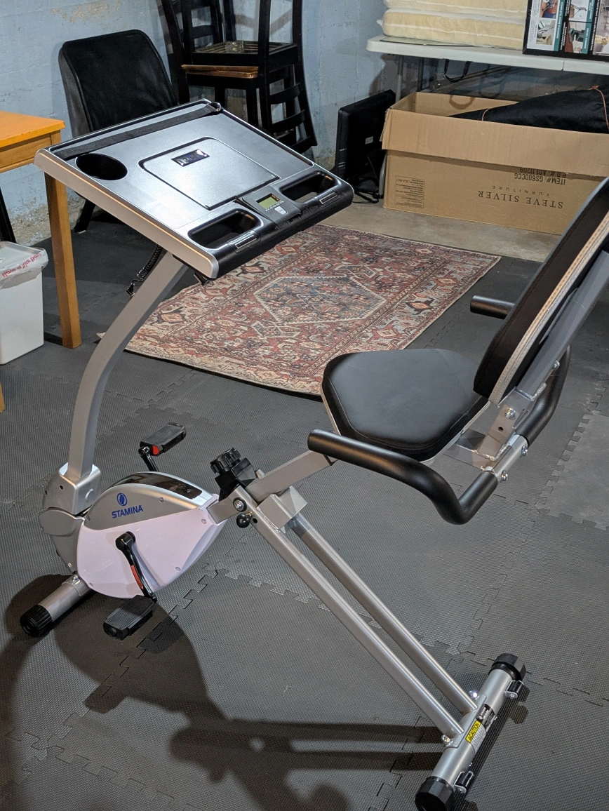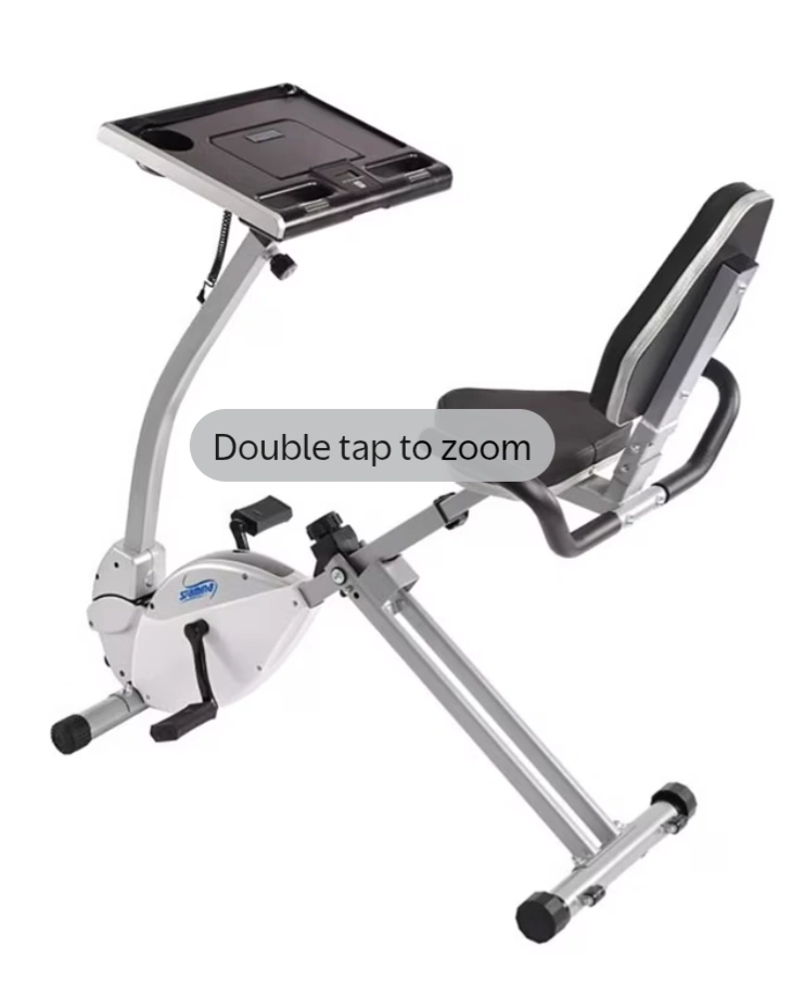Get your workout in while you work! This recumbent exercise bike features a built-in desk, so you can read, work, or watch your favorite shows while you pedal away. It's in great condition and ready for a new home. Note: The maximum weight capacity is 250 lbs on the seat and 30 lbs on the desktop. I can deliver within the 60618 zip code for an additional $10. manual included.