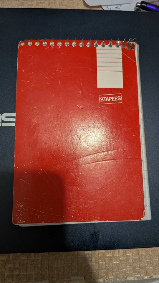 Giving away a red notebook from Staples! It's a handy little notebook for jotting down notes or ideas. It's in used condition, but still has plenty of blank pages ready to be filled!