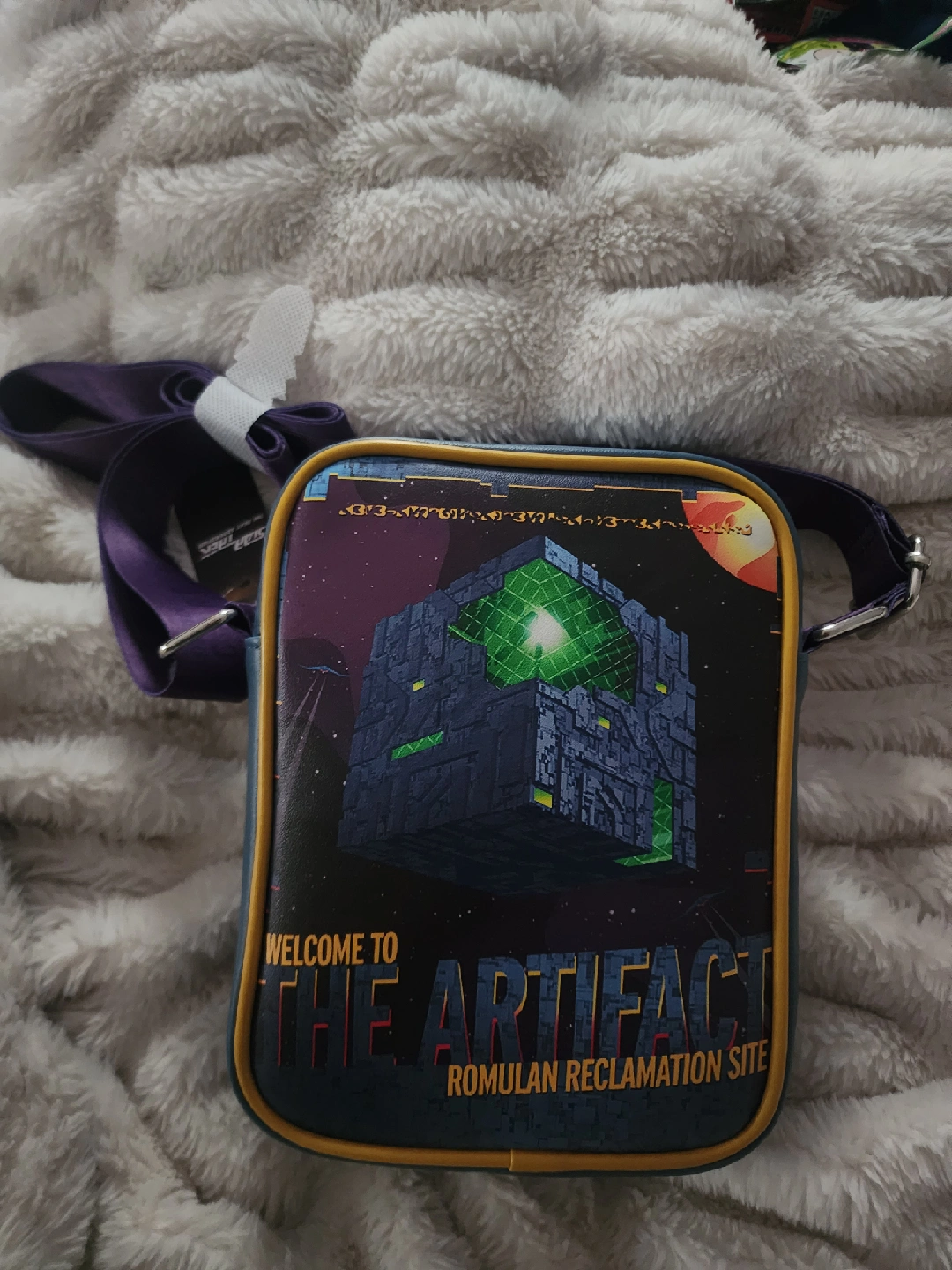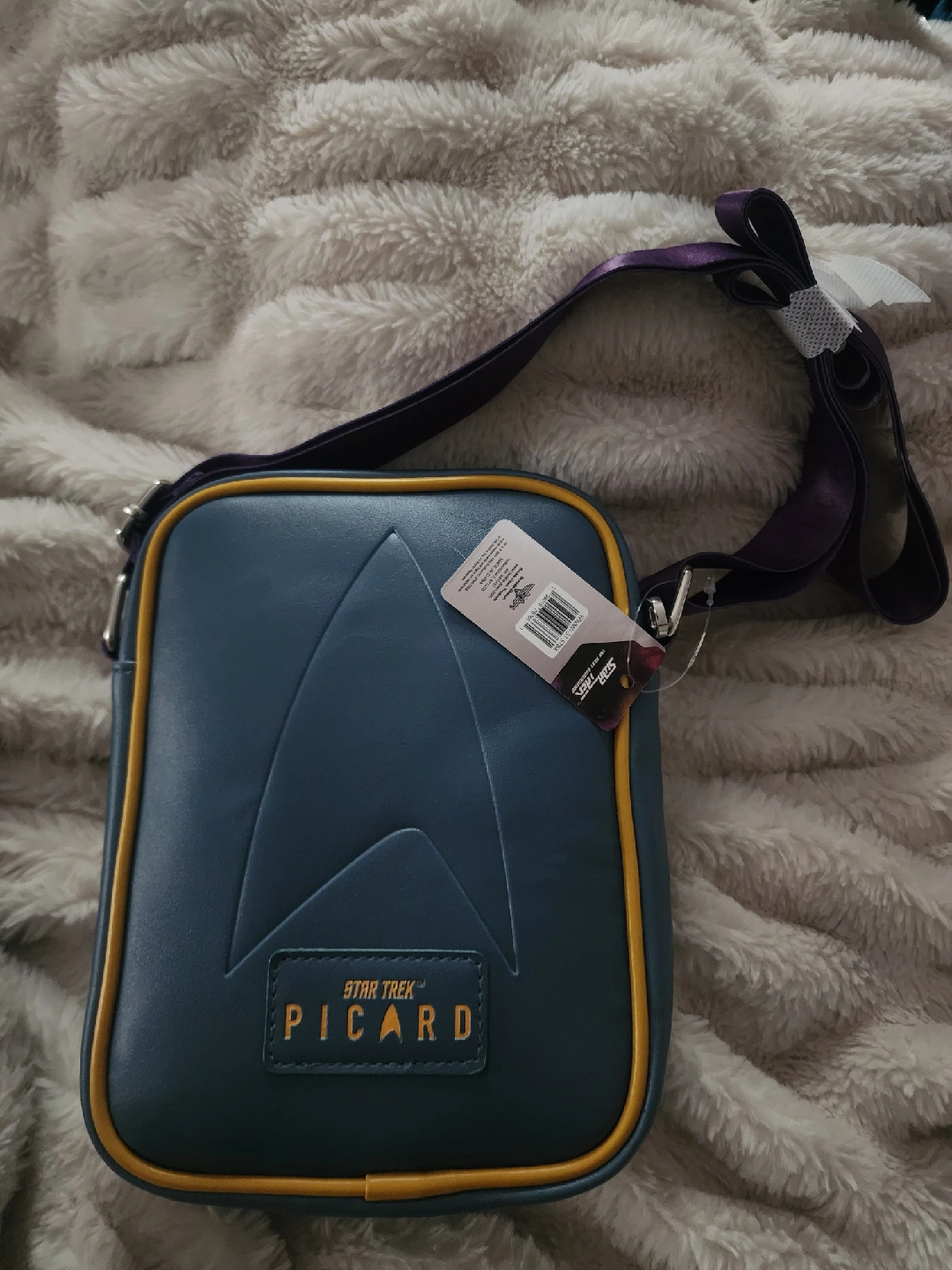 This is a Star Trek Picard Artifact crossbody bag. It features a blue front with the Star Trek insignia and the word "Picard", and the back has an image of the Artifact Romulan Reclamation Site. The bag has a purple strap and yellow trim. It's in great condition!