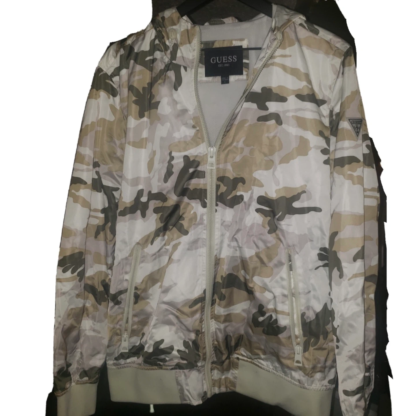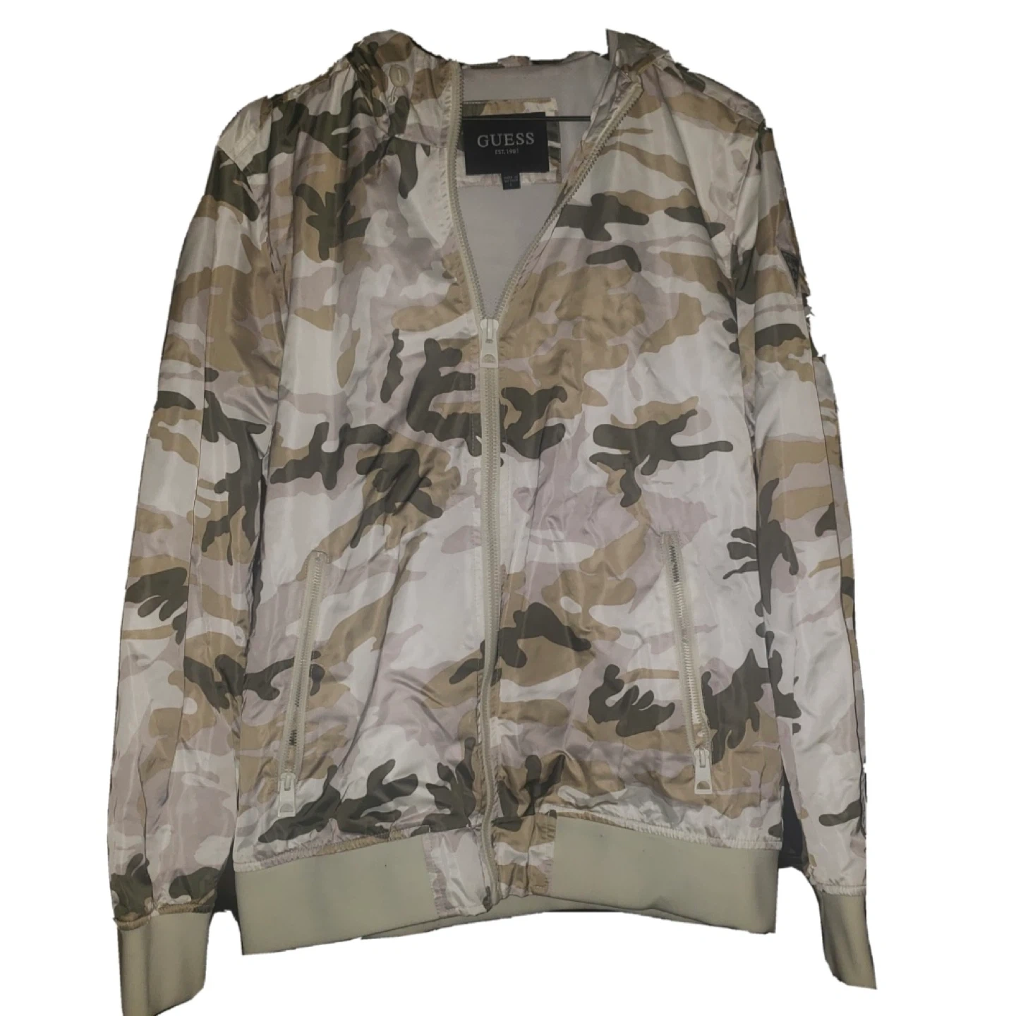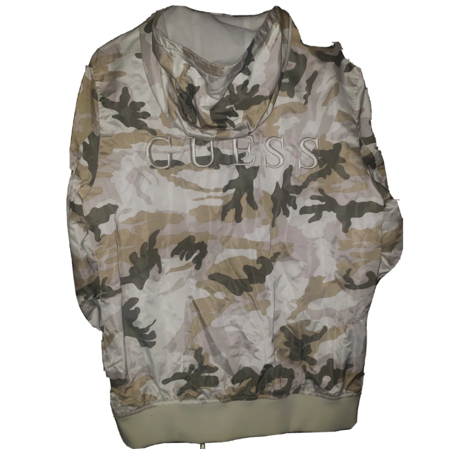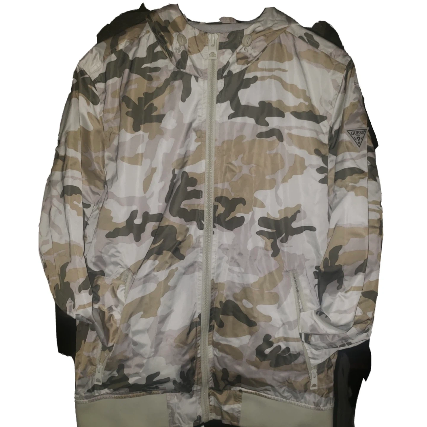 This is a Guess hooded windbreaker jacket with a camouflage pattern. It features a full zip closure and pockets. It's lightweight and breathable, perfect for outdoor activities.
