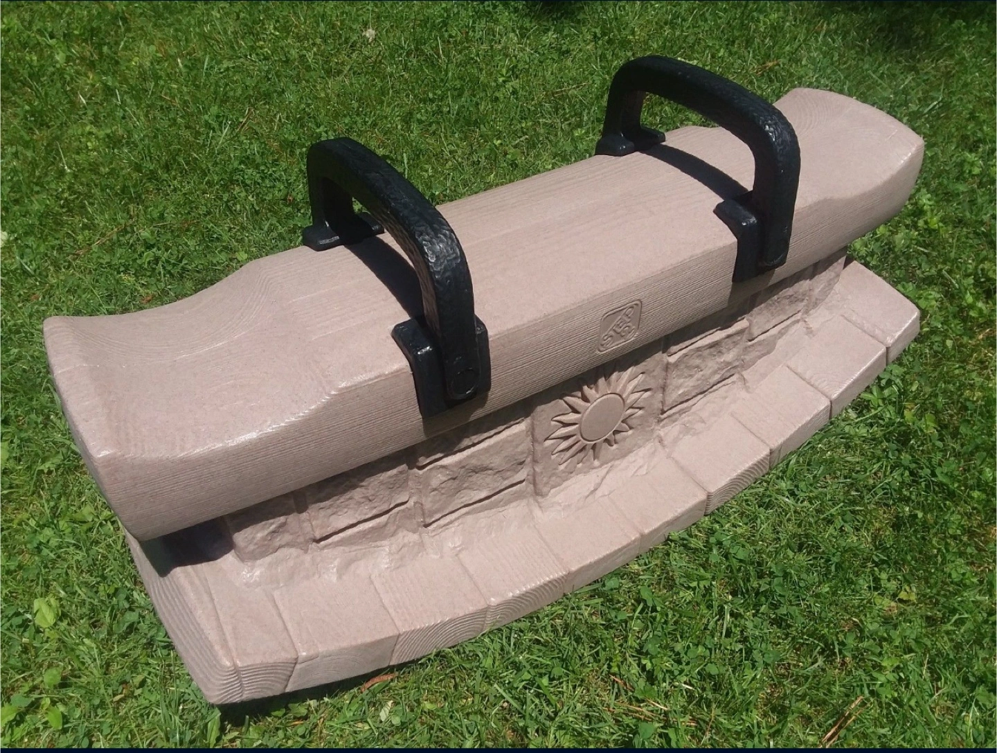Here is a Step2 Rocking Bridge! It has a tan color and is made of durable plastic. It also has black handles for easy gripping. It's perfect for outdoor fun!