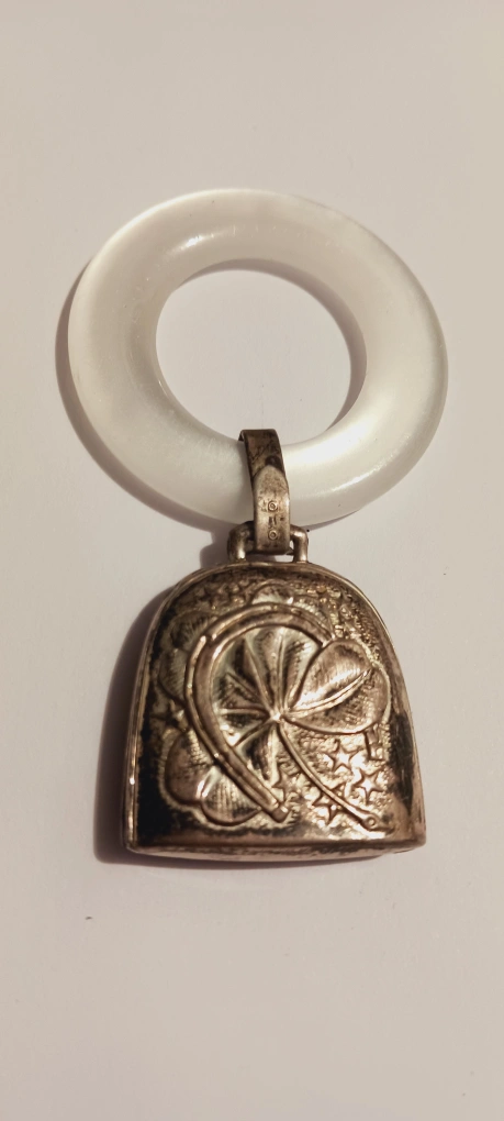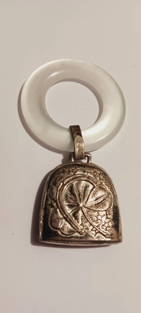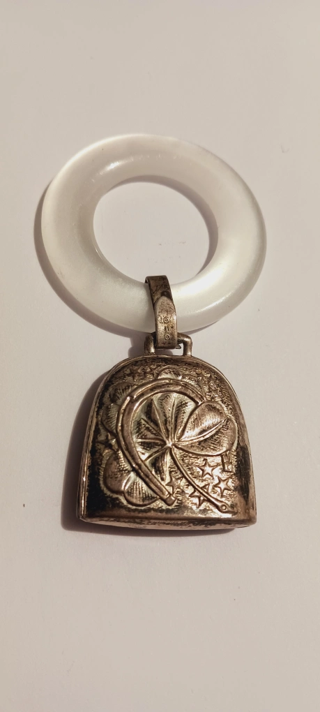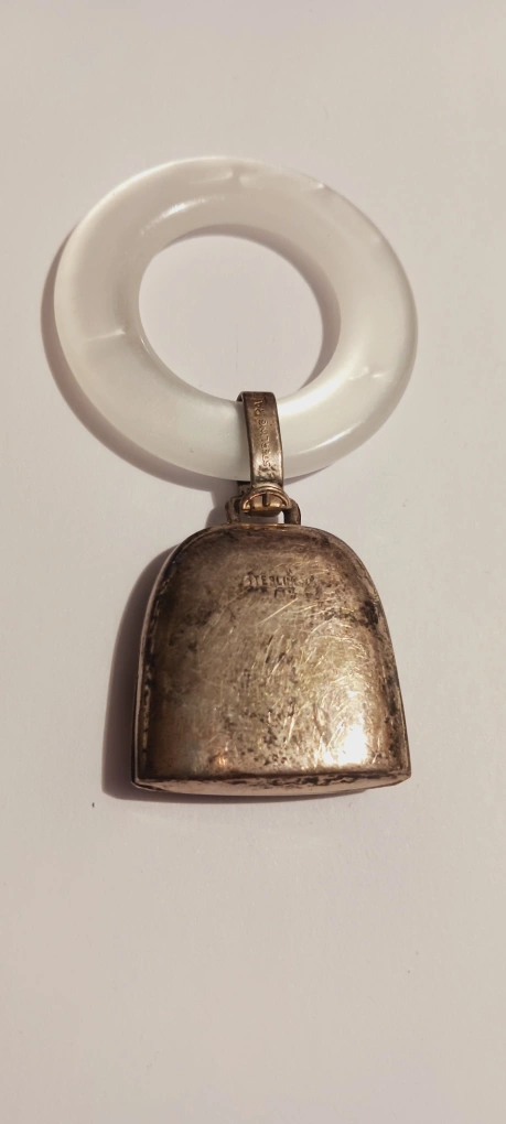 Sterling silver Raimond signed baby bell rattle. It has a mother of pearl ring and a sterling silver bell.