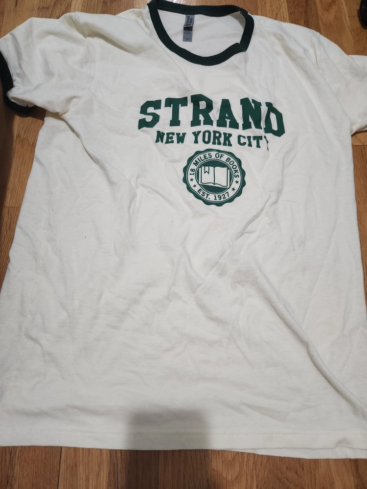Selling a white Strand New York City t-shirt. The shirt has green trim around the neck and sleeves, and the Strand logo is printed in green on the front. It's in new condition!