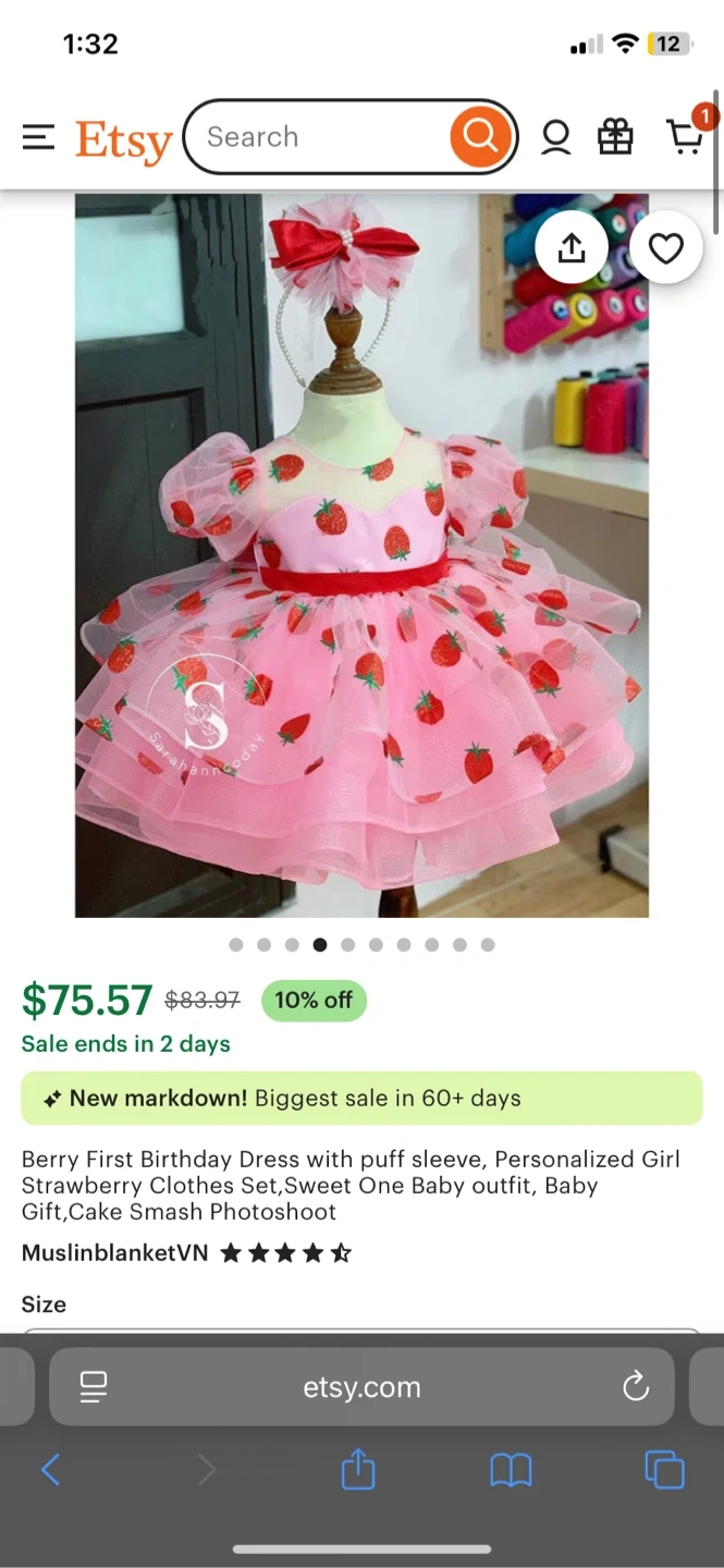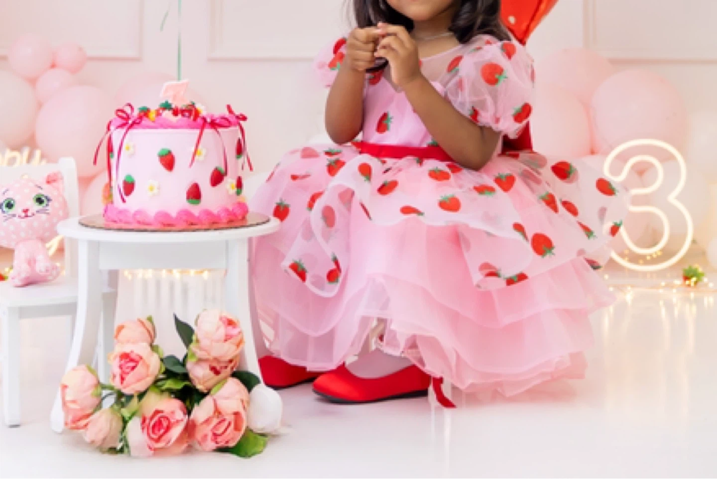 Selling a cute strawberry-themed birthday dress with puff sleeves! It's perfect for a little one's special day or a cake smash photoshoot. The dress features a delightful strawberry pattern and a fluffy, layered skirt. It's a personalized girl strawberry clothes set and a sweet one baby outfit!