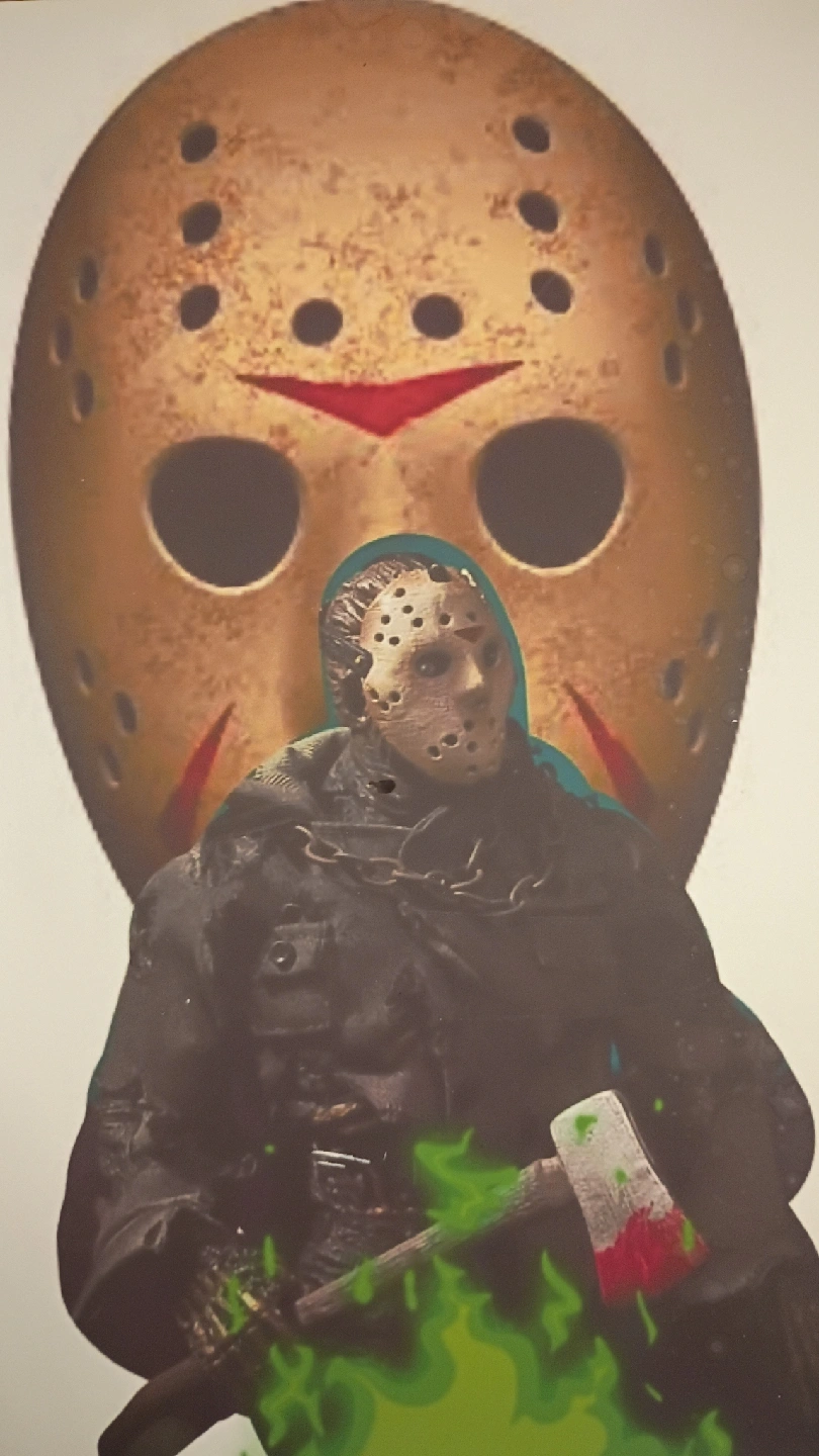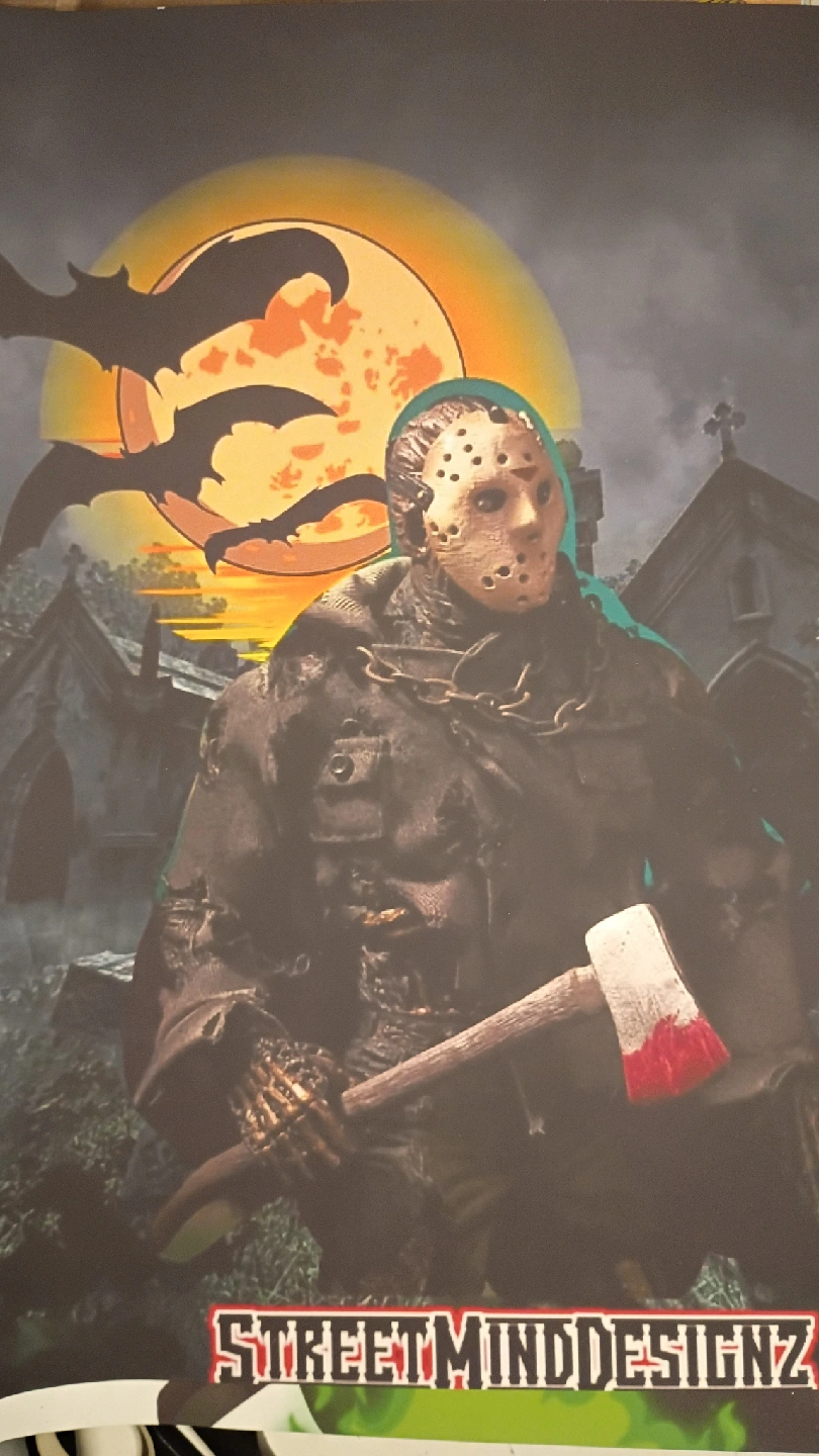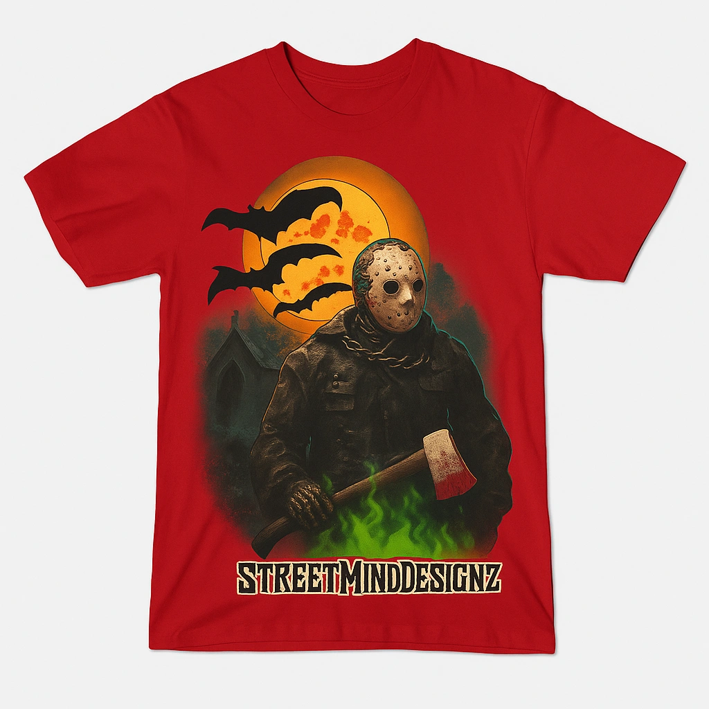 This is a Street Mind Designz t-shirt featuring Jason Voorhees. The shirt has a graphic design with bats and a full moon. The brand is Street Mind Designz we use a heat press placing any art on shirts