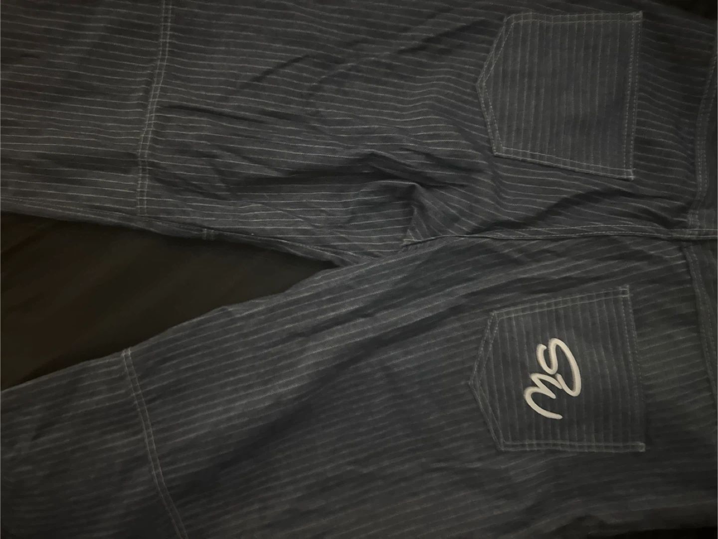 These are a pair of striped pants. They are in good condition and ready for a new home