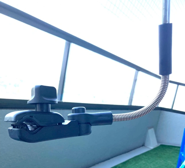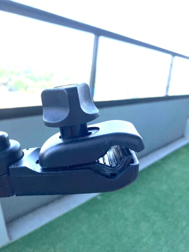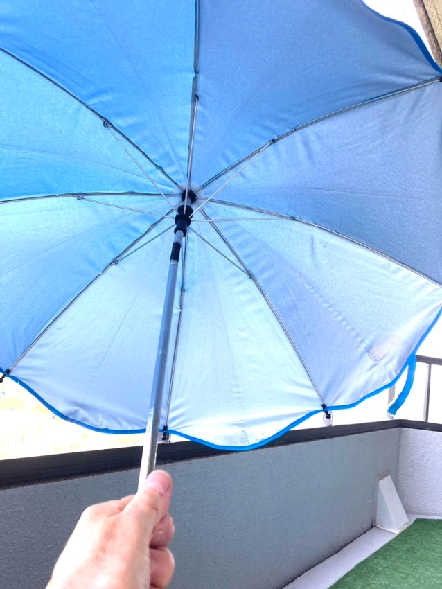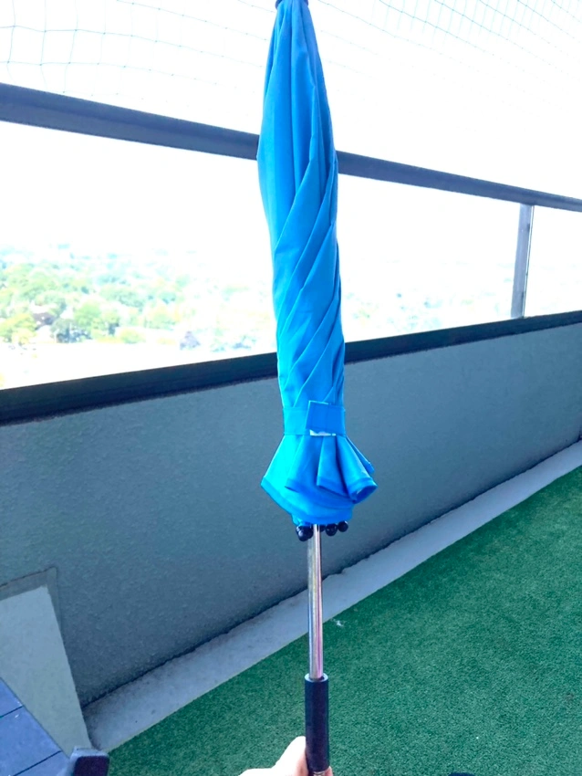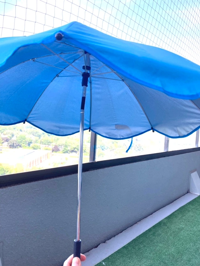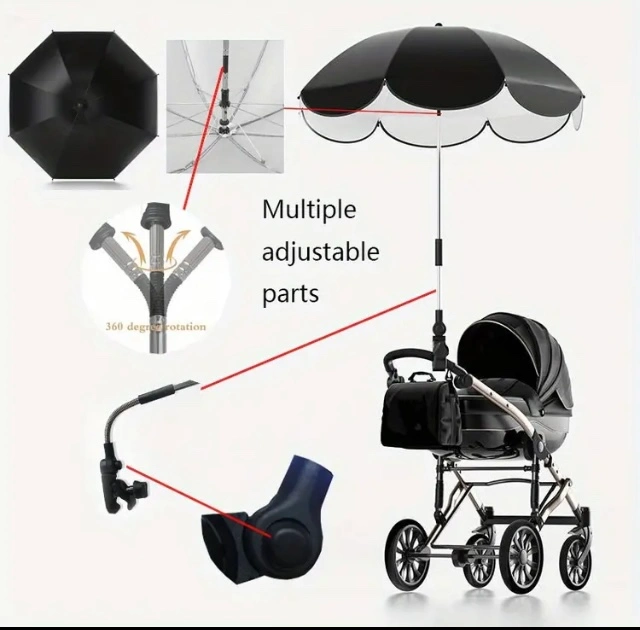 A blue stroller umbrella with adjustable parts. It has a waterproof and uv proof canopy to keep the sun off your little one. It also has an adjustable height, so you can get the perfect shade. The umbrella is easy to install and remove, and you can use for bicycles patio furniture as well.