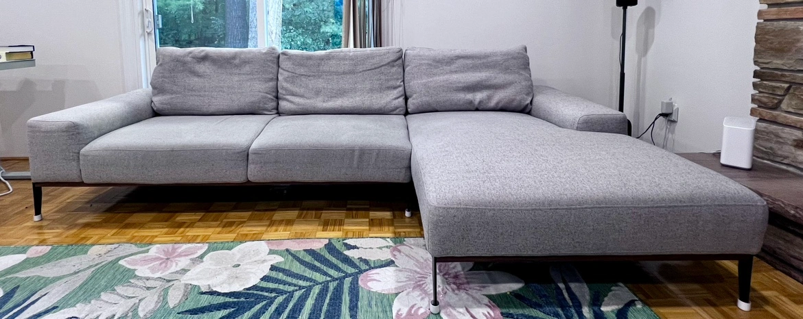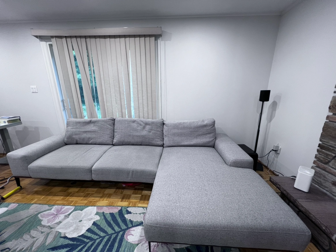 8Looking to refresh your living space? I'm selling my Structube right-facing sectional sofa. It’s been used for 2 years in a smoke-free, pet-free home. This sofa is perfect for lounging, entertaining, or simply adding a touch of modern elegance to your living/ family/ media room. • Brand: Structube • Orientation: Right-facing • Condition: Good (Used but not torn, some signs of wear) • Color: Grey • Material: Fabric Features: • Comfortable and spacious seating • Back cushions are loose and reversible, seat cushions are integrated. • Modern and stylish design • Perfect for any living room setup Reason for Selling: Moving out.