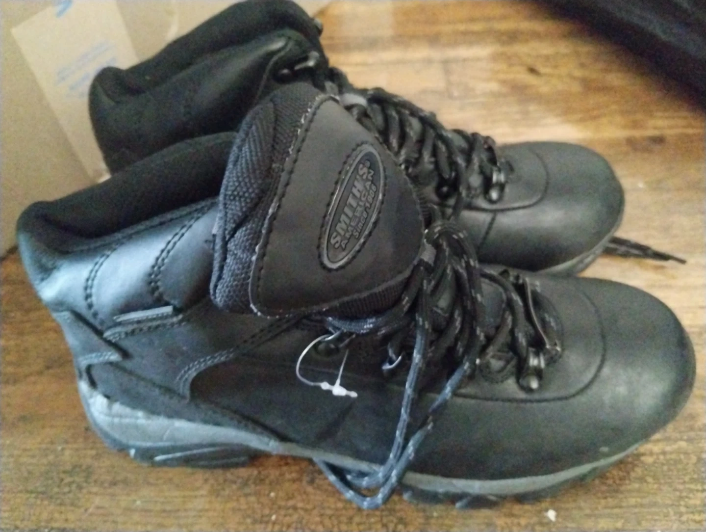 Smith's Workwear hiking boots. Black leather upper with durable rubber sole. Lace-up closure for a secure fit. Water-resistant design for all-weather wear.