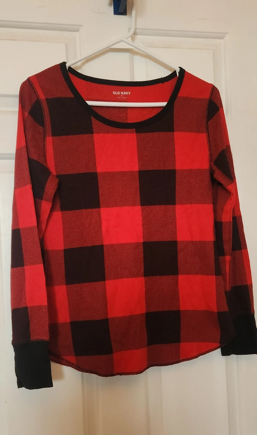 Cozy up with this Old Navy pajama set! It features a classic red and black plaid pattern. The set includes a long-sleeved top and matching pants, both in a comfortable size M. Perfect for those chilly nights!