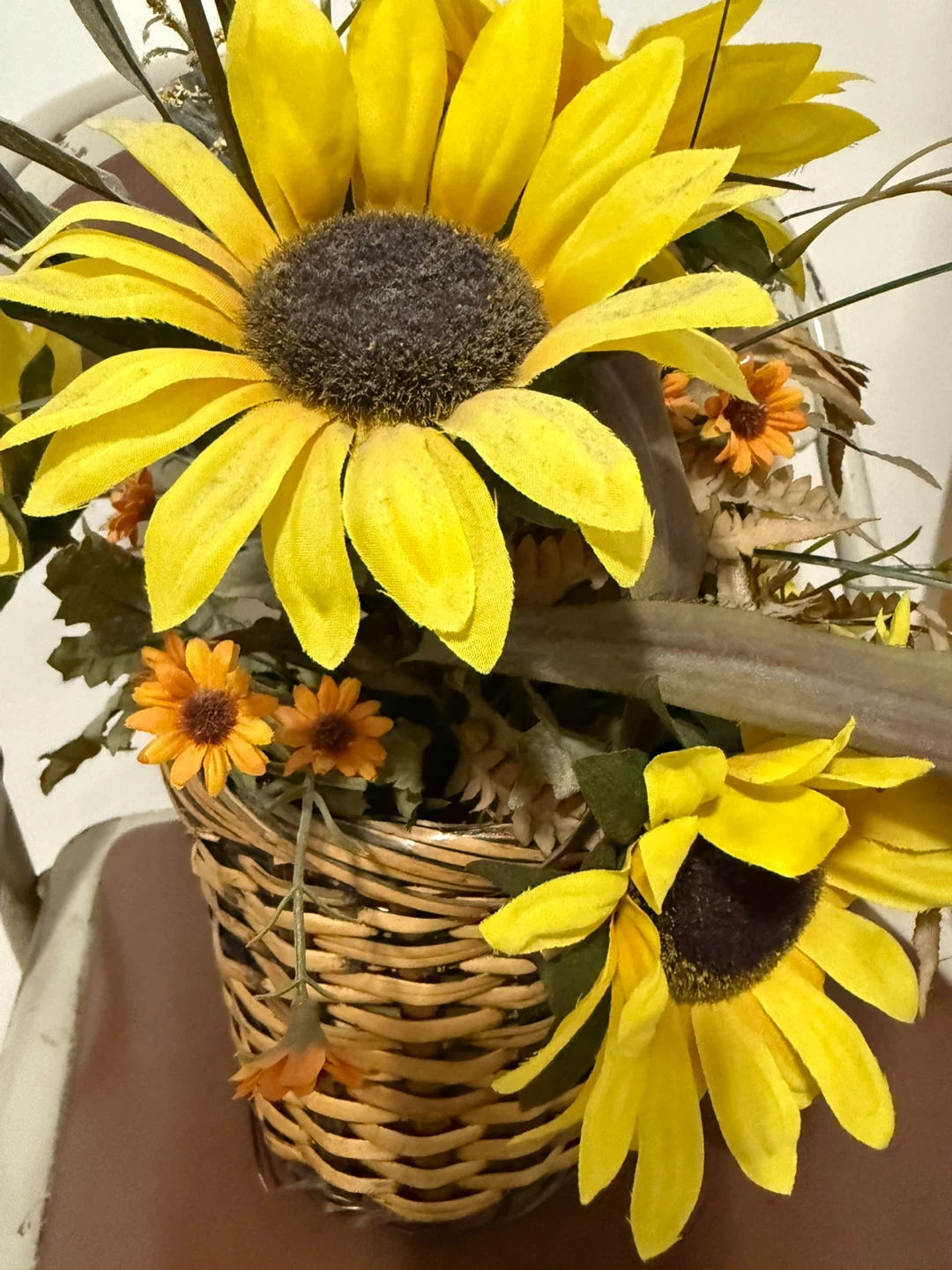67I have a lovely sunflower arrangement in a woven basket for sale. It features bright yellow sunflowers and smaller orange flowers, along with some decorative foliage. This would make a beautiful addition to any room!