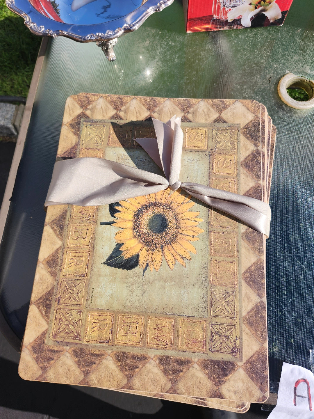 Selling a set of 8 placemats featuring a sunflower design. They are in good condition and ready to brighten up your dining table!