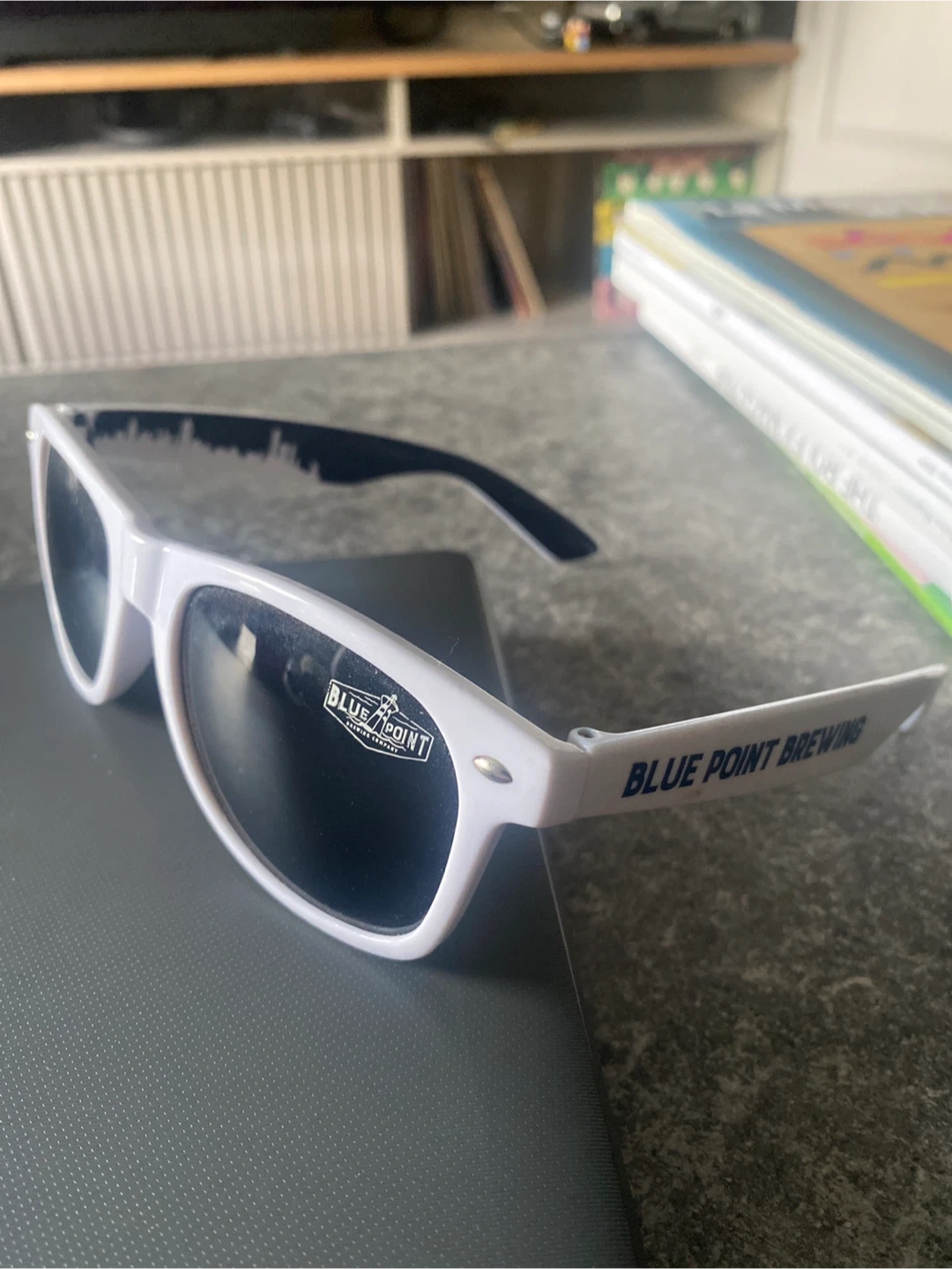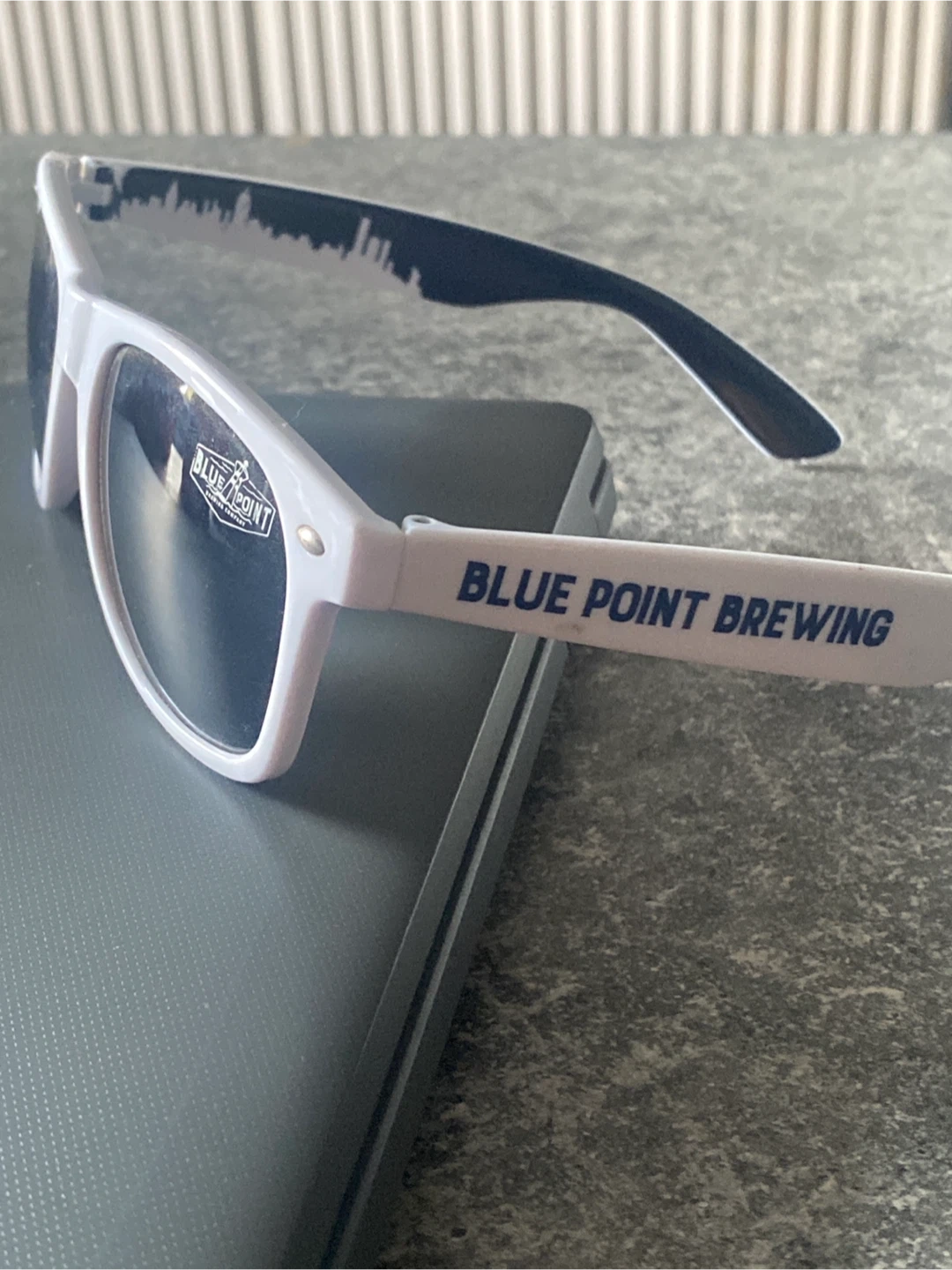 These are a pair of white sunglasses from Blue Point Brewing. They feature the brewery's name on the side and NYC skyline design on the arm. A fun accessory for any beer enthusiast!