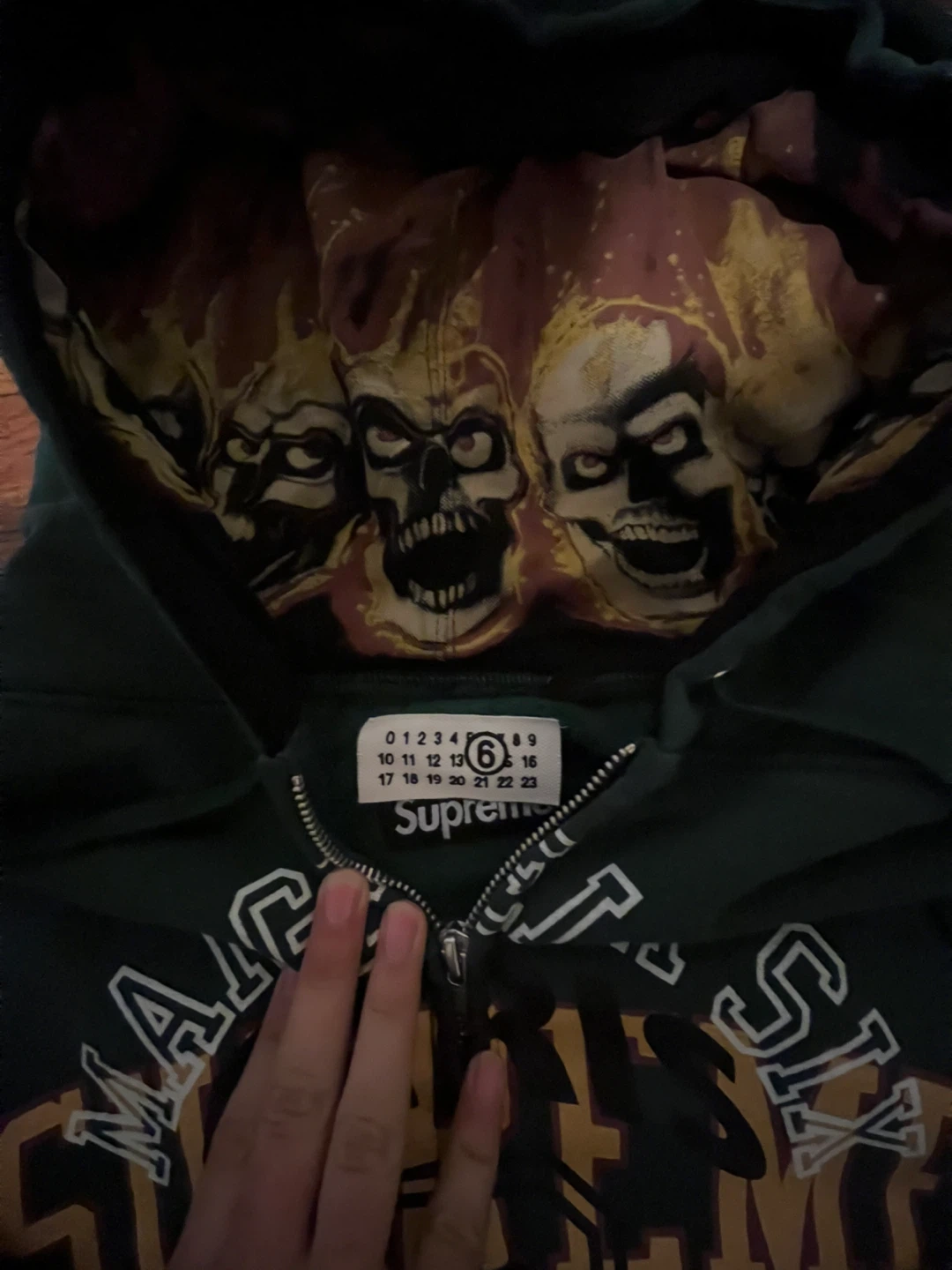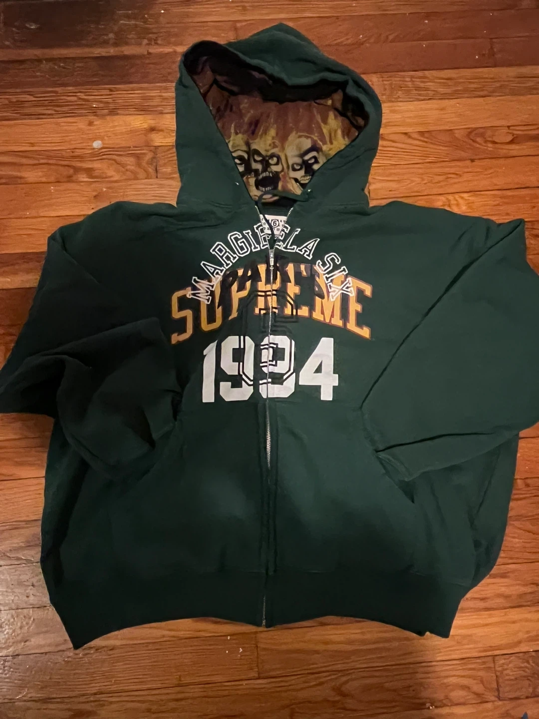 Selling a cool Supreme x Maison Margiela hoodie in a dark green color. It features a unique design with skulls on the inside of the hood and the year 1994 on the front. This is a great piece for anyone who loves streetwear! sadly it doesn’t fit me anymore that’s why i’m selling this holy grail it’s authentic u can legit check it