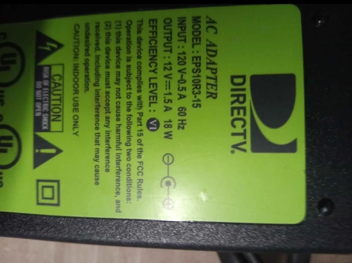 DirecTV AC adapter model EPS10R3-15. It's an 18W power supply. Input is 120V, 60 Hz, 0.5A. Output is 12V, 1.5A.