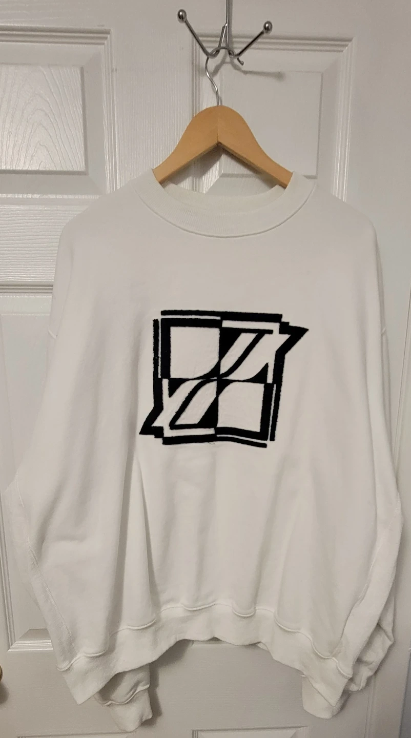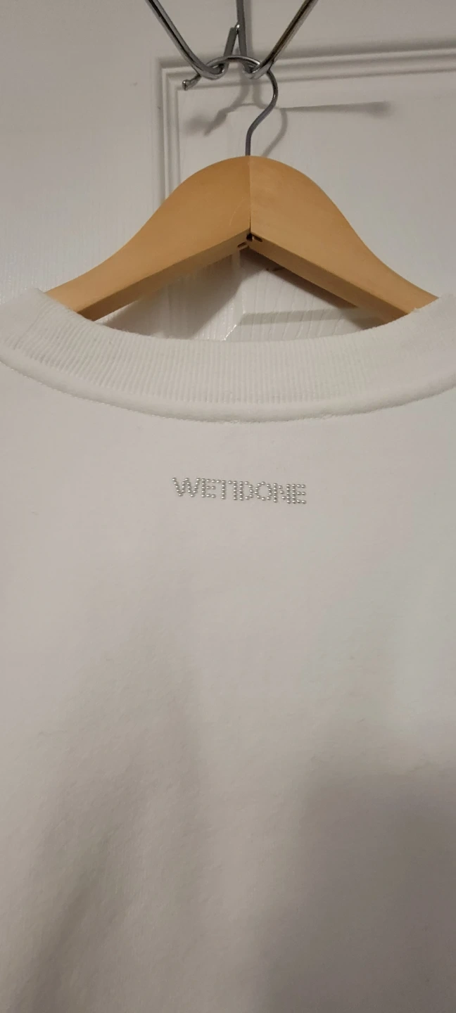 This is a white unisex WE11DONE sweatshirt with a black graphic design on the front. It's made of comfortable material and features a crew neck. It's a stylish piece for casual wear.
