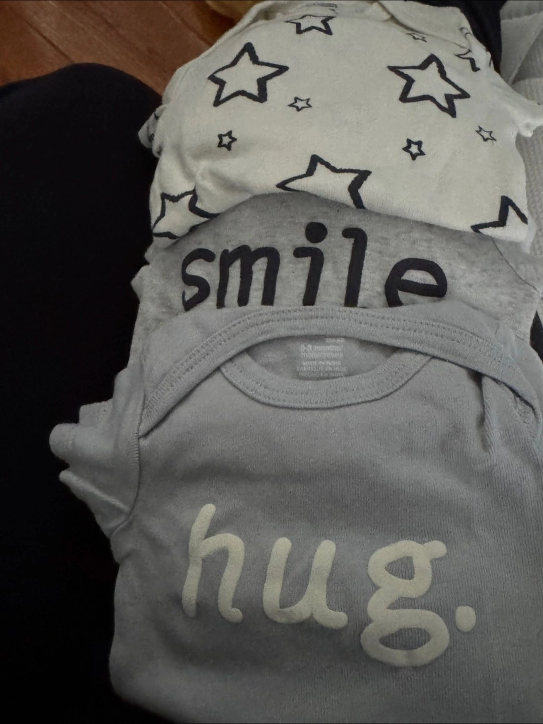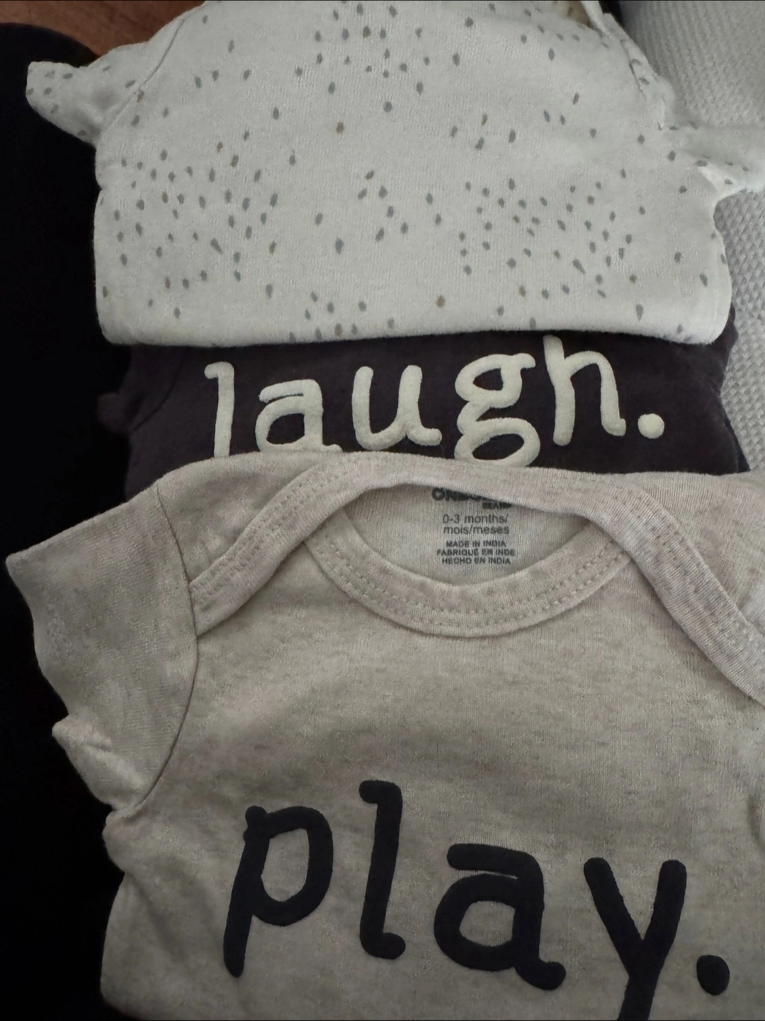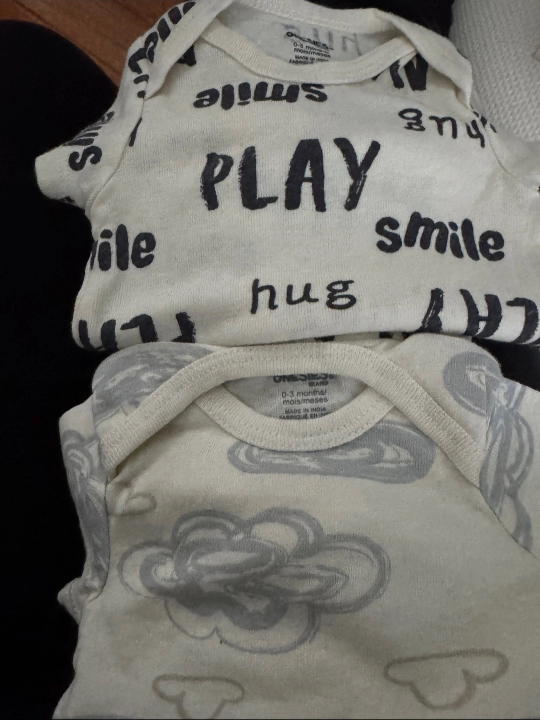 Bodysuits in a variety of colors. Some feature words like "play" or "smile." These could be used to outfit a baby for a nice, peaceful day. It comes with 9 outfits. Never worn