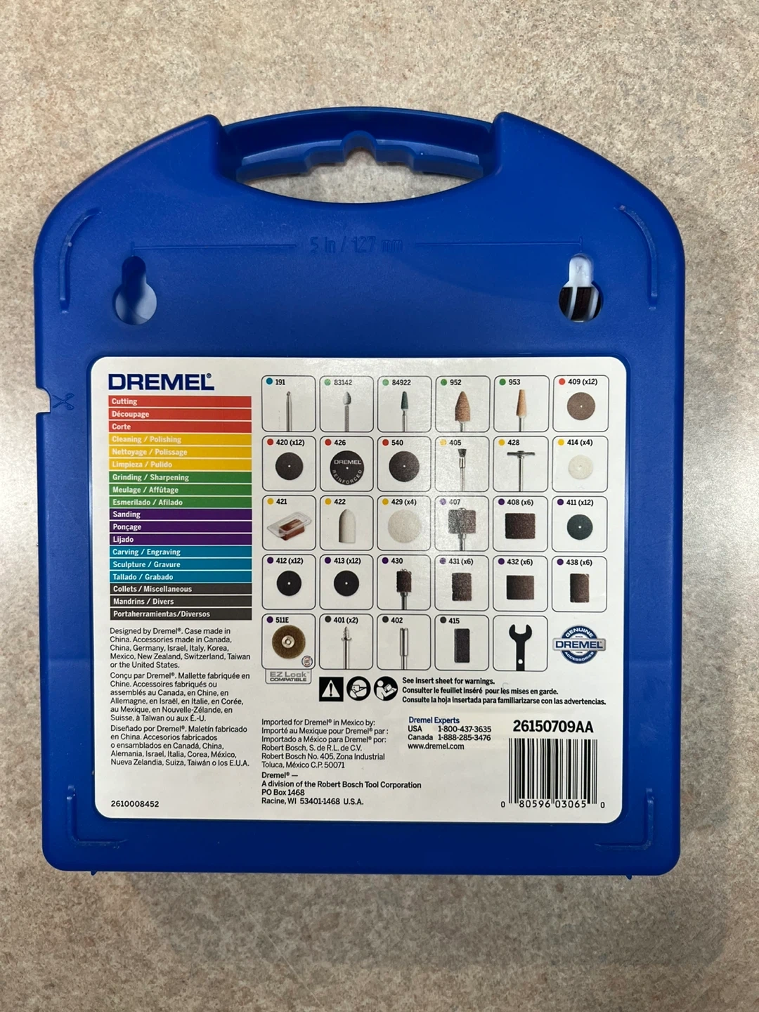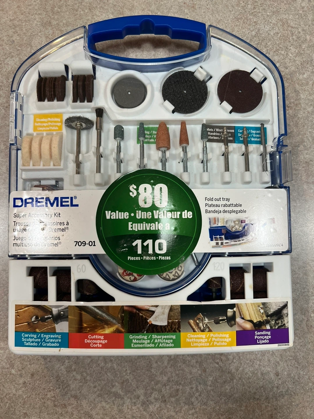 Selling a Dremel Super Accessory Kit, model 709-01. This kit comes with 110 pieces for cutting, grinding, sanding, carving, and polishing. It's a versatile set for various Dremel rotary tool projects. Includes a fold out tray for easy access and organization