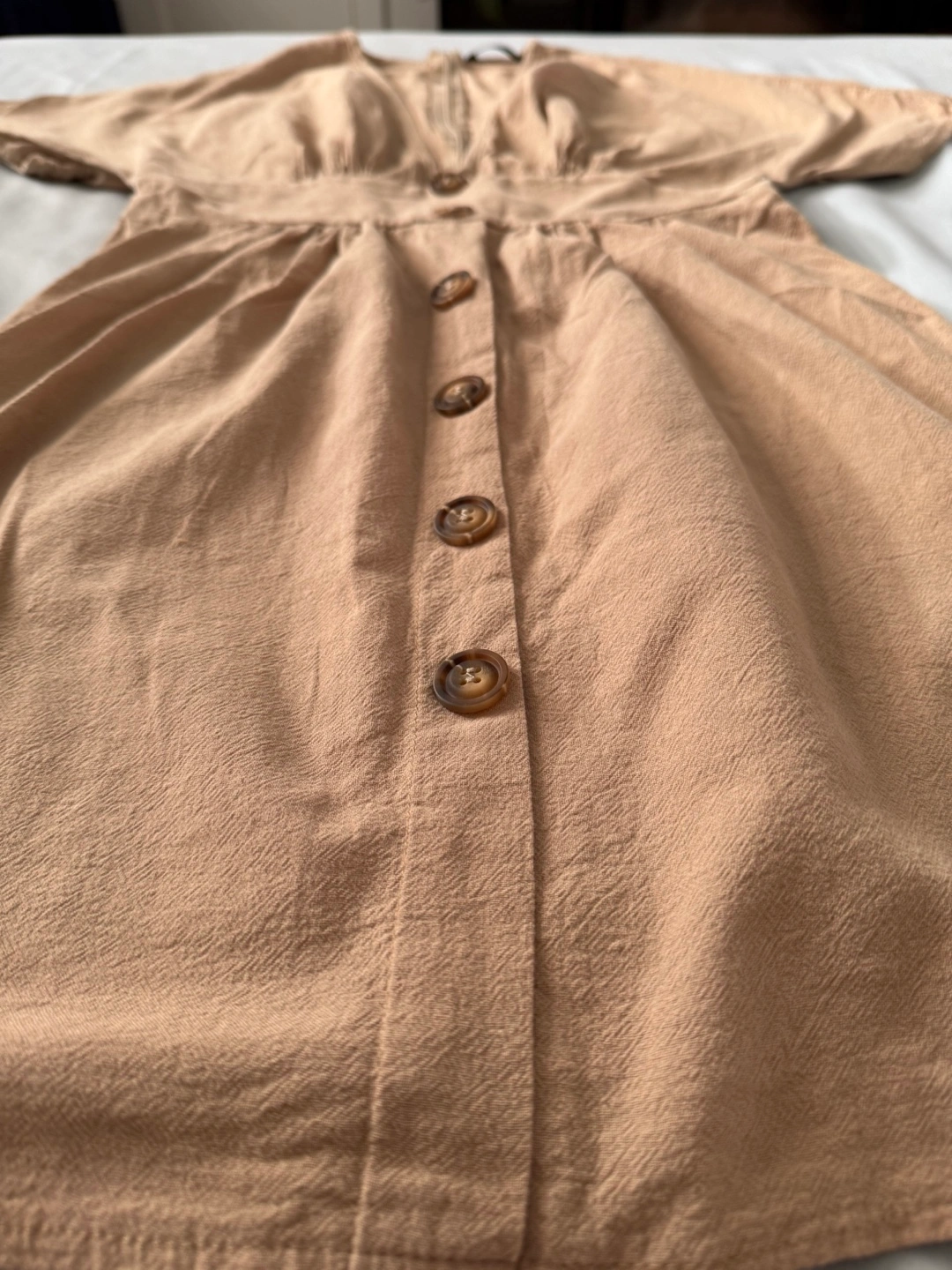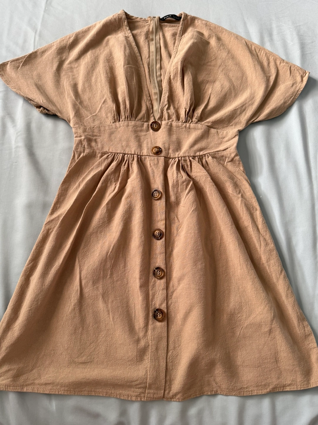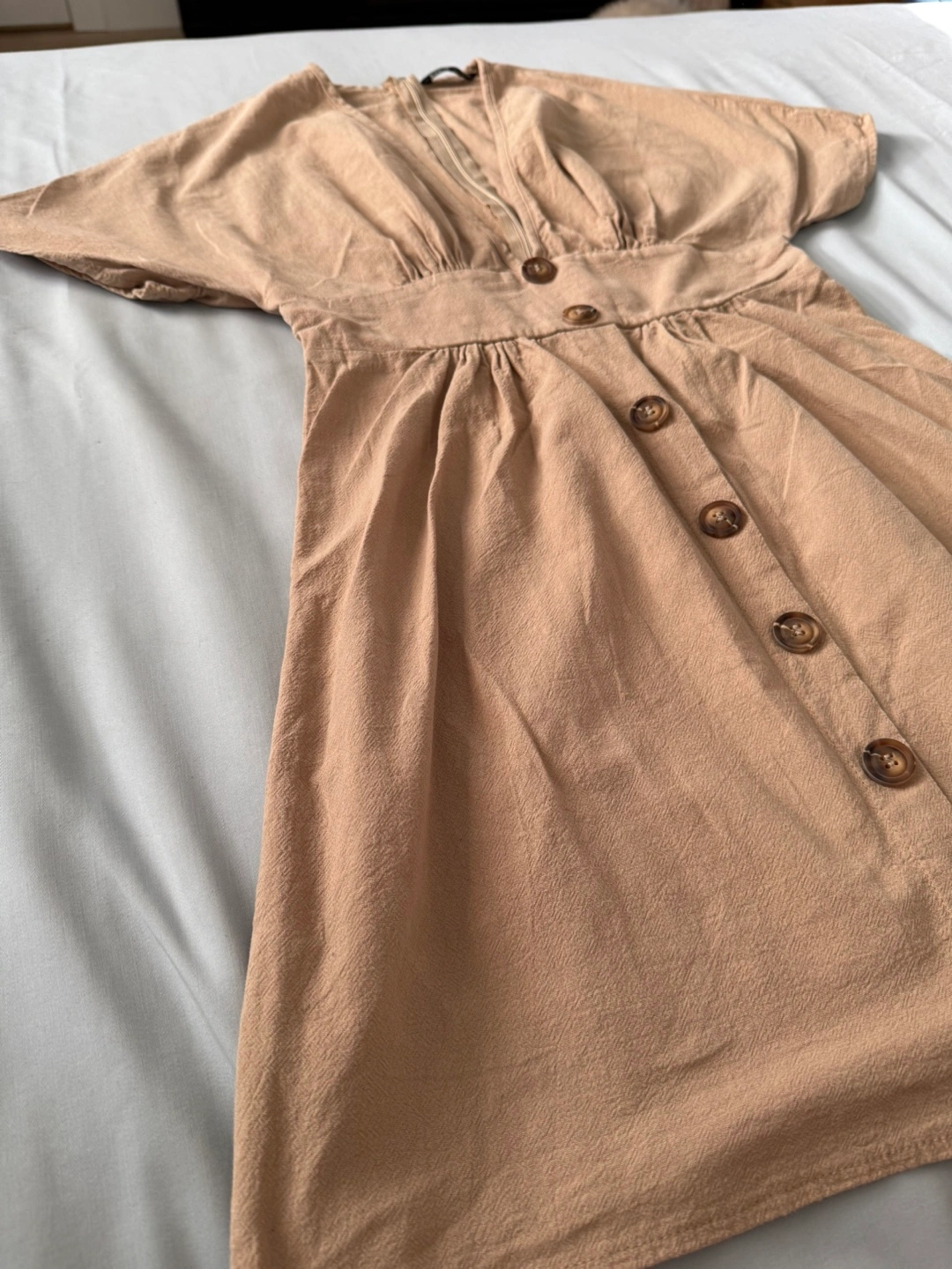 Chic tan dress with wooden-style button front, deep V-neckline, and cinched waist for a flattering fit. Lightly textured fabric with a zipper at the back.