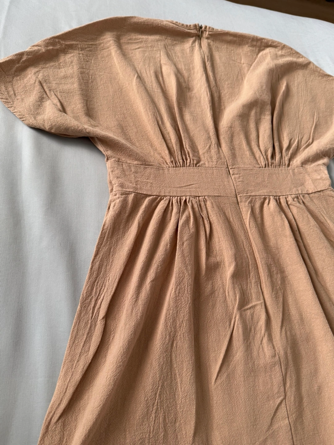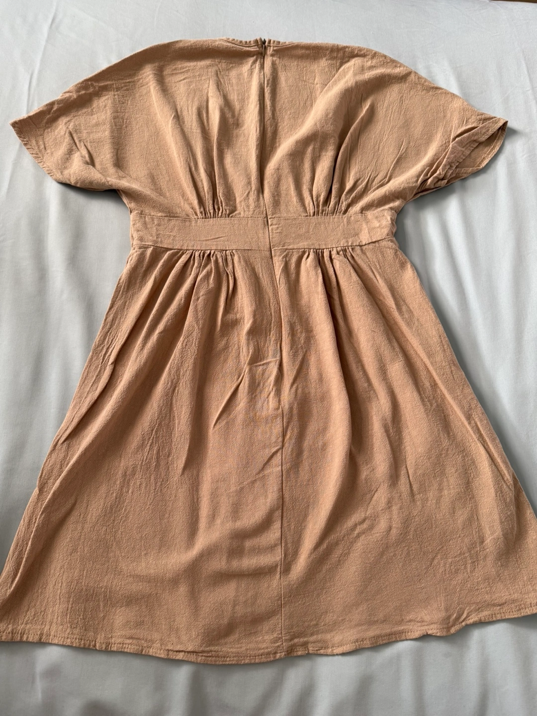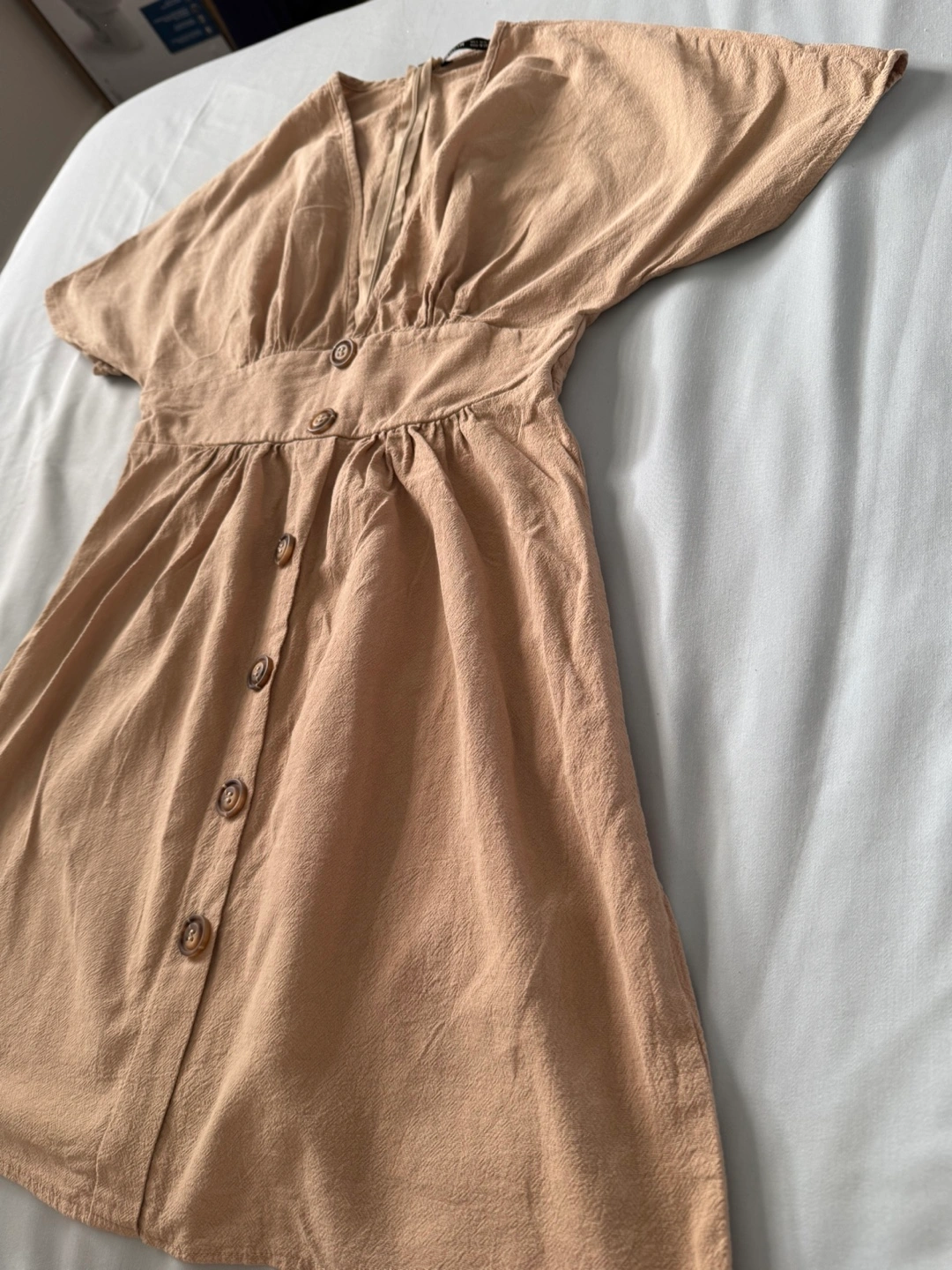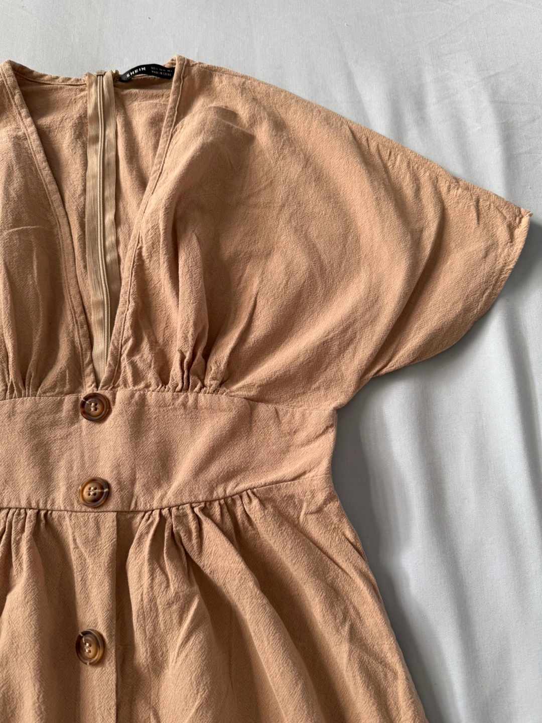Chic tan dress with wooden-style button front, deep V-neckline, and cinched waist for a flattering fit. Lightly textured fabric with a zipper at the back.
