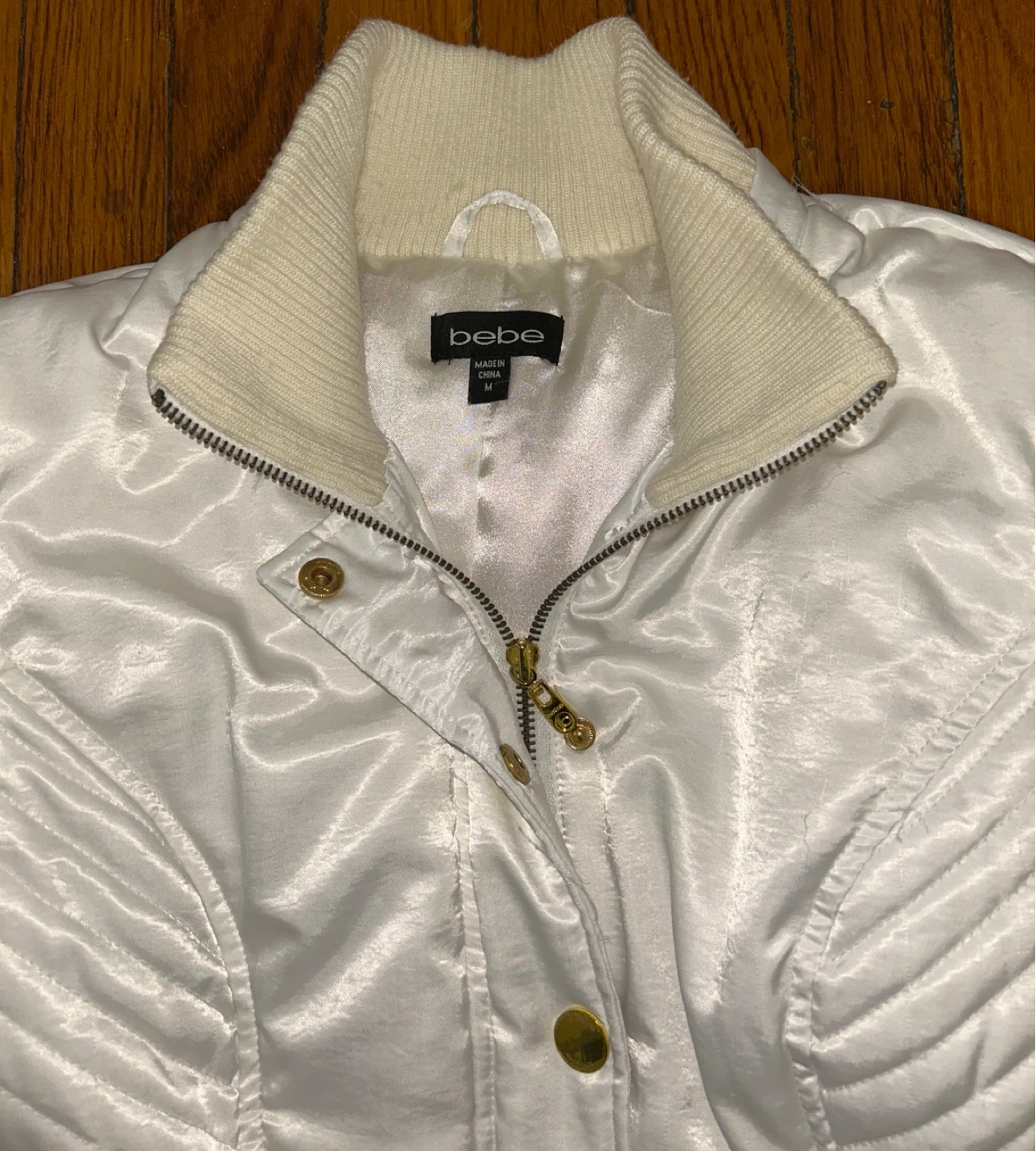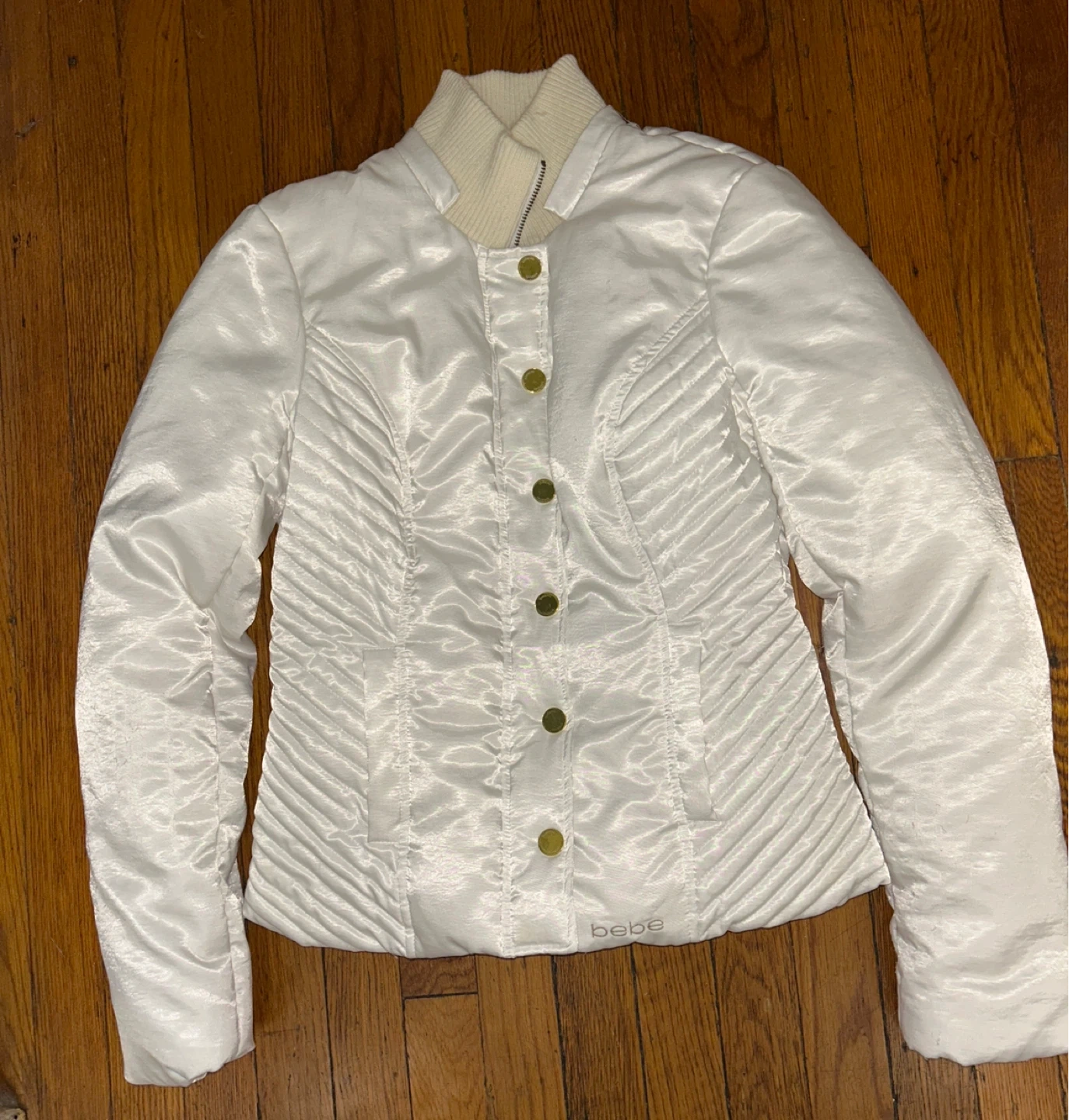 Selling a beautiful white down puffer jacket from Bebe in size M. In excellent, like new condition. Features a unique, corset-style design on the back. ZIP and snap front closure. Two side pockets. Pick up on the upper west side of Manhattan.