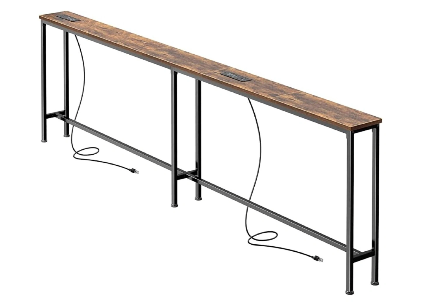 This long sofa table features a rustic wood top and a black metal frame. It includes built-in power outlets for convenient device charging. Its slim profile makes it ideal for behind a couch or in narrow spaces.