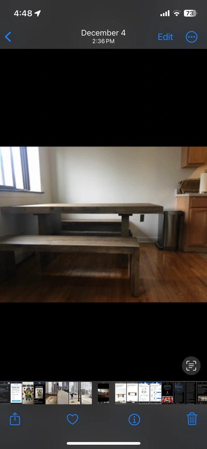 Beautiful West Elm Emmerson wood dining table set with 2 benches in farmhouse style. Table is 72”, benches 58”.