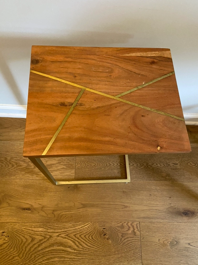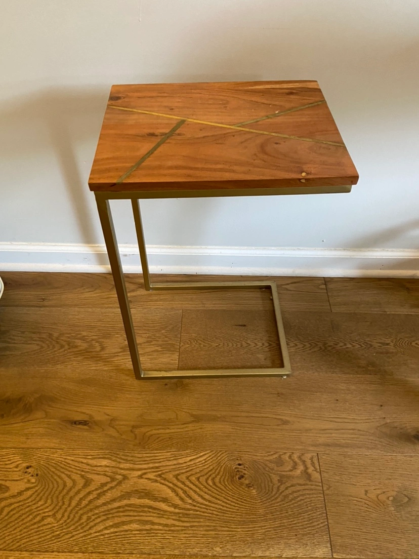 A small side table with a wood top and gold accents. The base is made of gold metal. It is a perfect size for a small space or to use as a nightstand. Very sturdy.