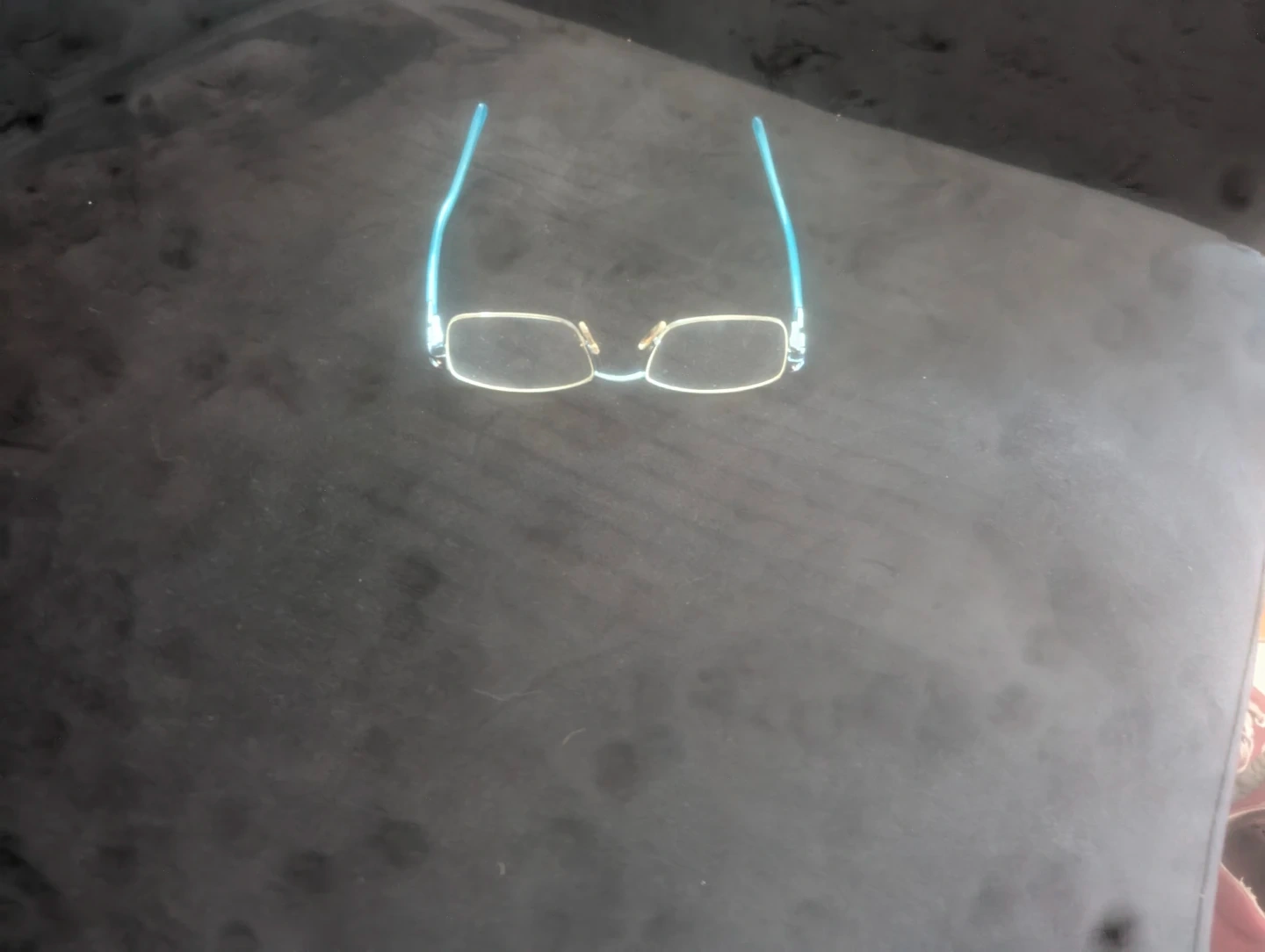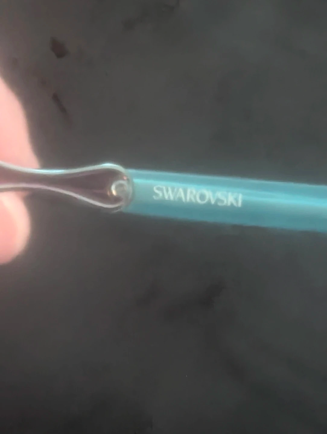 Swarovski eyeglasses frames with light blue temples. These frames have a gold-toned metal bridge and detailing at the temples. They're stylish and lightweight.