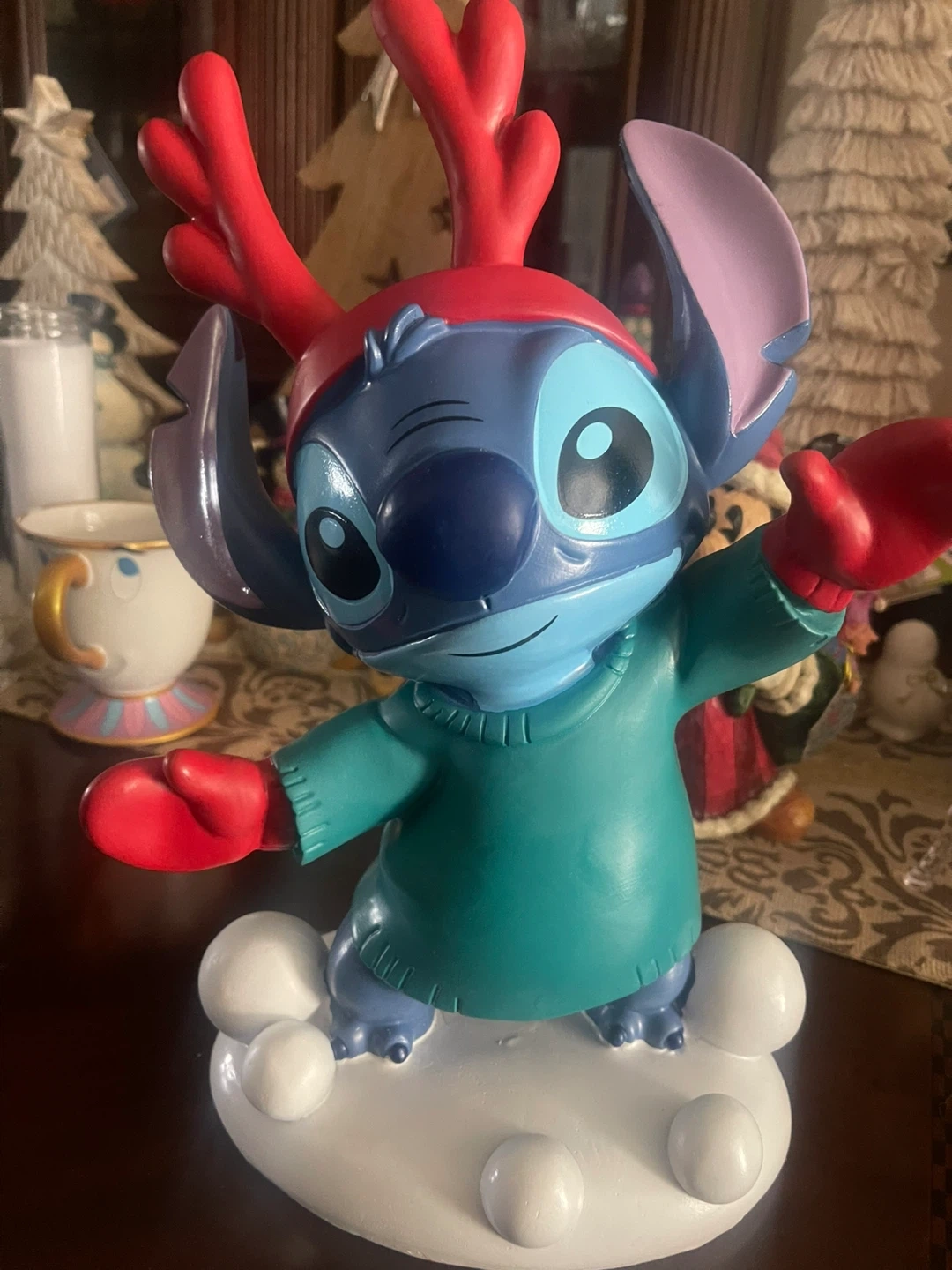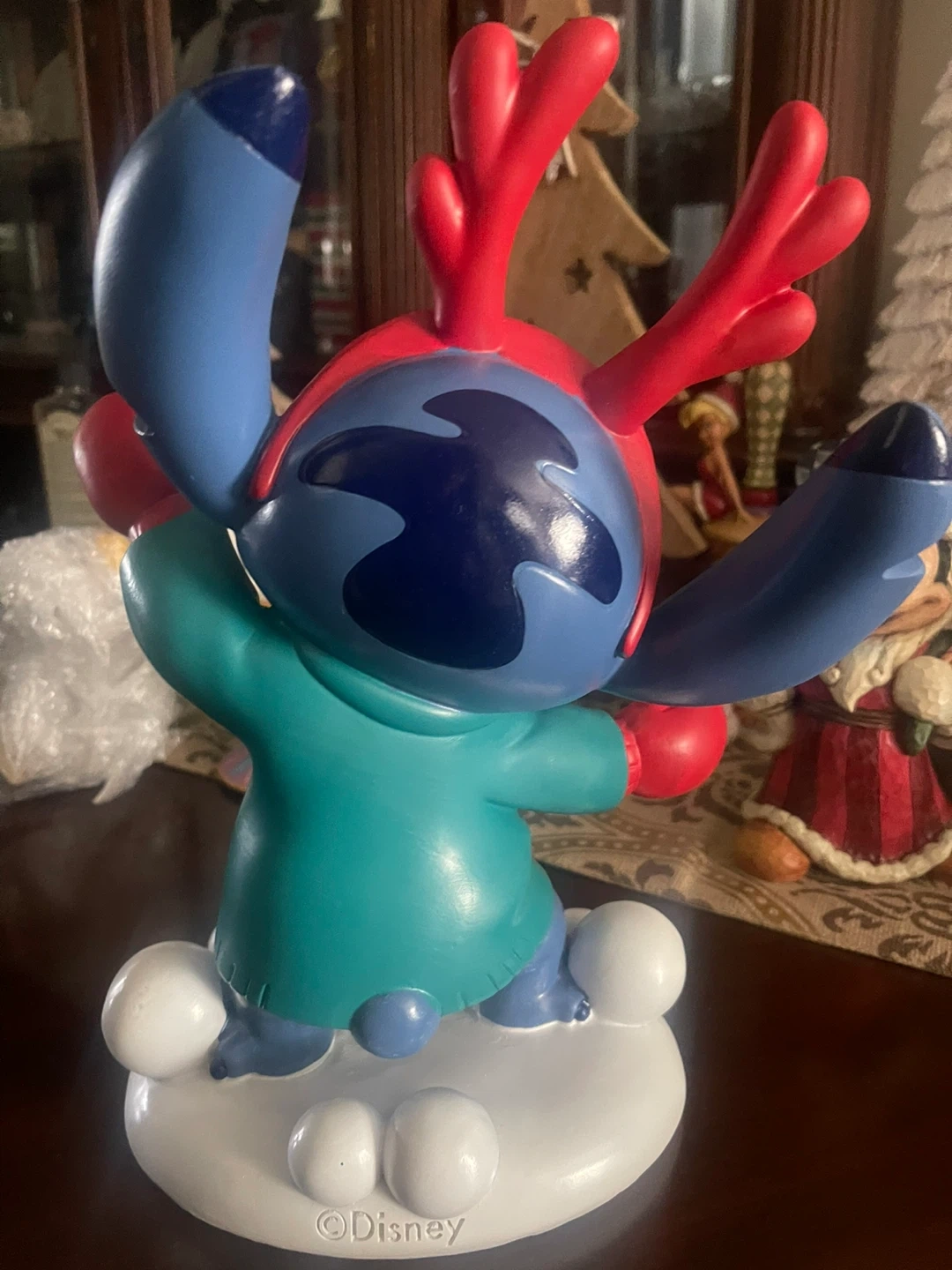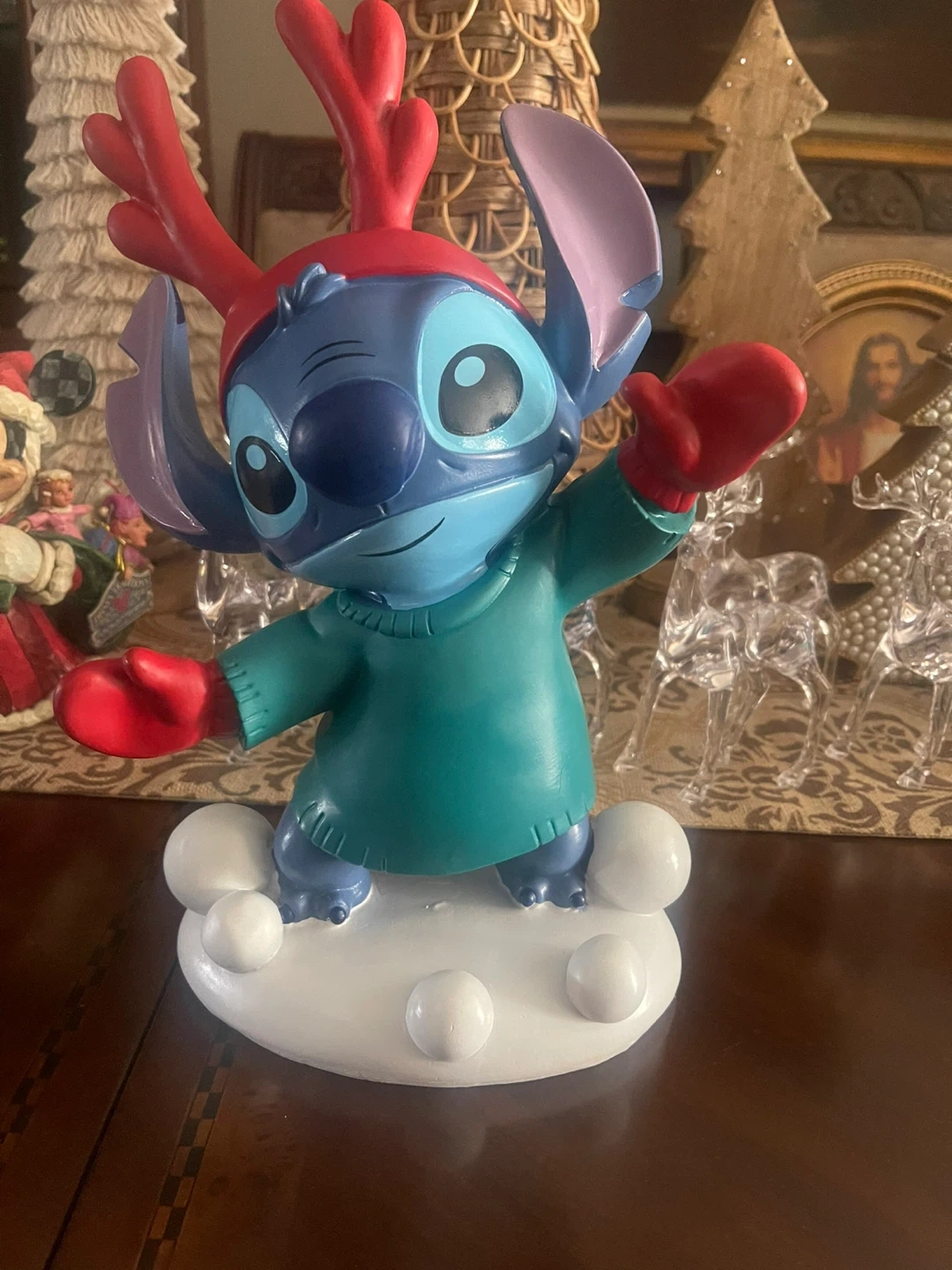 Selling a cute Stitch Christmas figurine! It features Stitch wearing a festive reindeer hat and mittens, standing on a snowy base. Great for adding a touch of Disney magic to your holiday decor