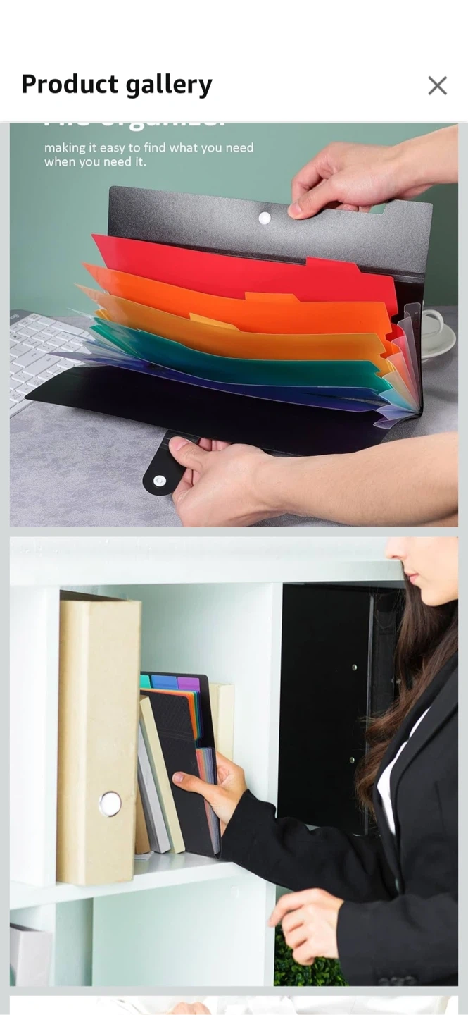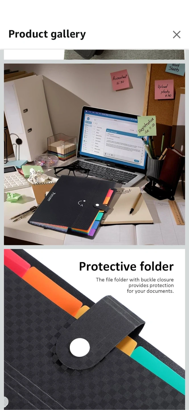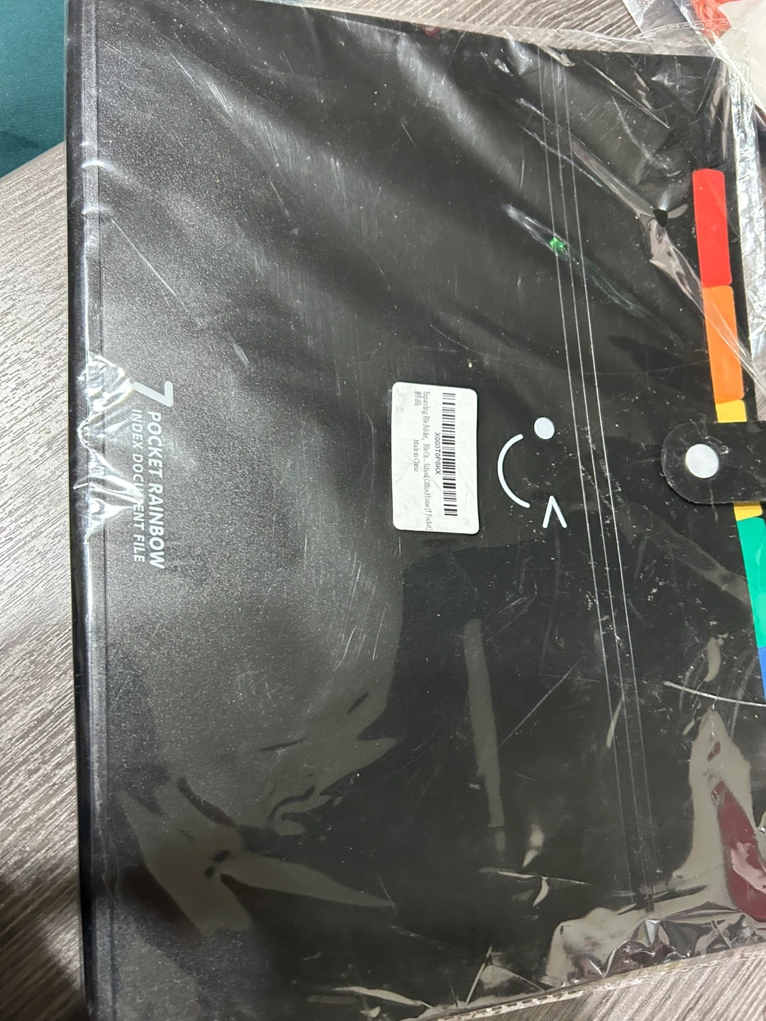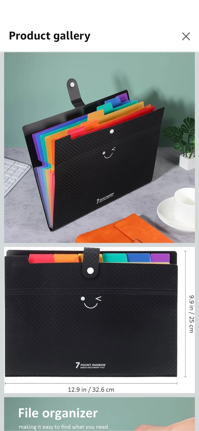 This black file folder has a buckle closure for document protection. It features colourful dividers making it easy to organize papers. The dimensions are 12.9 inches by 9.9 inches.