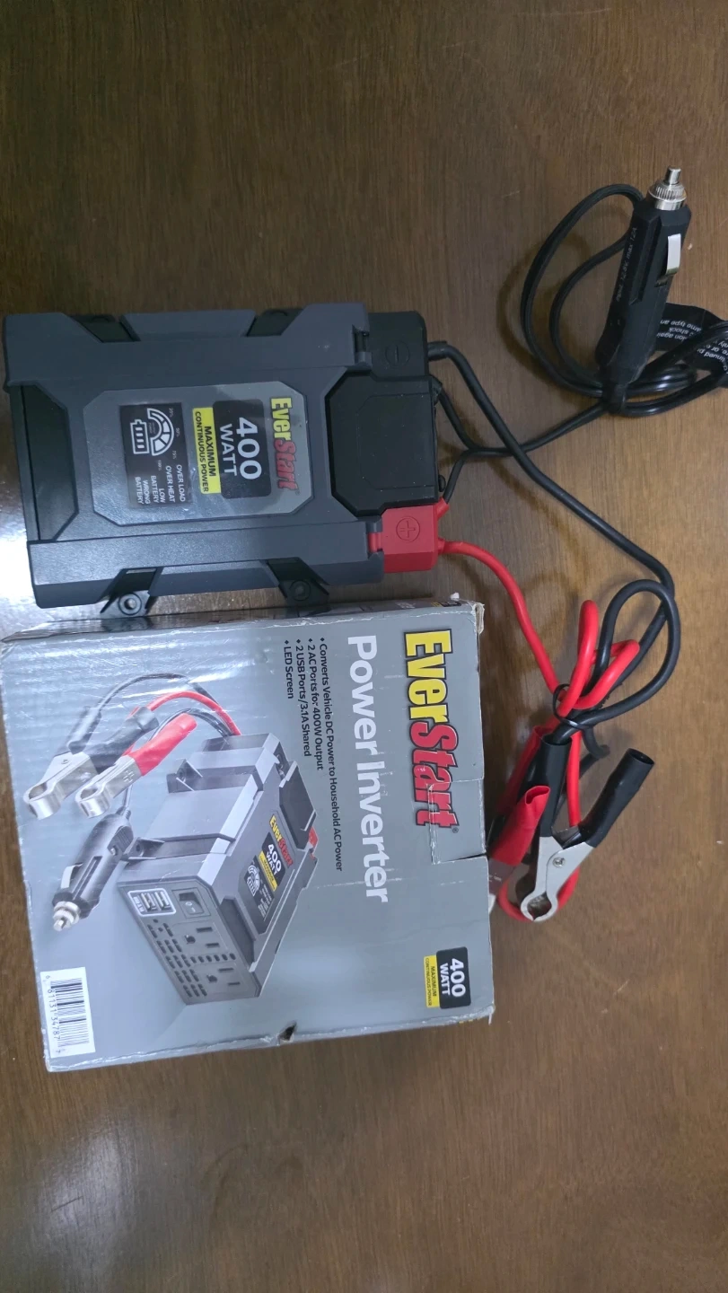 This EverStart power inverter converts vehicle DC power to household AC power. It offers 400 watts of continuous power. Includes 2 AC outlets and 1 USB port.