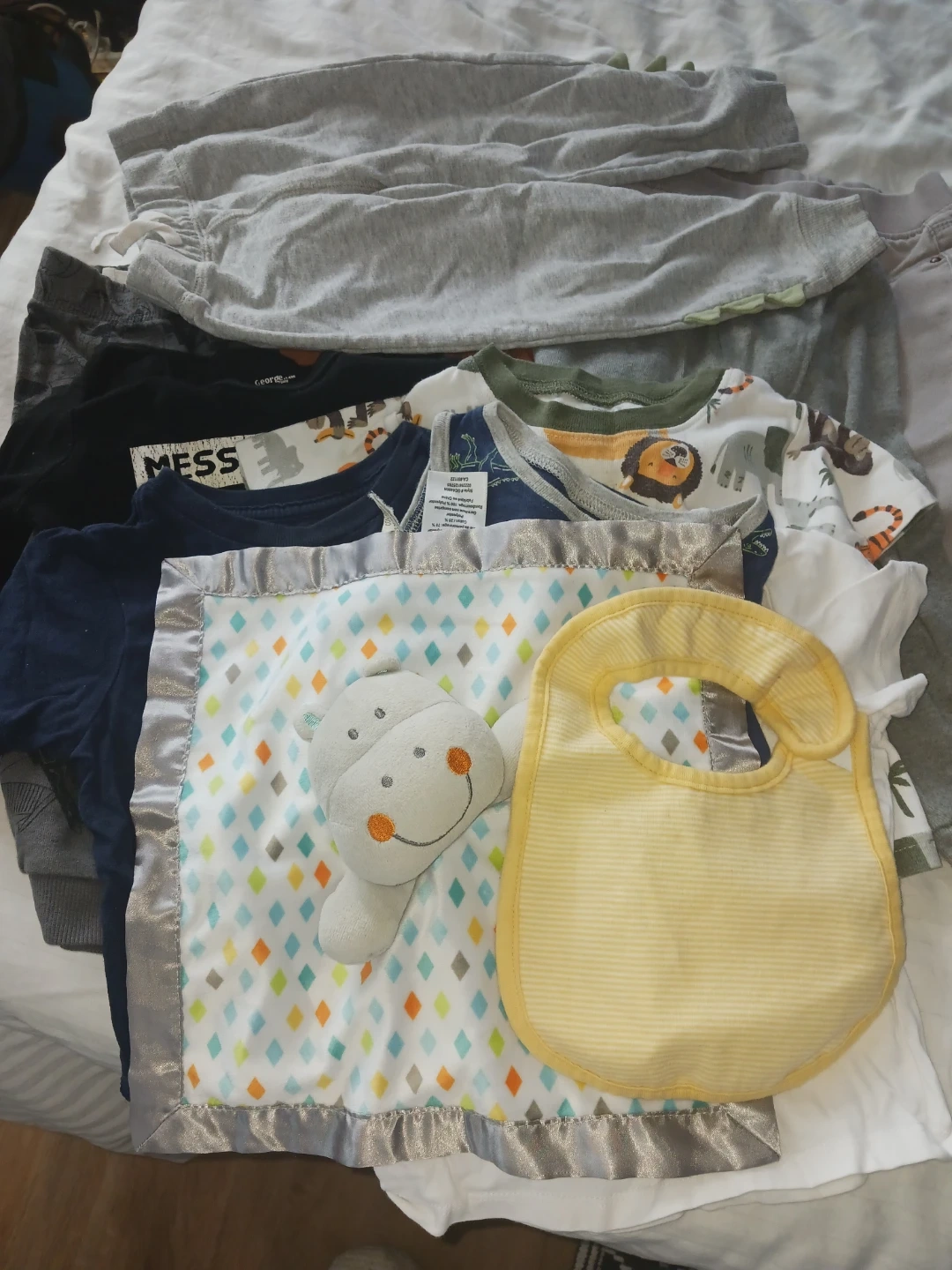 This bundle includes various baby clothes, a soft security blanket with a hippo, and a yellow striped bib. The clothes feature fun animal prints and comfortable designs. It's a great starter set for a little one!