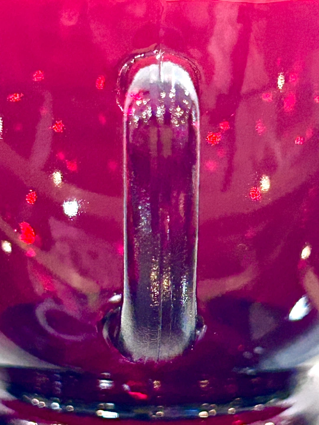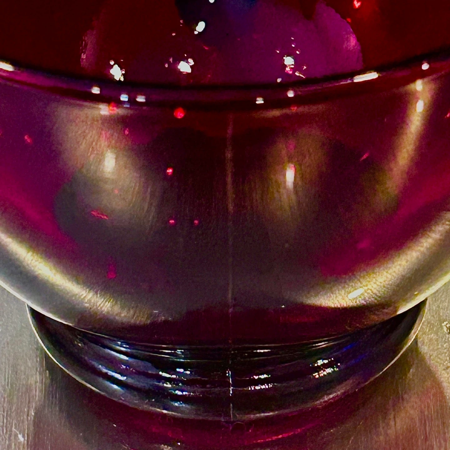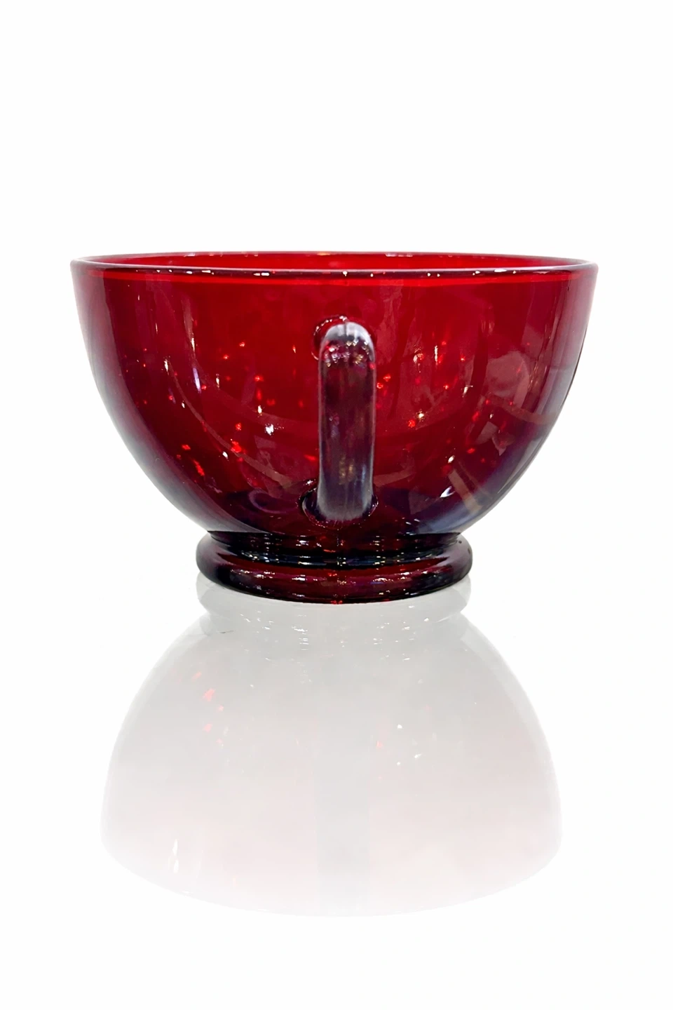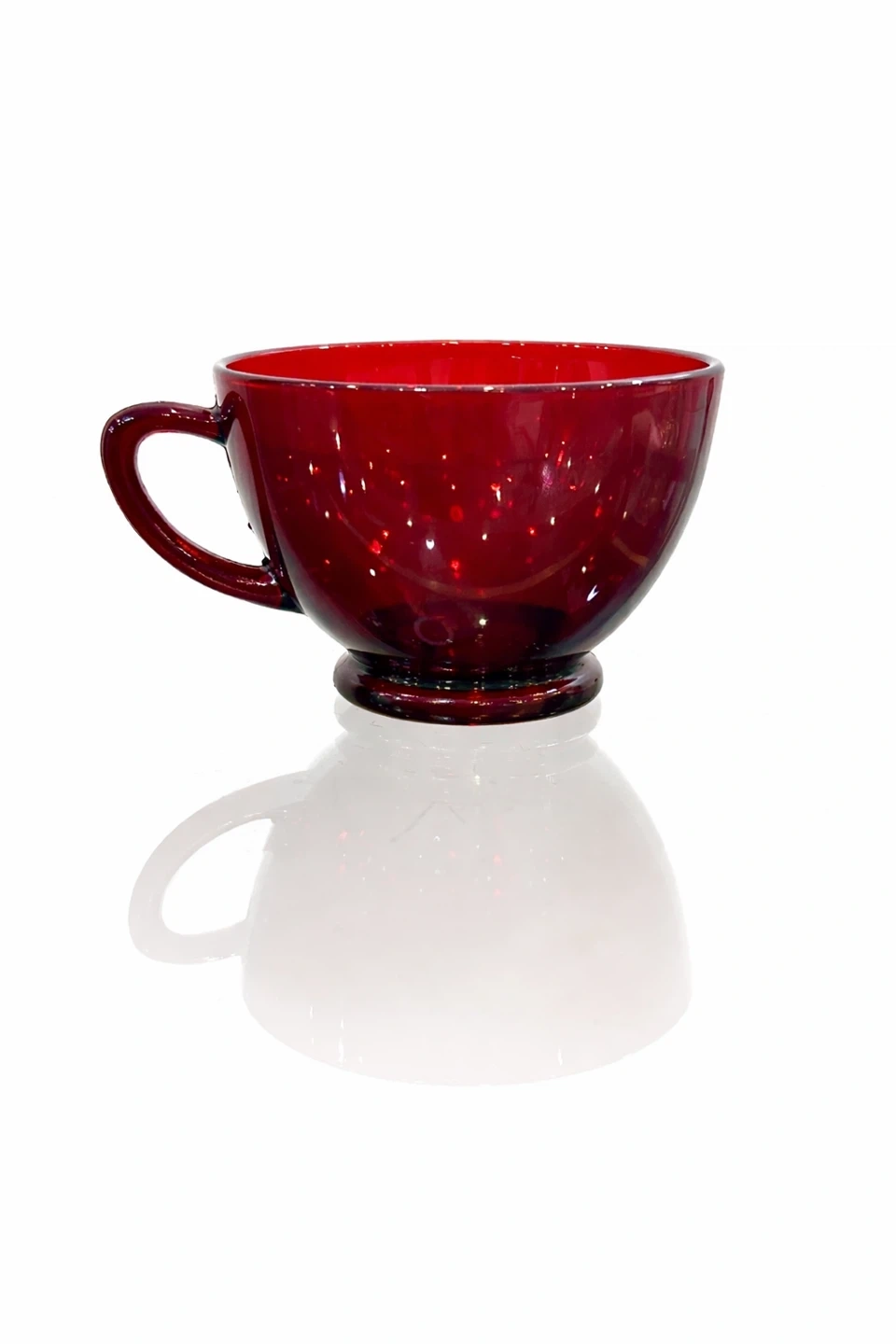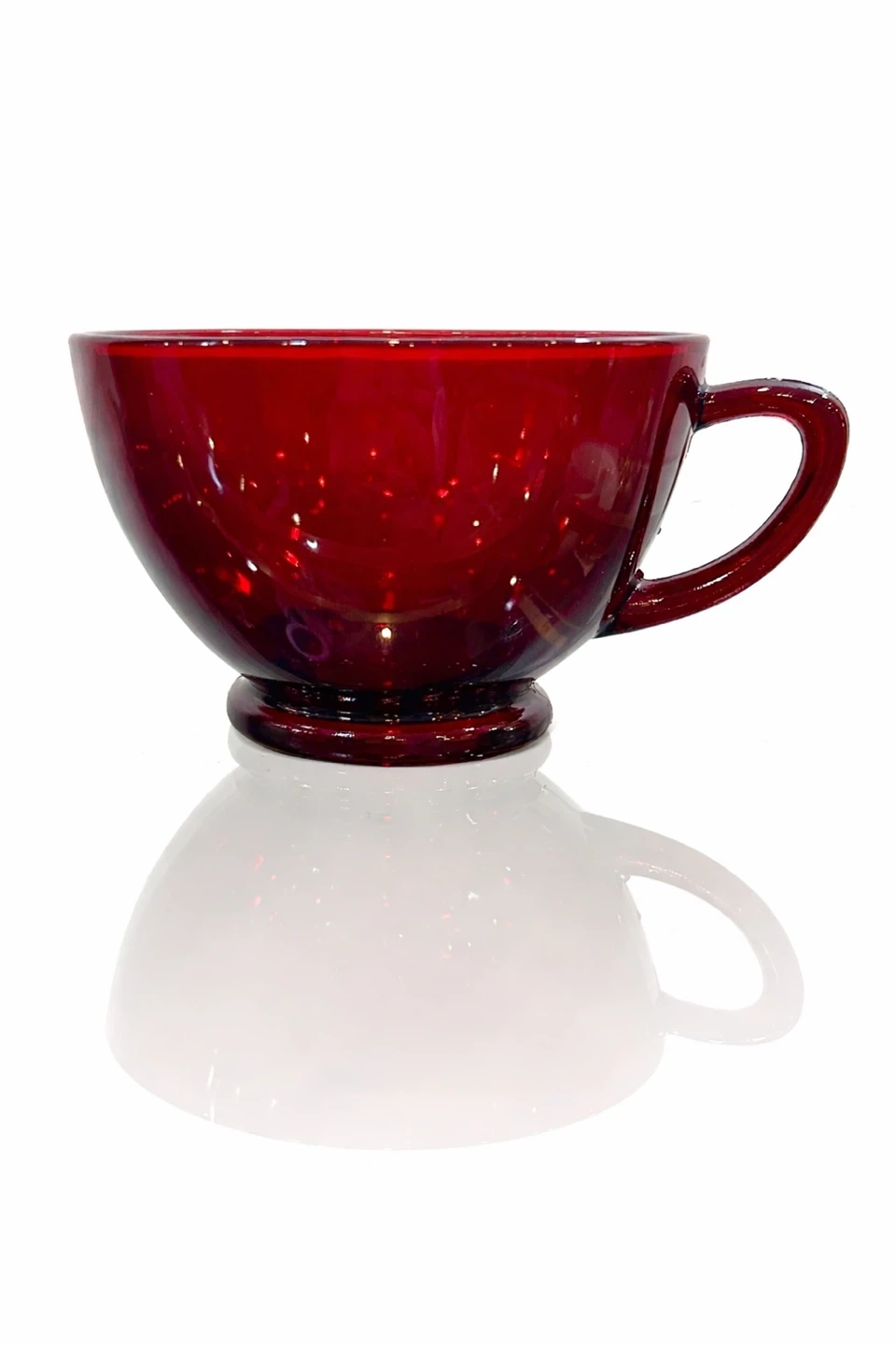 Perfect for coffee, tea, or display in a bar or cabinet setting. The saturated ruby glass reads beautifully against light interiors and pairs especially well with mid-century modern, Hollywood Regency, or curated vintage tableware collections.
