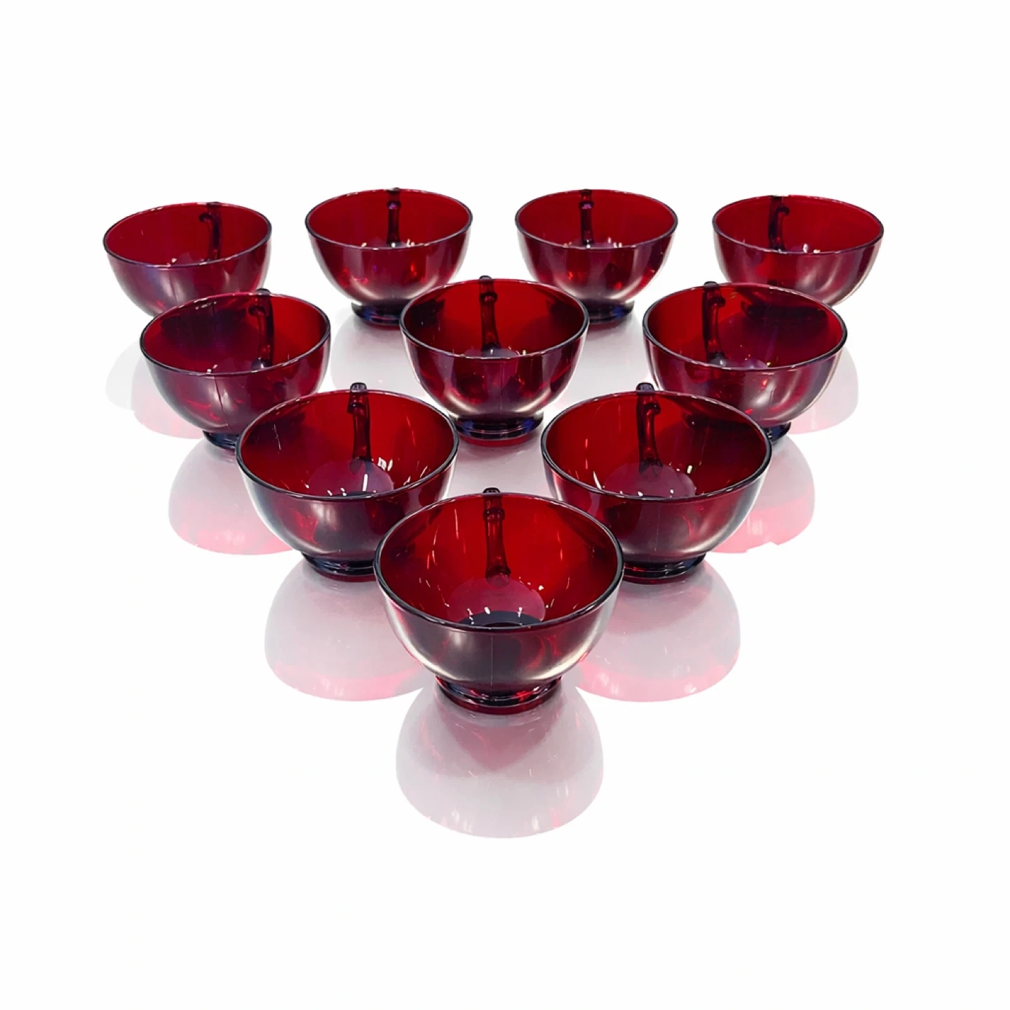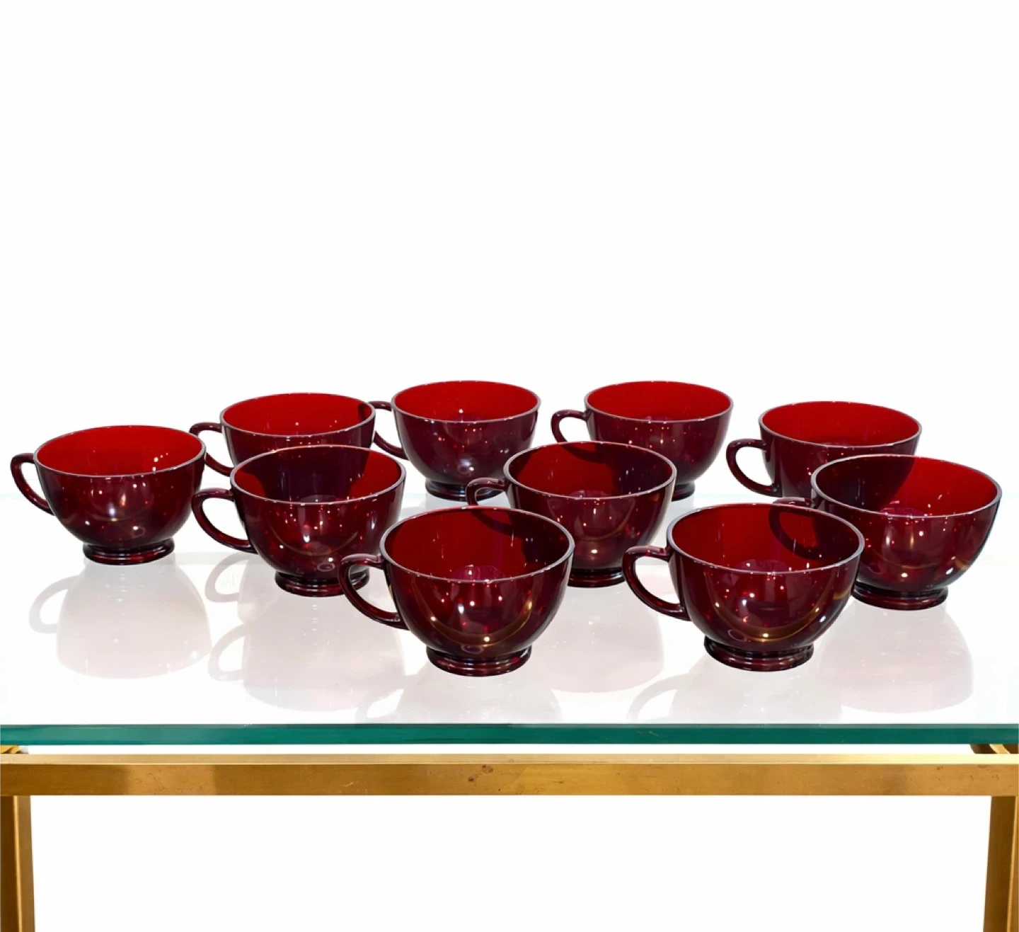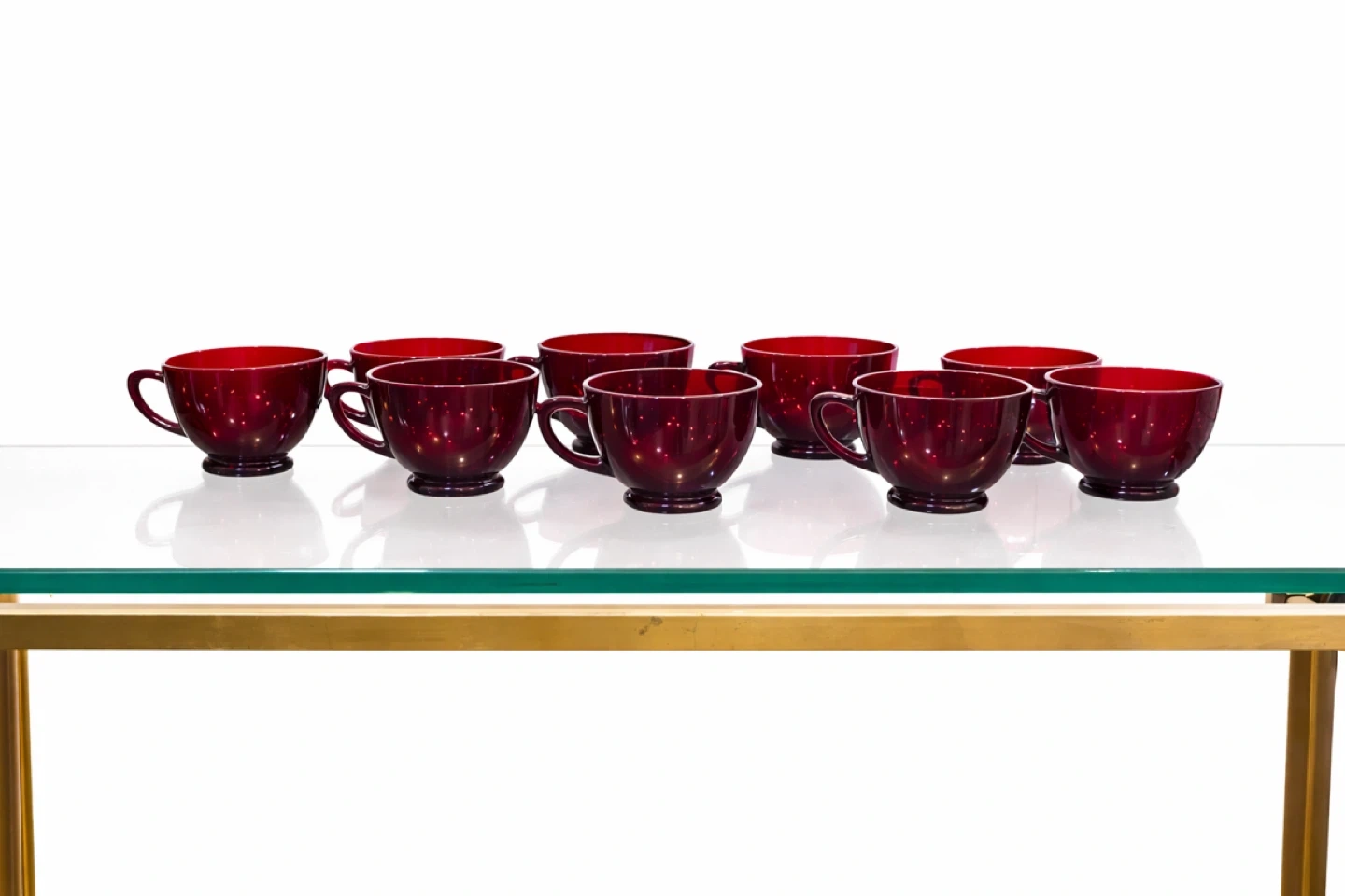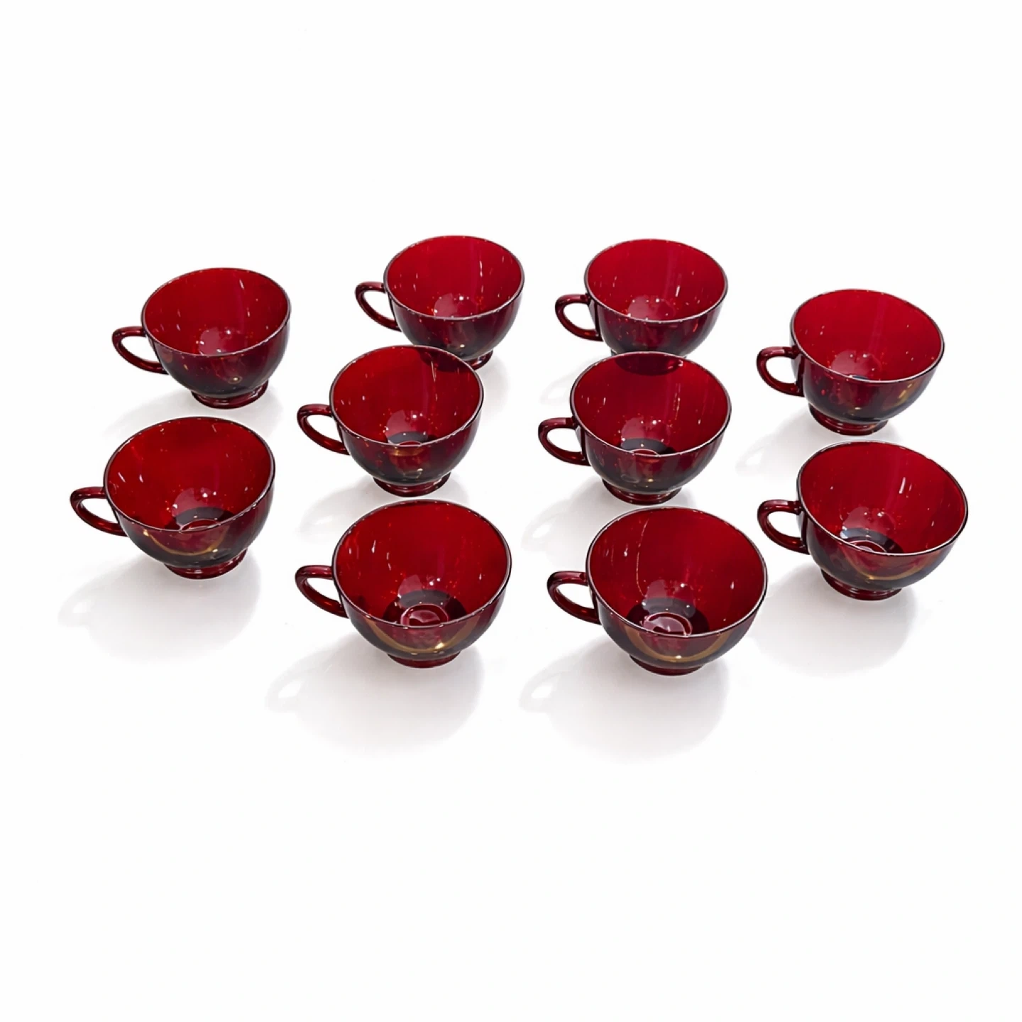Set of 10 Ruby Red Glass Handled Cups, Mid-Century Modern