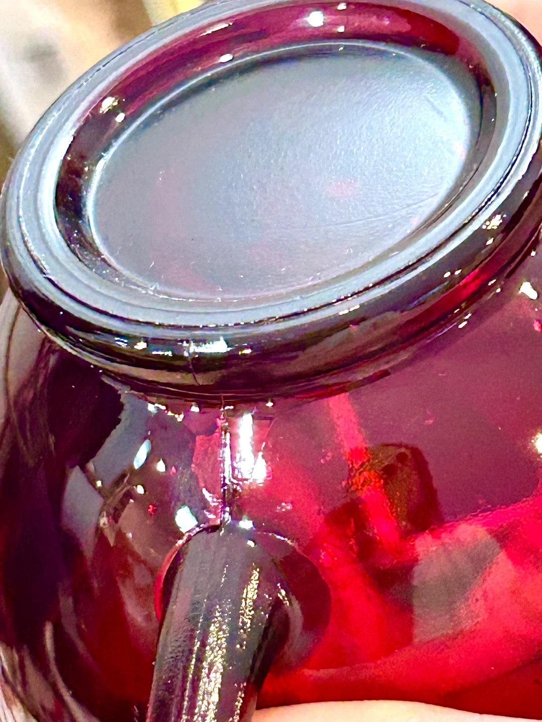 Unmarked examples like this are most commonly associated with American and European mid-century pressed glass production, circa 1950s–1970s. The color, handle profile, and pedestal foot are particularly consistent with mid-century American tableware produced during the postwar boom, when ruby and cranberry glass were widely manufactured for domestic coffee and tea services. While makers such as Anchor Hocking, Libbey, and related continental factories produced similar forms, no definitive maker attribution can be made without a factory mark. The set is therefore listed unattributed, priced on form, color, and condition.