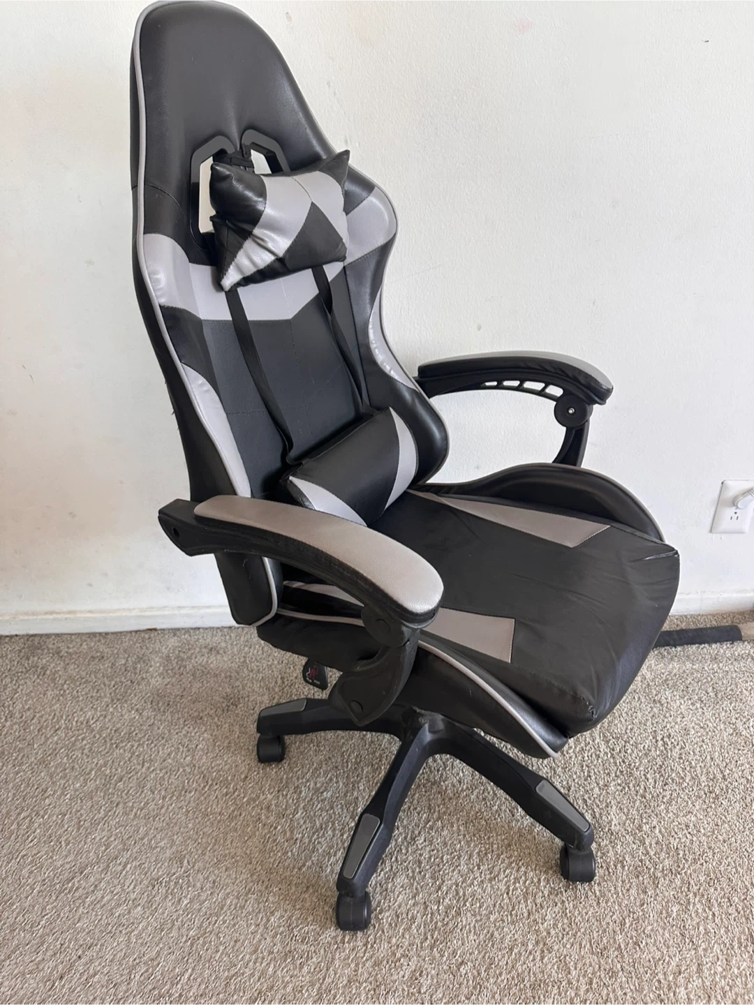 This gaming chair comes in black and gray. It includes adjustable lumbar and headrest pillows. Its racing-style design makes it great for long gaming sessions.