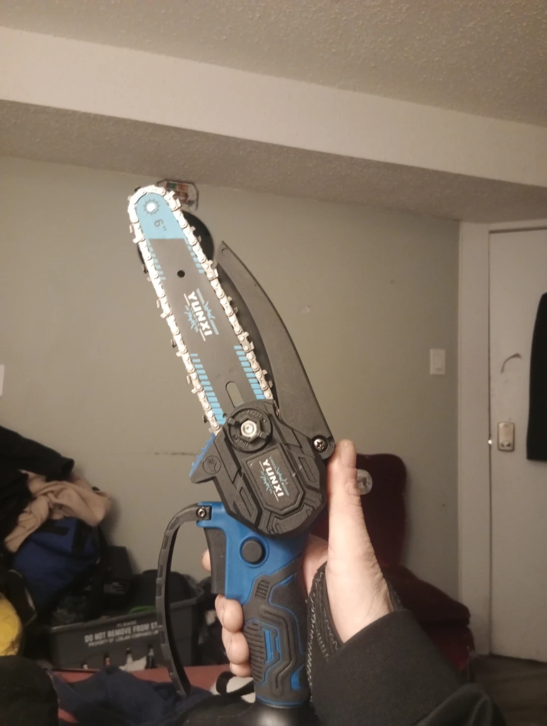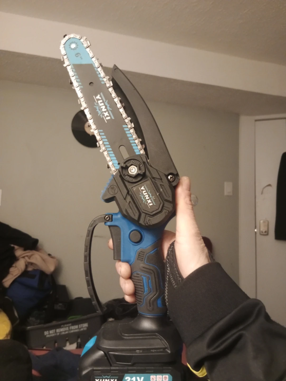 Selling a Yunxi mini chainsaw with a 6-inch blade. It's never been used, I have no idea why I bought this lol