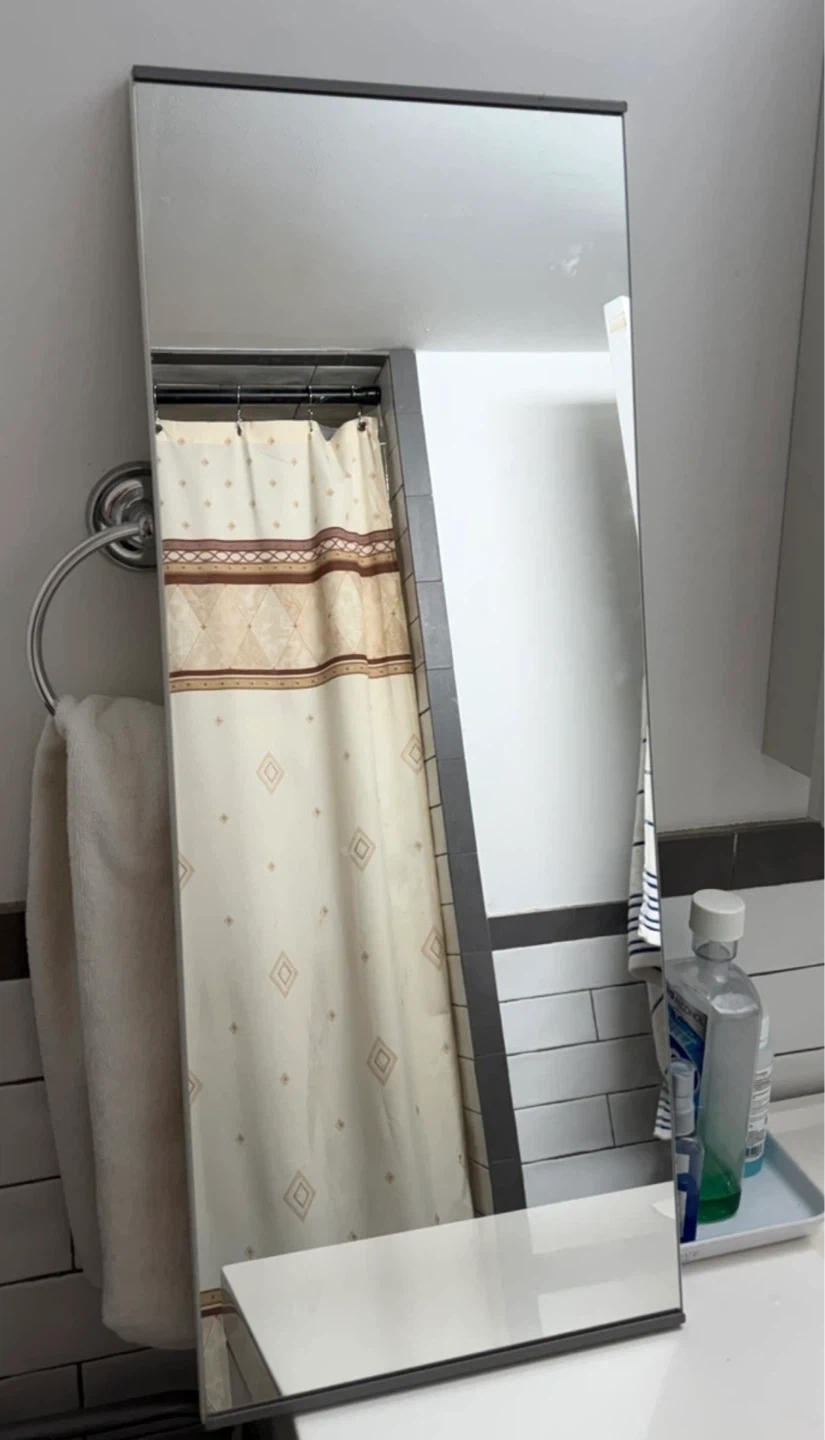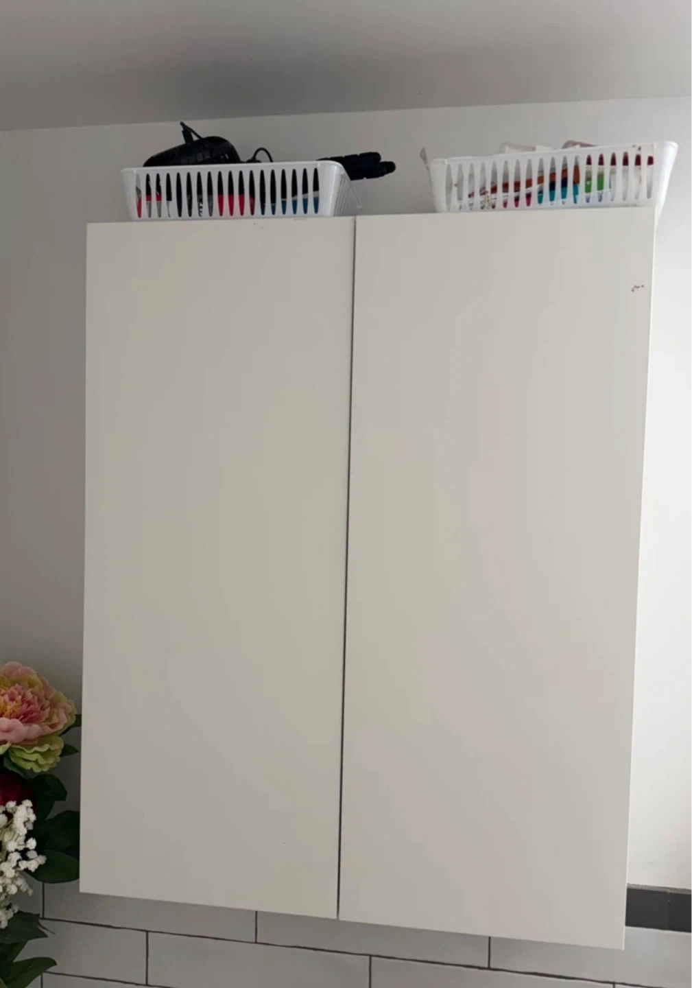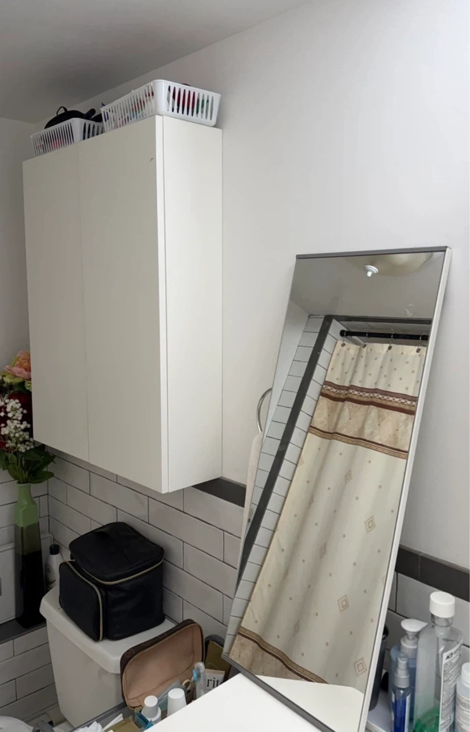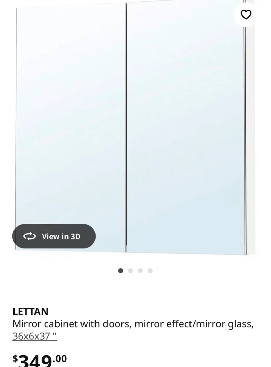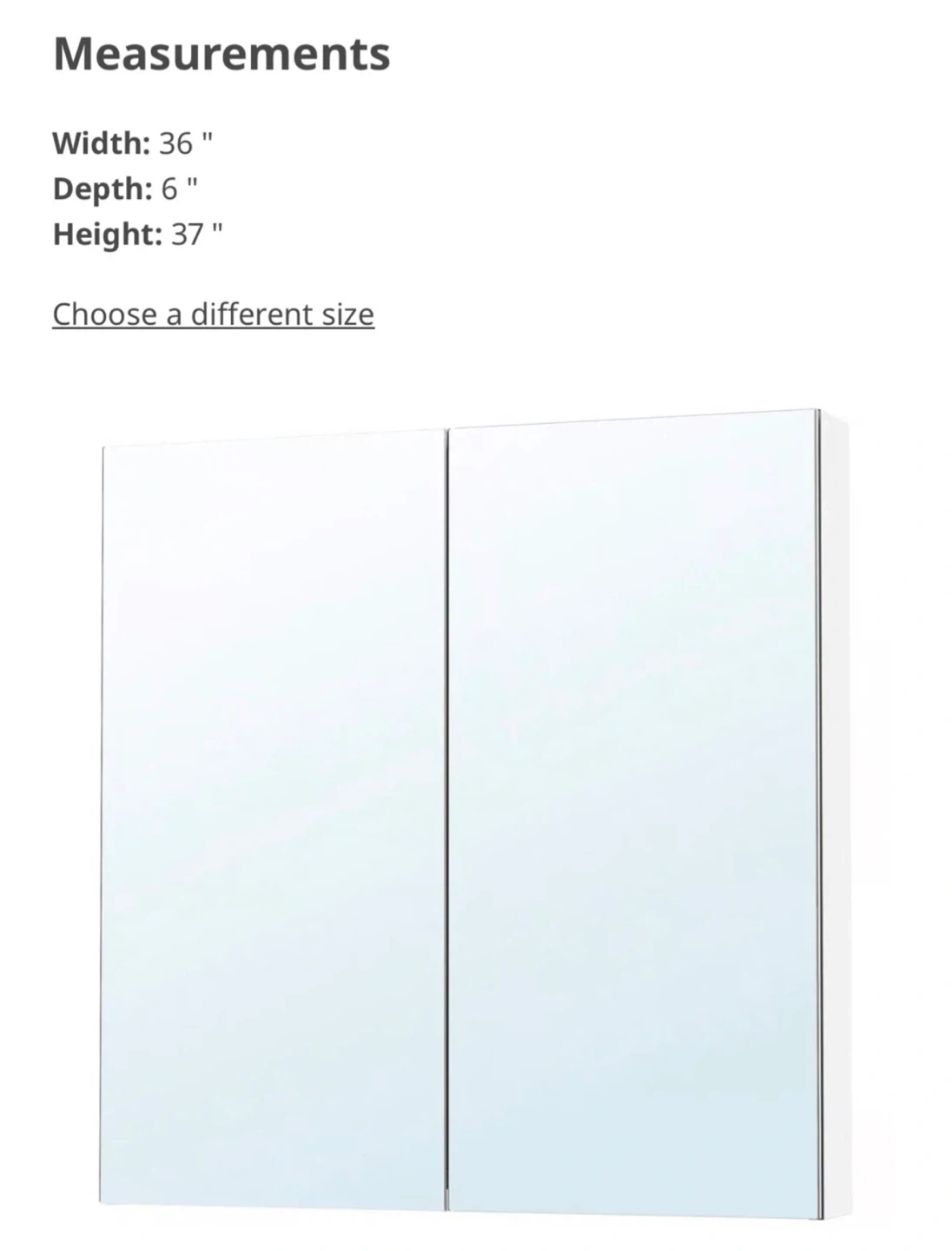 This is the IKEA LETTAN mirror cabinet. It's white and has a mirror effect with mirror glass doors. The dimensions are 36 inches wide, 6 inches deep, and 37 inches high. It's a great storage solution for any bathroom!