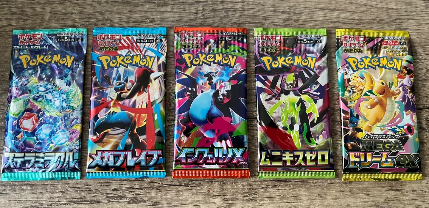 Sealed booster packs purchased directly from the Pokemon Center. Great for collectors! Each pack contains 5 cards; the Mega Dream EX high class pack comes with 10 cards including a guaranteed EX card.