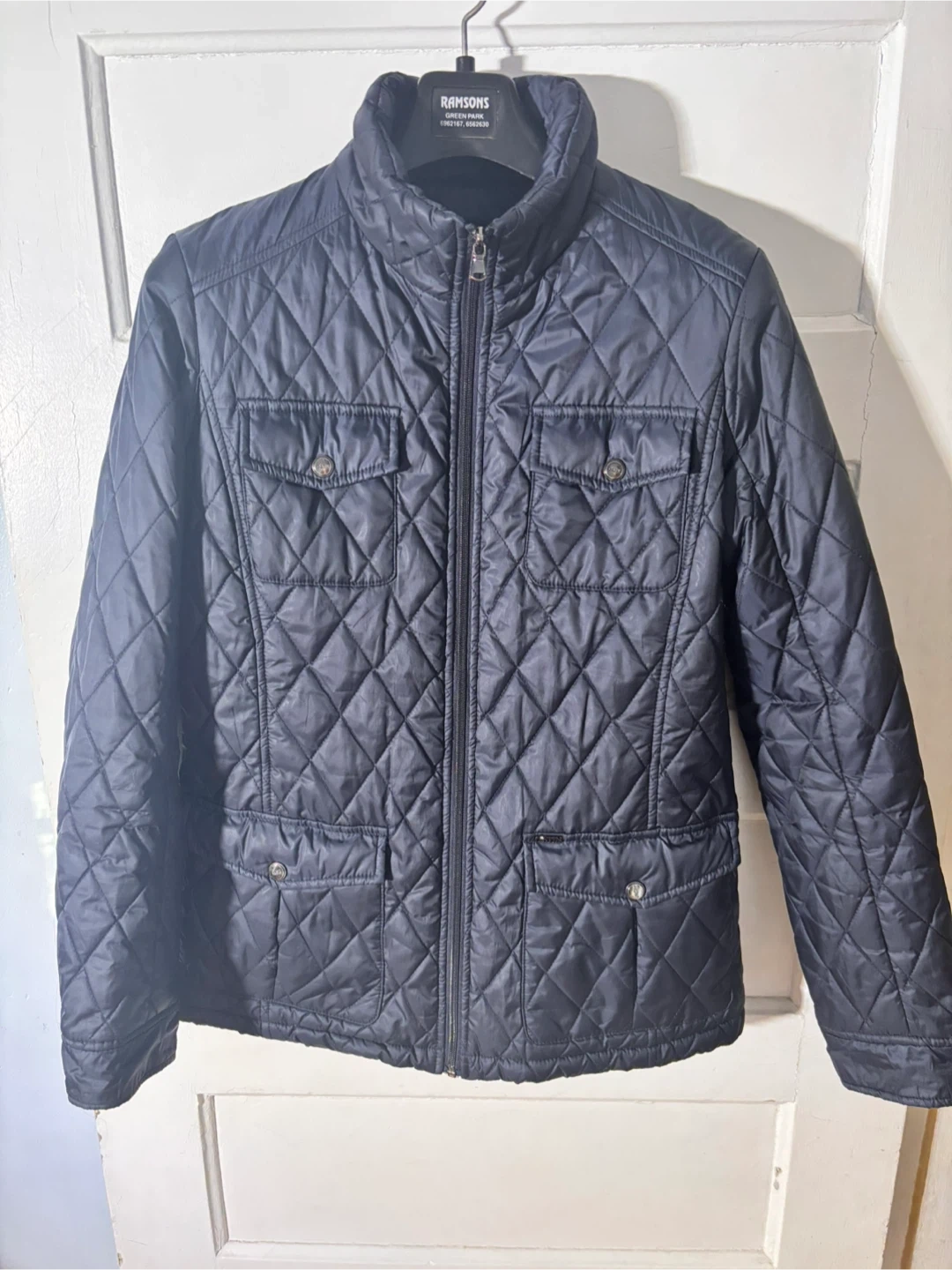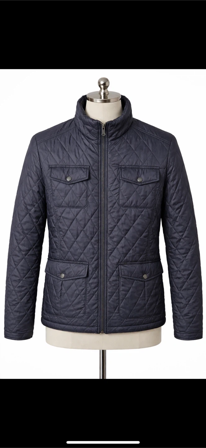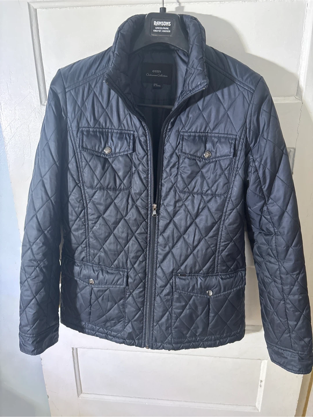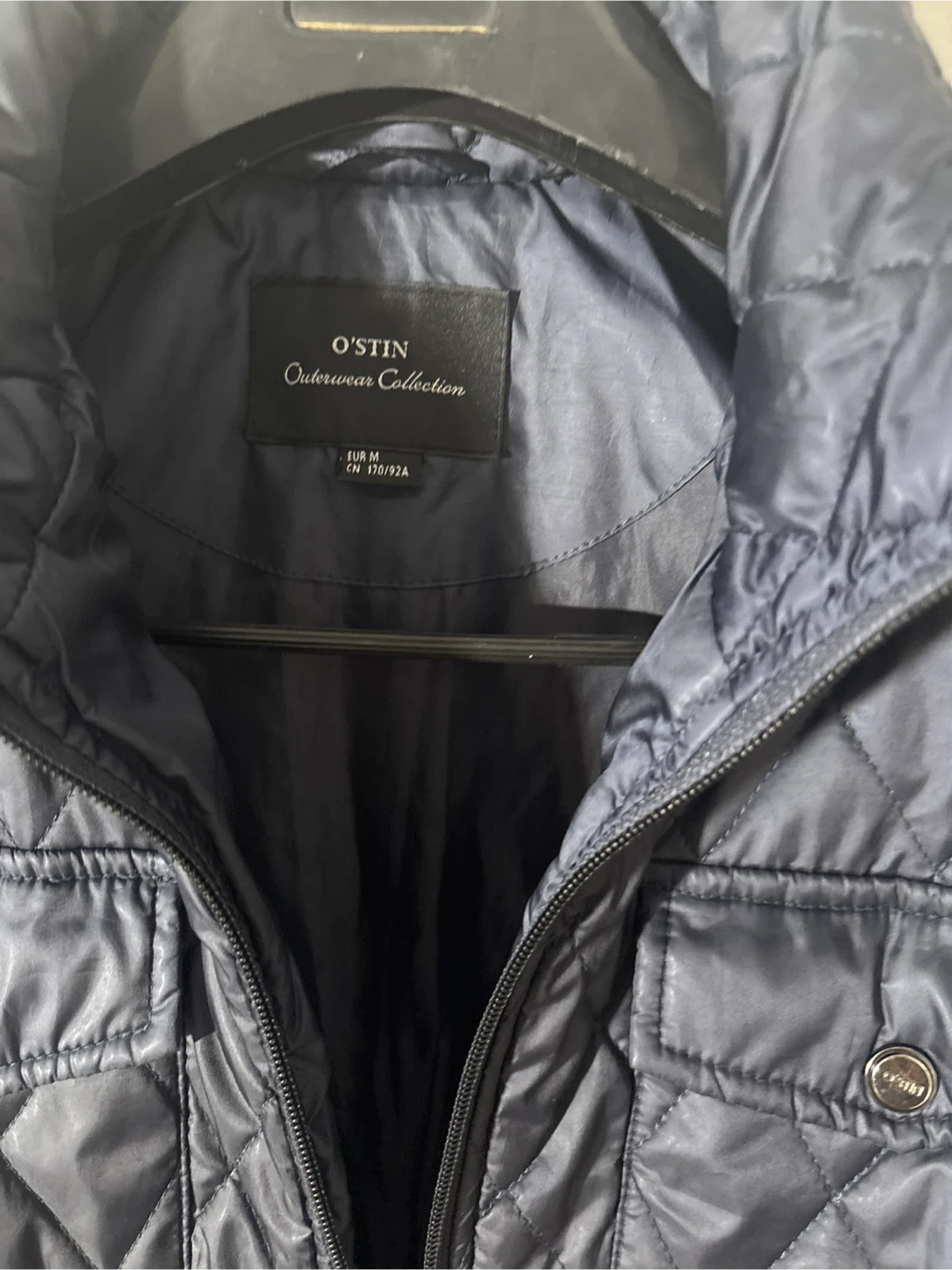 Quilted jacket by O'stin from their Outerwear Collection. Features a zip-up front with two chest pockets and two lower pockets. Material is polyester.