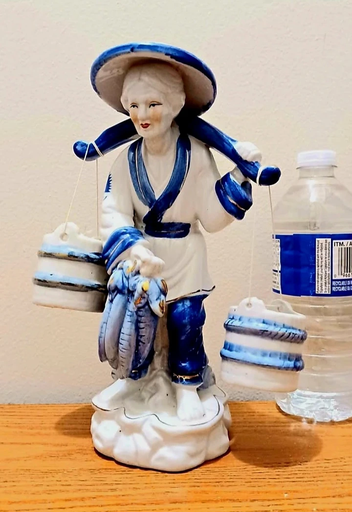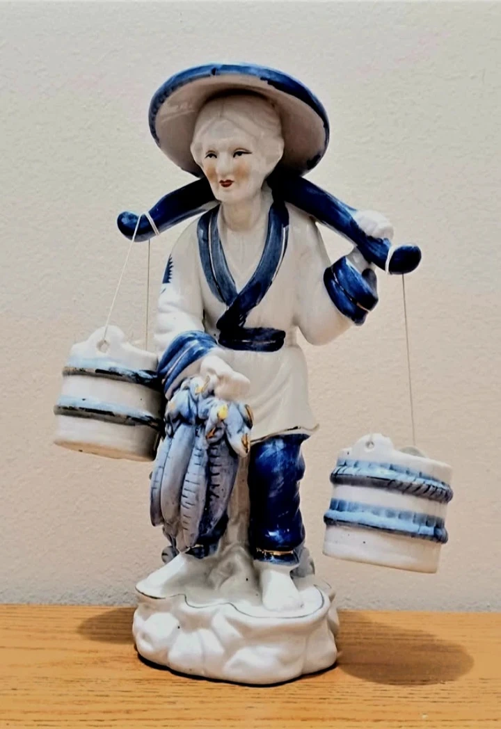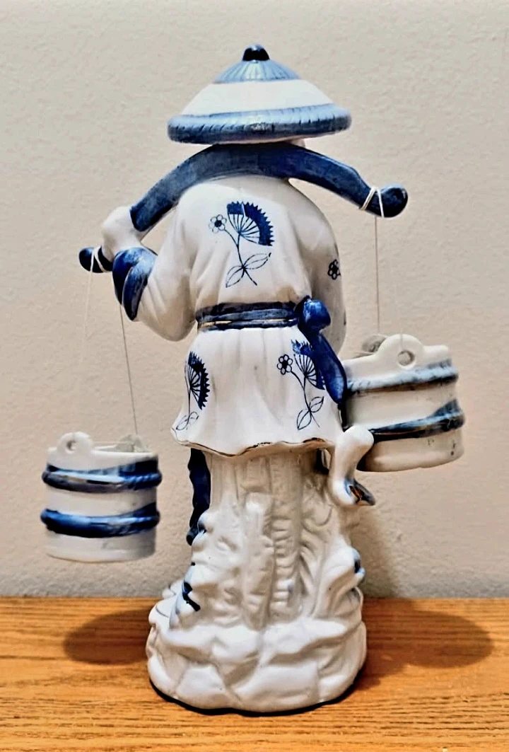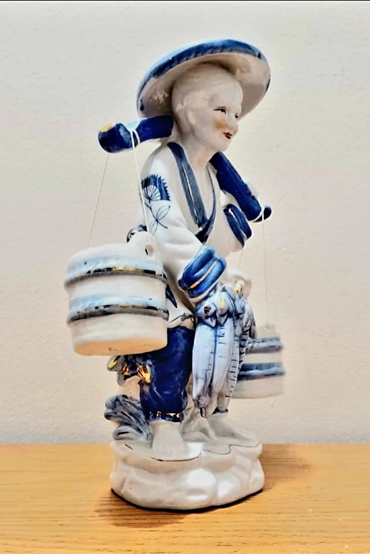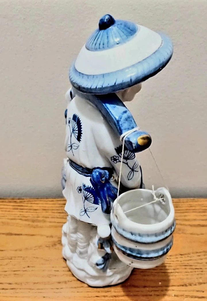 Vintage, Collectible, Decorative Chinoiserie , Hand Painted Statue. Intricate details of a Fisherman wearing a traditional straw hat and carrying buckets on a shoulder yoke . The primary color scheme is cobalt blue and white, with some gold detailing
