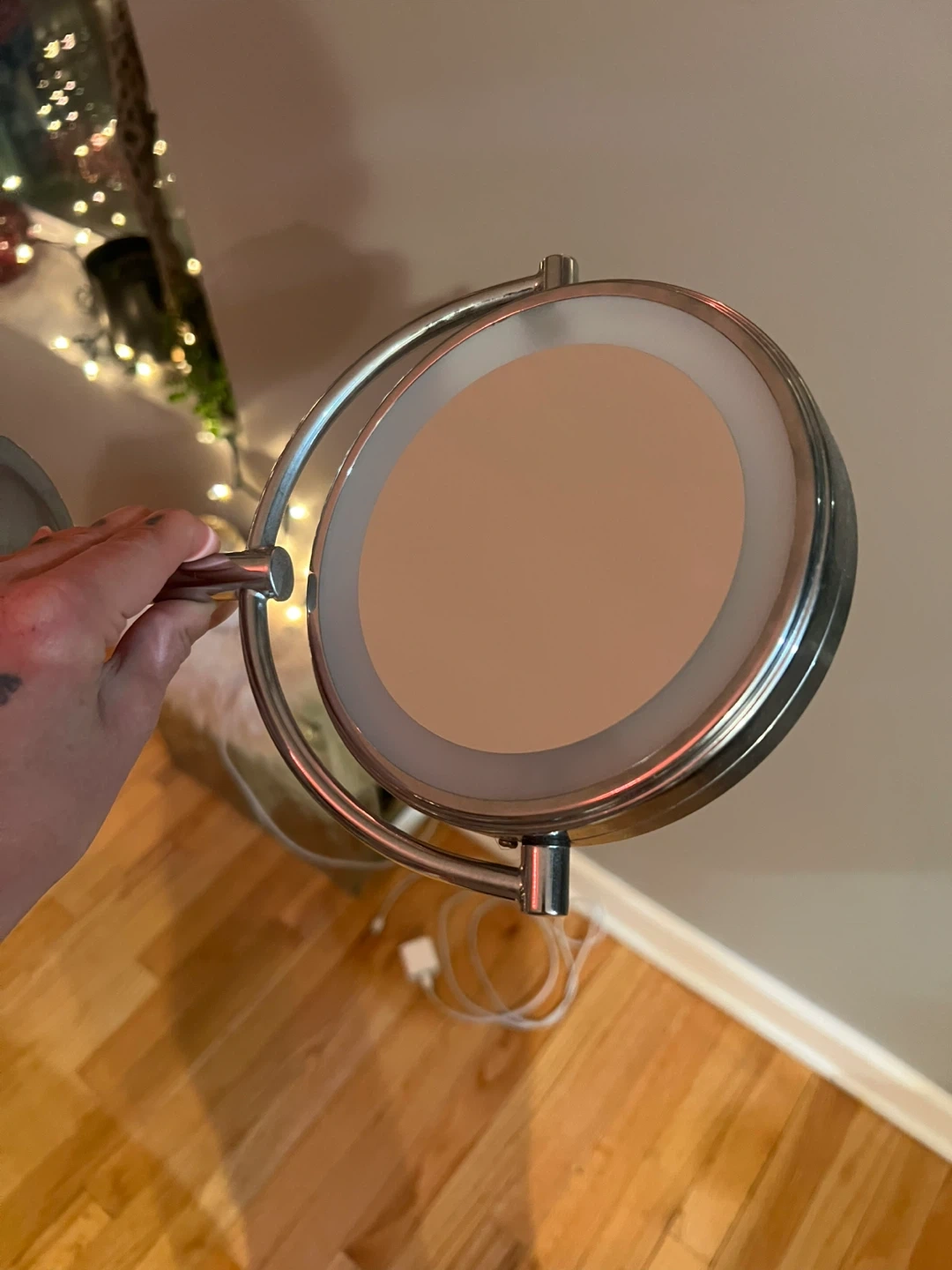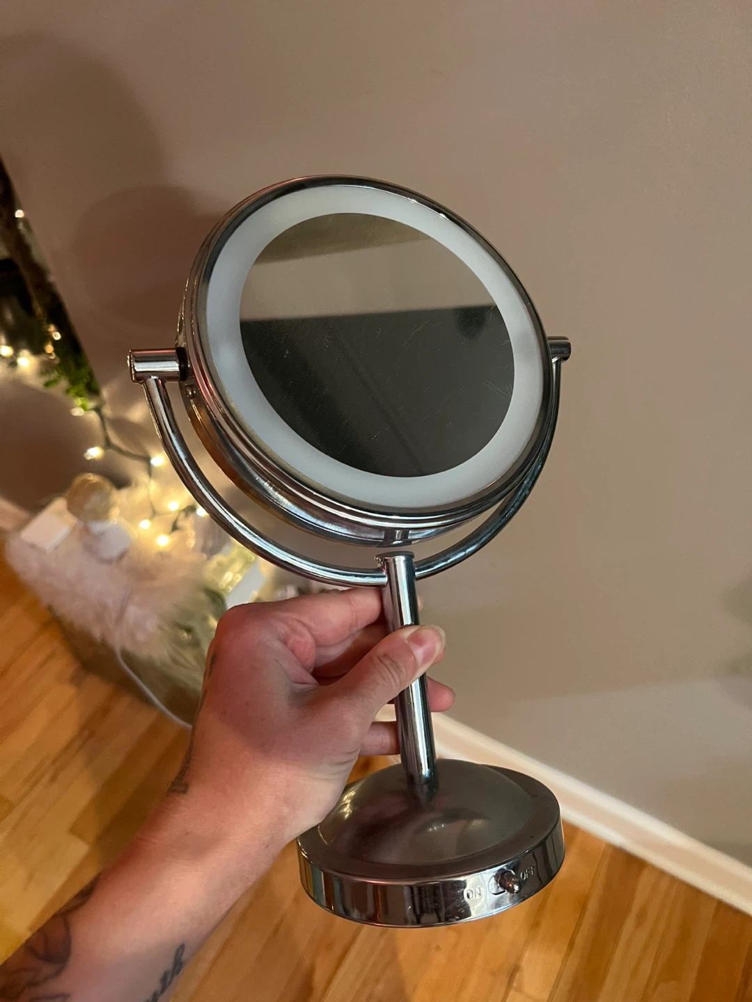 Double-sided vanity mirror with LED lighting. It's a tabletop design with a chrome finish. It's great for makeup application and skincare routines.
