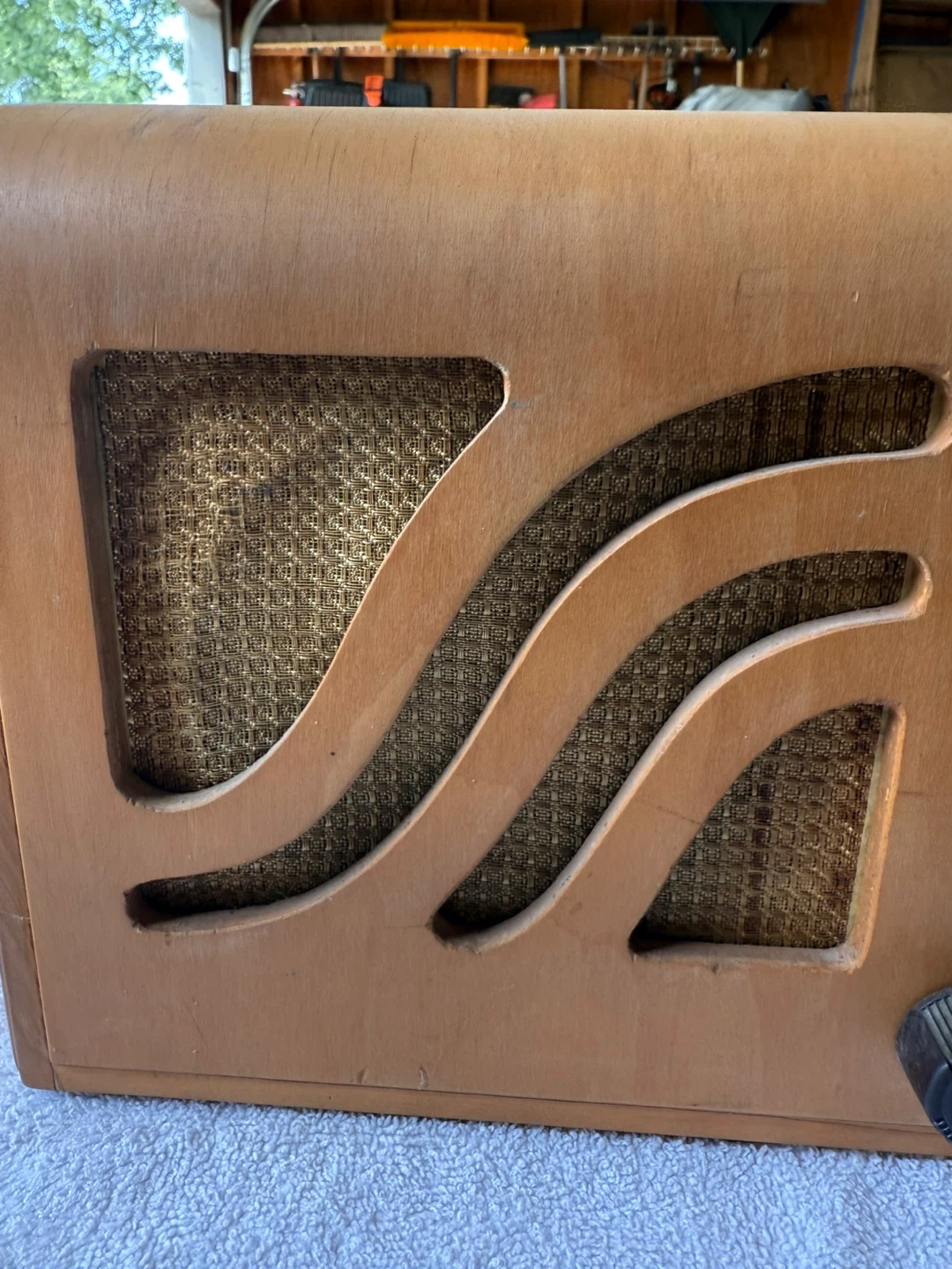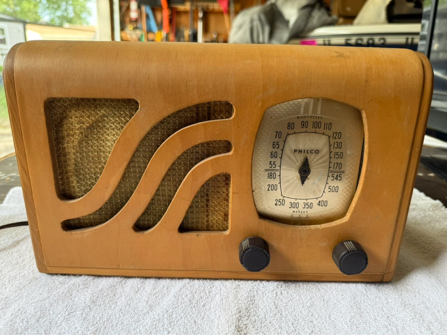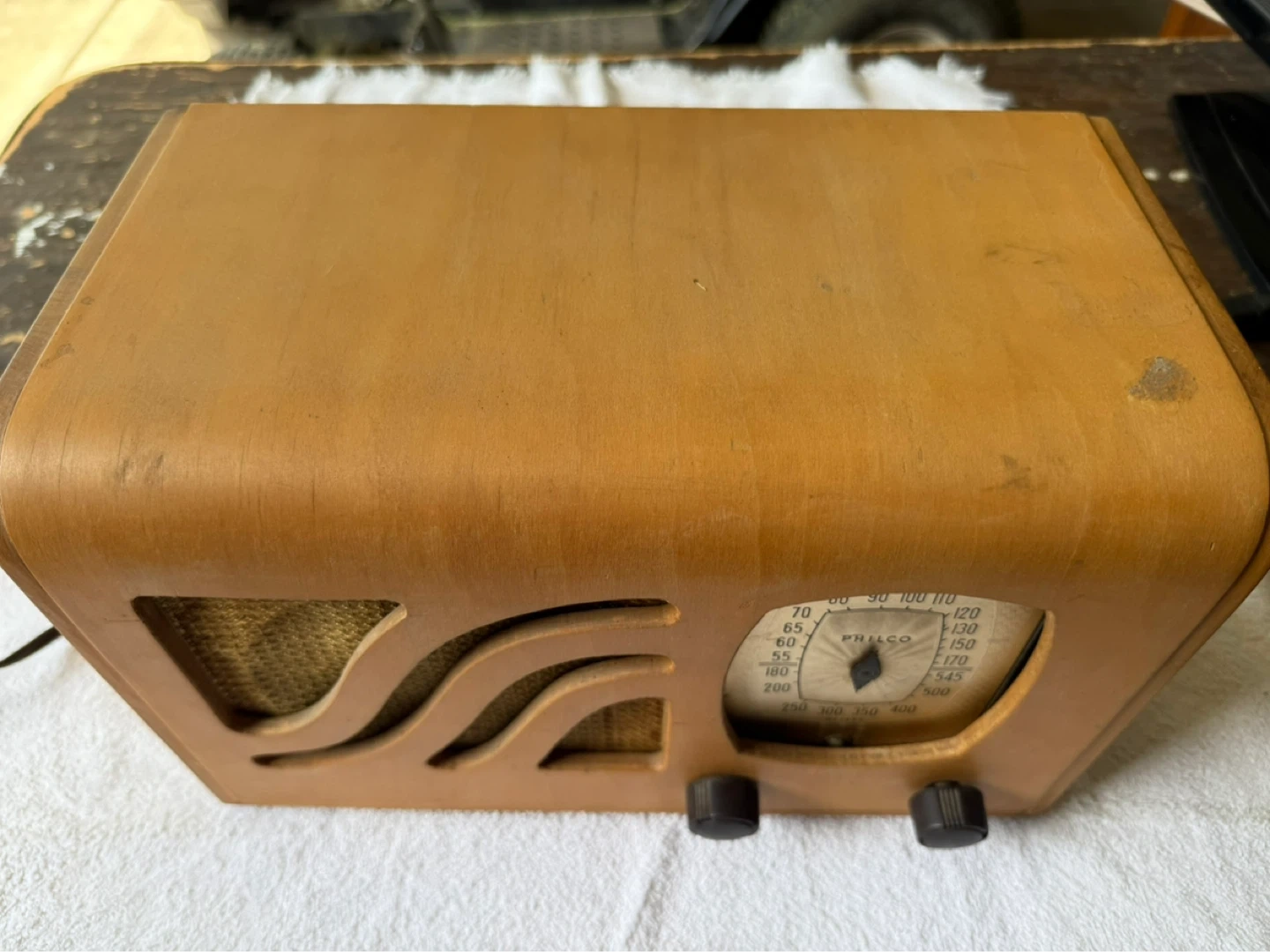 Philco 39-6C tabletop tube radio from the 1939 model year. This model is known for its Art Deco design, featuring a unique "Wave" grill, a walnut cabinet with maple and mahogany inlays, and a large gold dial.