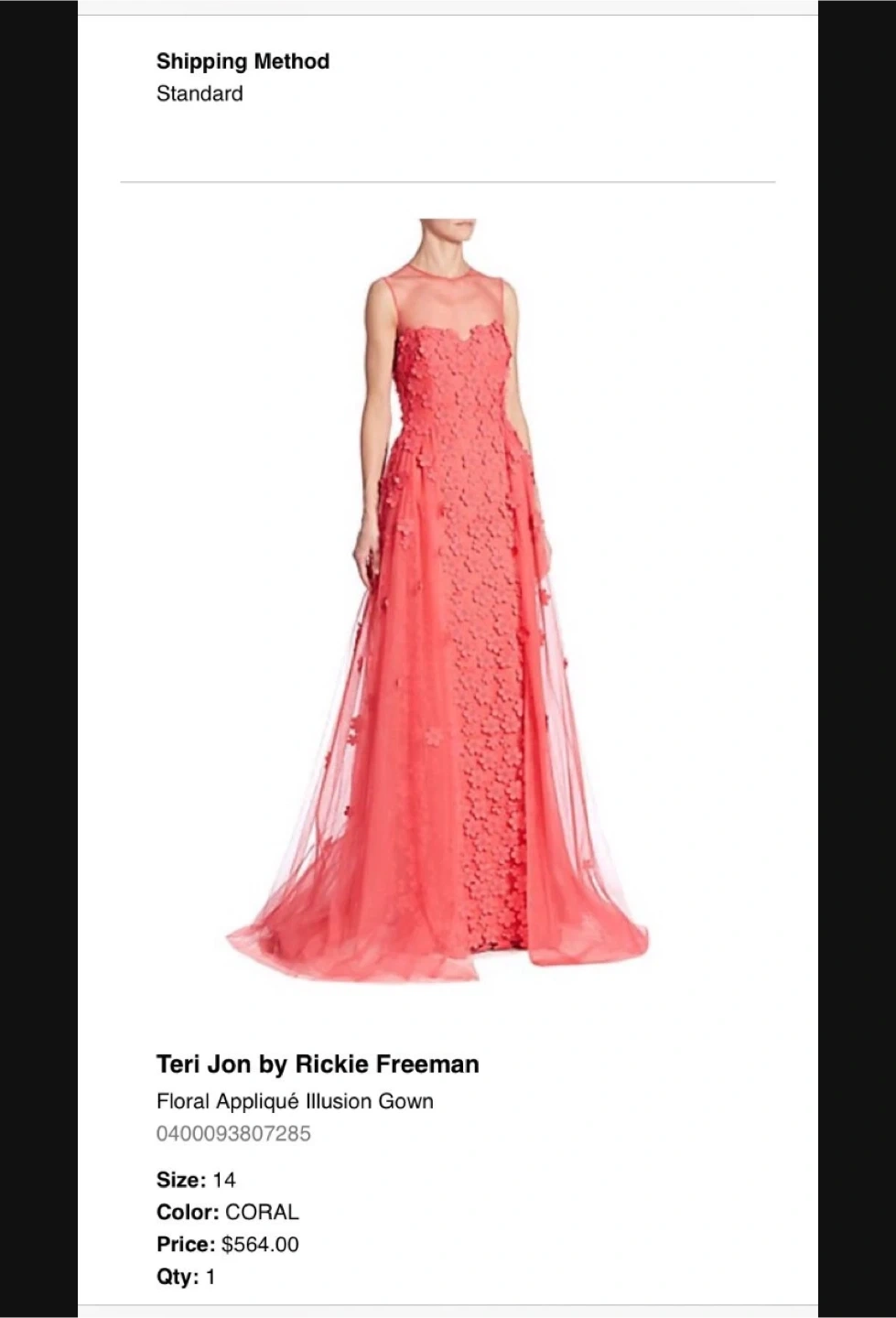 Selling a beautiful Teri Jon by Rickie Freeman Floral Appliqué Illusion Gown! It's a size 14 and comes in a lovely coral color. Originally bought for $564